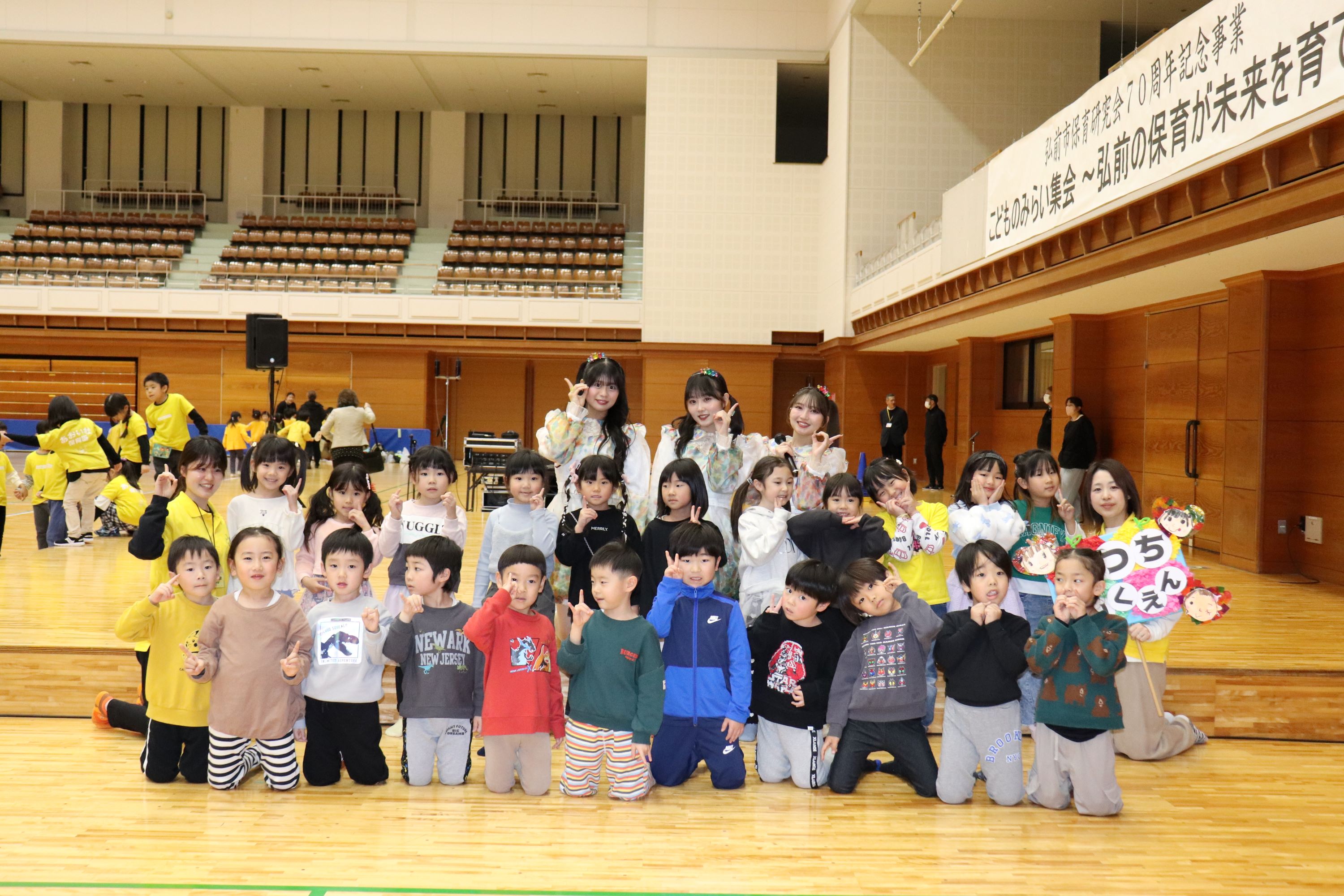 11月18日(火)弘前市保育研究会70周年を記念して県武道館で「こどものみらい集会」が開催されました。市内保育園49施設の年長児と保育士ら約830人が参加。アイドルユニット「りんご娘」のミニライブが行われると聞いて、ぞう組さんは予め曲を聴いたり、プラカードを手作りしてこの日を心待ちにしていたんです。手首にキラキラを付けて、歌に合わせて応援しました。最後はりんご娘と記念撮影。ピンクレディーさん、はつ恋ぐりんさん、金星さんの3人とも子ども達に優しく話し掛けてくれるので、彼女達を見つめる子ども達の目はもう…ハートだらけ(笑)「顔がカワイイ」「爪がキレイだった」としっかり観察してました。将来アイドルになりたい子がきっと増えたことでしょう。