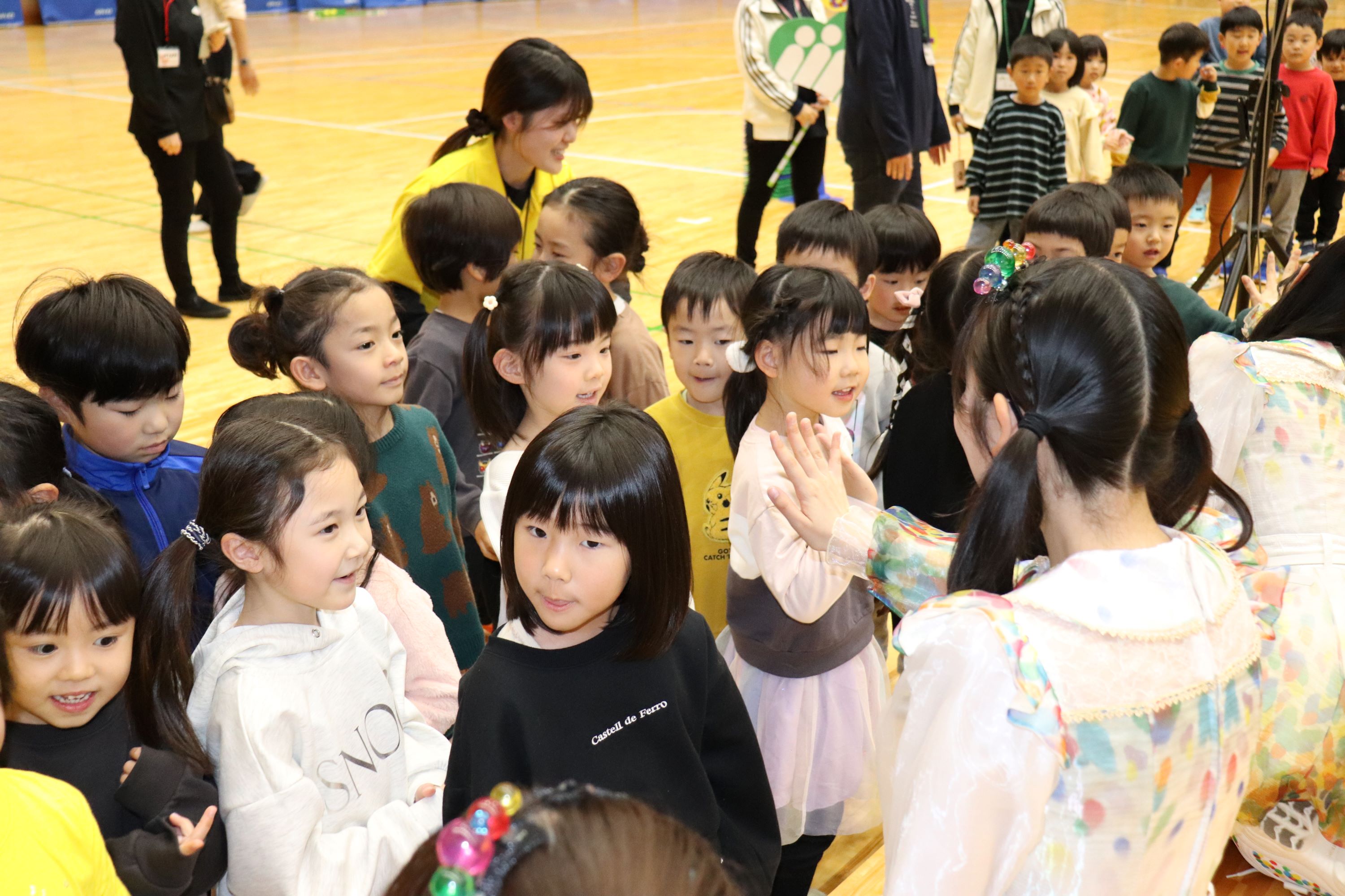 9月18日(木)9月生まれのお誕生会です。どの子も誕生会の日はドキドキ緊張しています。何度経験しても、自分が主役の日…大好きなイベントです。不思議なマジックのパネルシアターを見た後は秋のゲーム大会‼大きなモグラ君を避けて秋の味覚を運ぶ未満児クラス。以上児クラスは「チェチェコリ」の歌に合わせてダンスしながら~の玉入れ。振り付けもすぐに覚えてしまい、腰をクネクネさせるのがとっても上手(拍手)男女別バージョンと紅白対抗戦バージョン、誕生児と職員&実習生バージョン…とすごーく盛り上がりましたよ。本日の給食は、くりデコおにぎり・鶏の唐揚げ・マッシュきのこ・ふわふわ汁・たべっこカラフルゼリーです。いただきまーす。