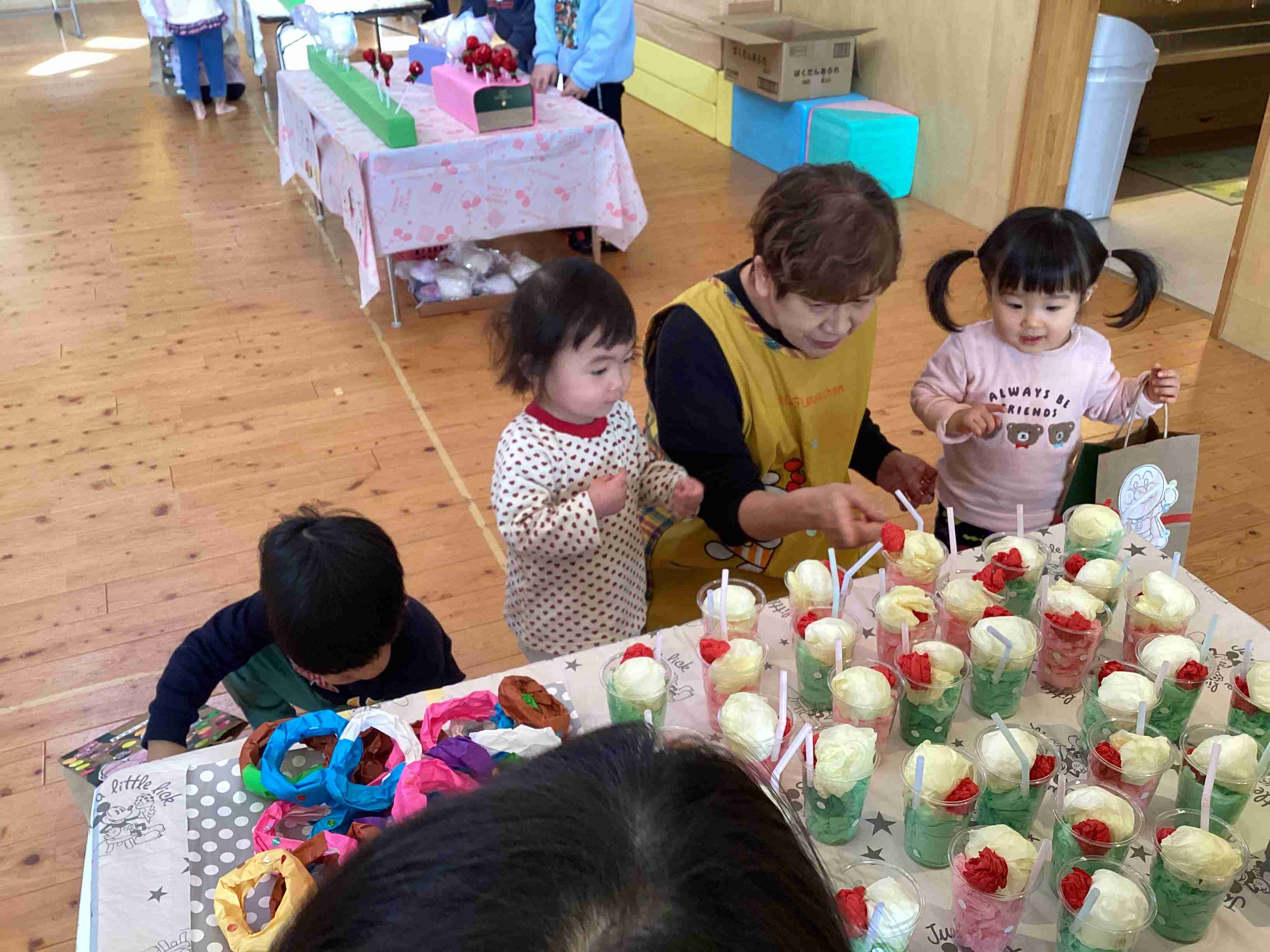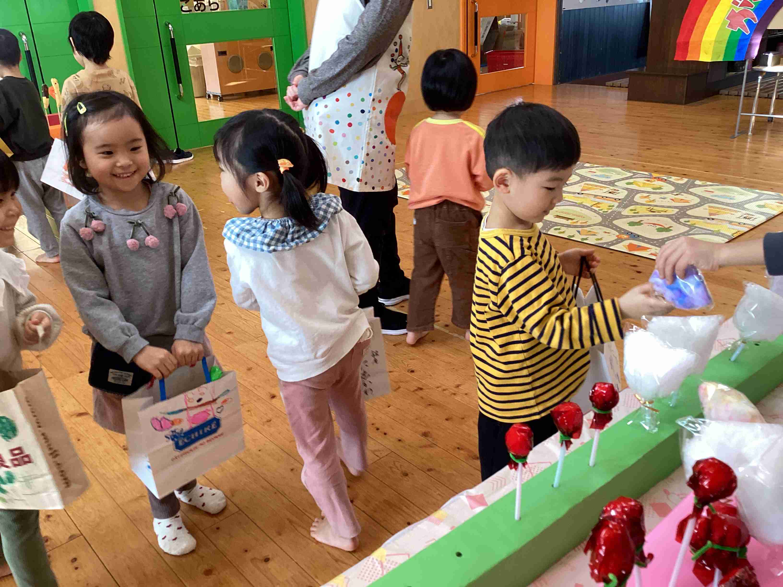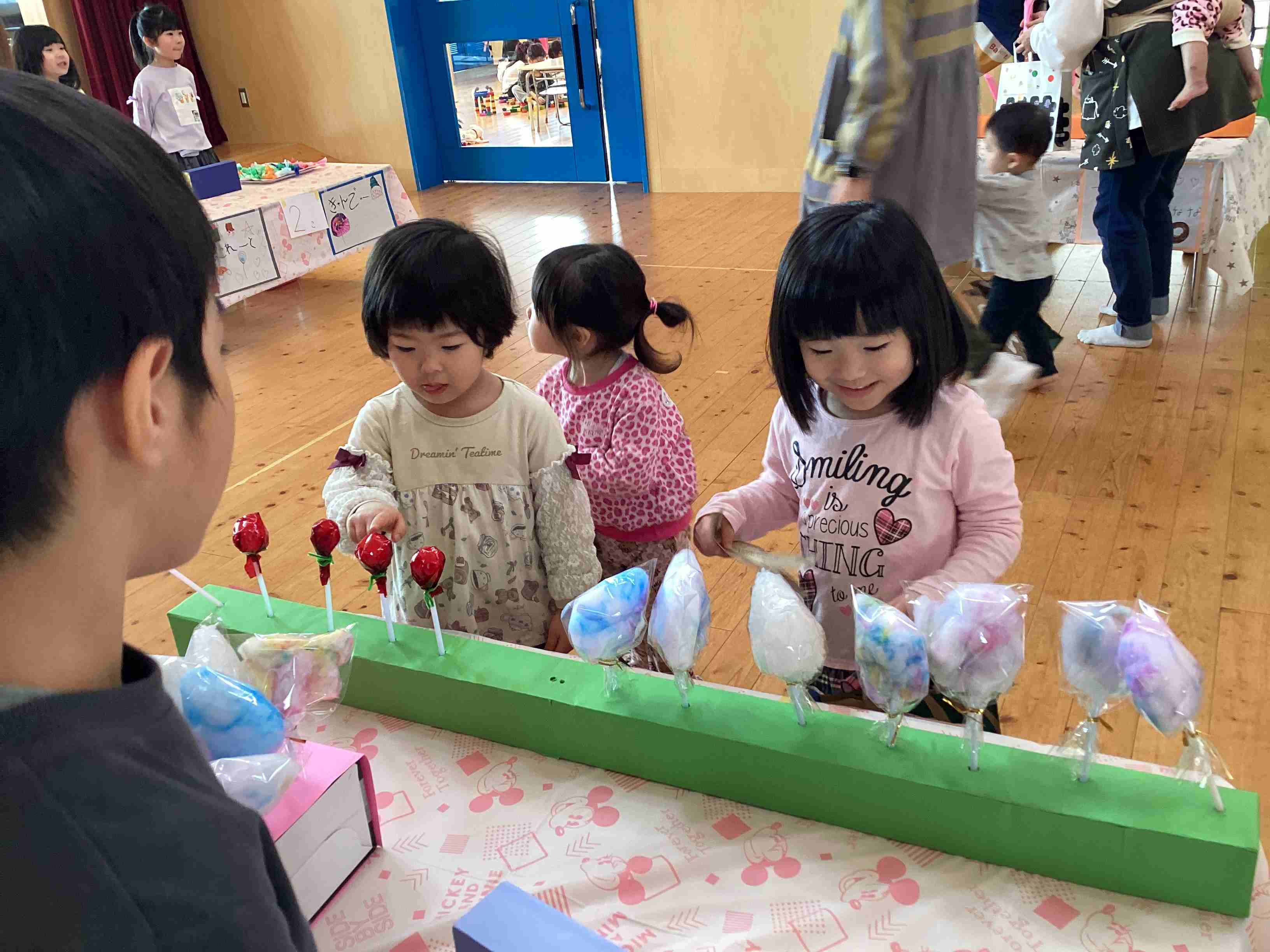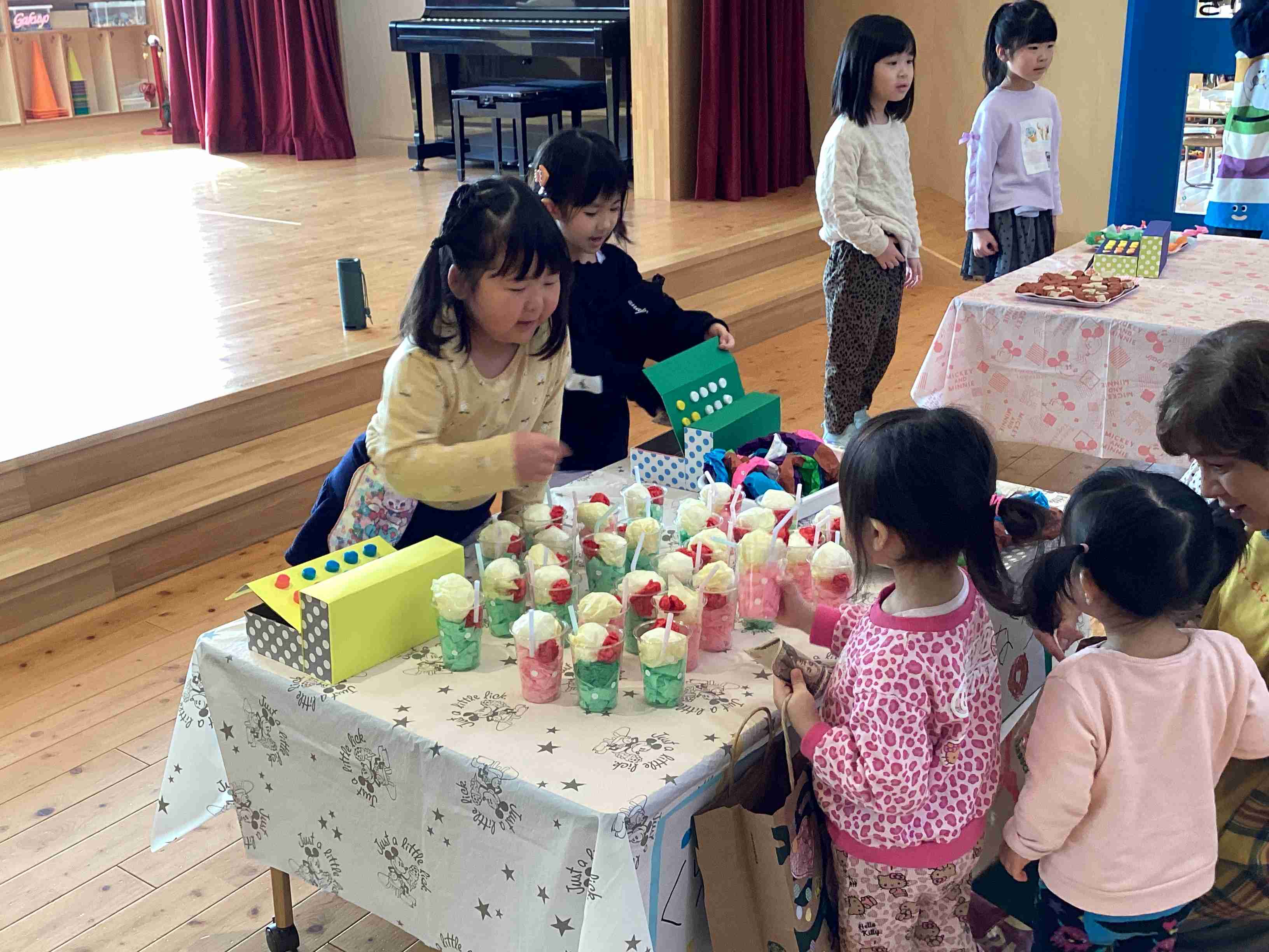 &girlsがスイーツ屋さんを開きたいと話し合い、8種類のスイーツをコツコツ製作しました。♡メロンソーダ♡ドーナツ♡チョコレート♡アイスクリーム♡チョコバナナ♡いちごあめ♡わたあめ♡キャンディー♡ どれもこれもおいしそうですよ!小さい組は銀行でお金をもらって、さっそくお買い物開始・・・ぜ~んぶのスイーツを買うと「どこで食べるの?」という子がいて急遽イートインコーナーを設けてました。本物みたいにちゅ~ちゅ~する子がたくさんいましたよ。