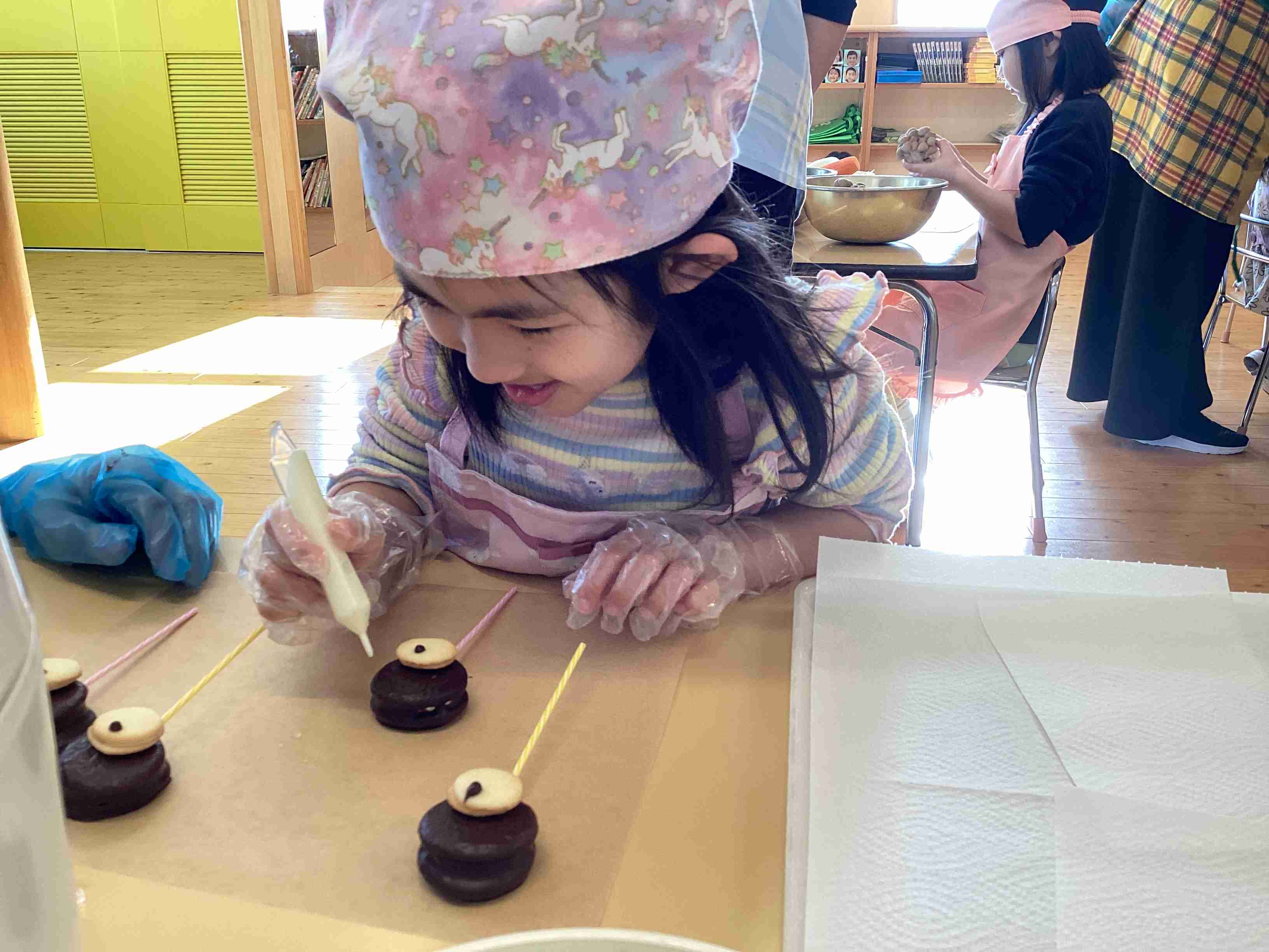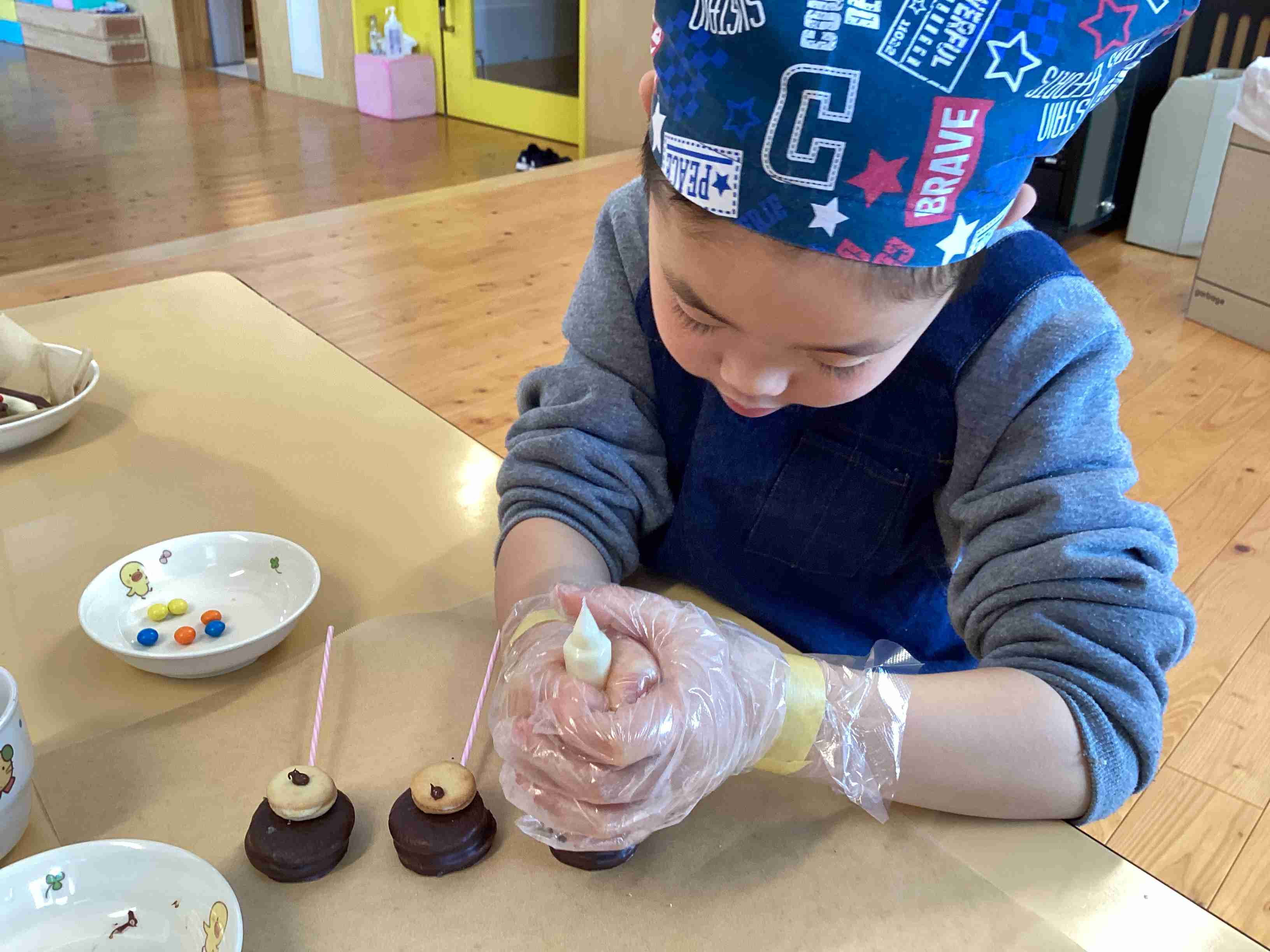 バレンタインデザート作り♥♥♥ チョコパイをデコレーション、お家の方の分も「いつもありがとうの思いを込めて」ラブリー?くまちゃんできあがり~!