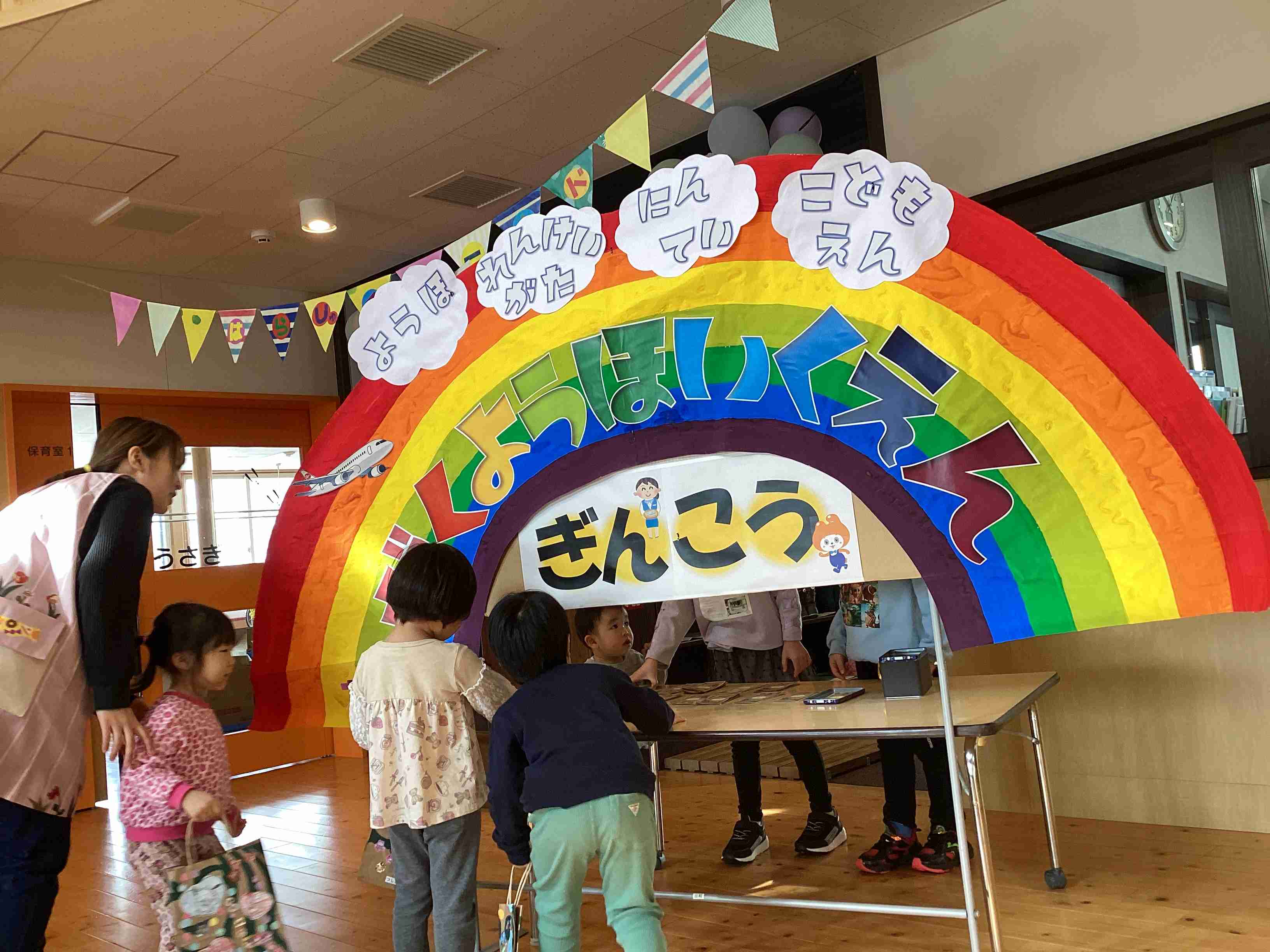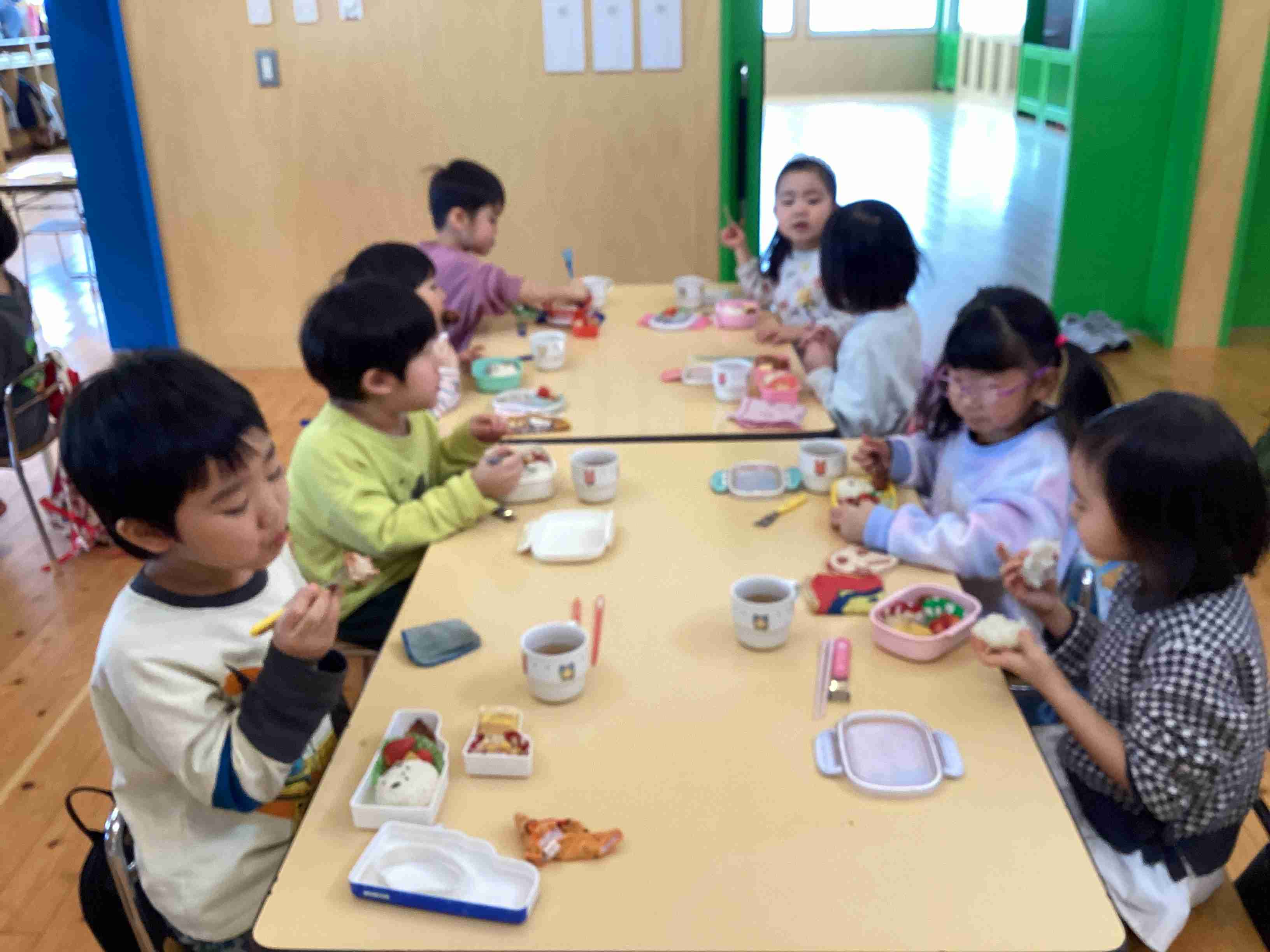 11月19日(水) 11月生まれの誕生会です。ウサ耳を付けた誕生児2人が、赤ピクミンにエスコートされて入場し紹介されました。恒例のインタビューをちょっぴり恥ずかしがりながらも笑顔で答えました。次にお待ちかねの「マジックショー」は、昭和感たっぷりの「種も仕掛けも」あるマジックを披露し大盛り上がりでした。スリルたっぷりのゲームは大小さまざまな円錐スポンジを高く積み上げるゲームです。ゆらゆら・グラグラしながら高く高くをめざした積み上げました・・・が!途中で何度も倒れます。でも諦めずに次の子にタッチしみんなが協力して楽しみました。 給食メニュー:アンパンマンおにぎり・チーズハンバーグ・かぼちゃサラダ・春雨スープ・りんごのババロア
