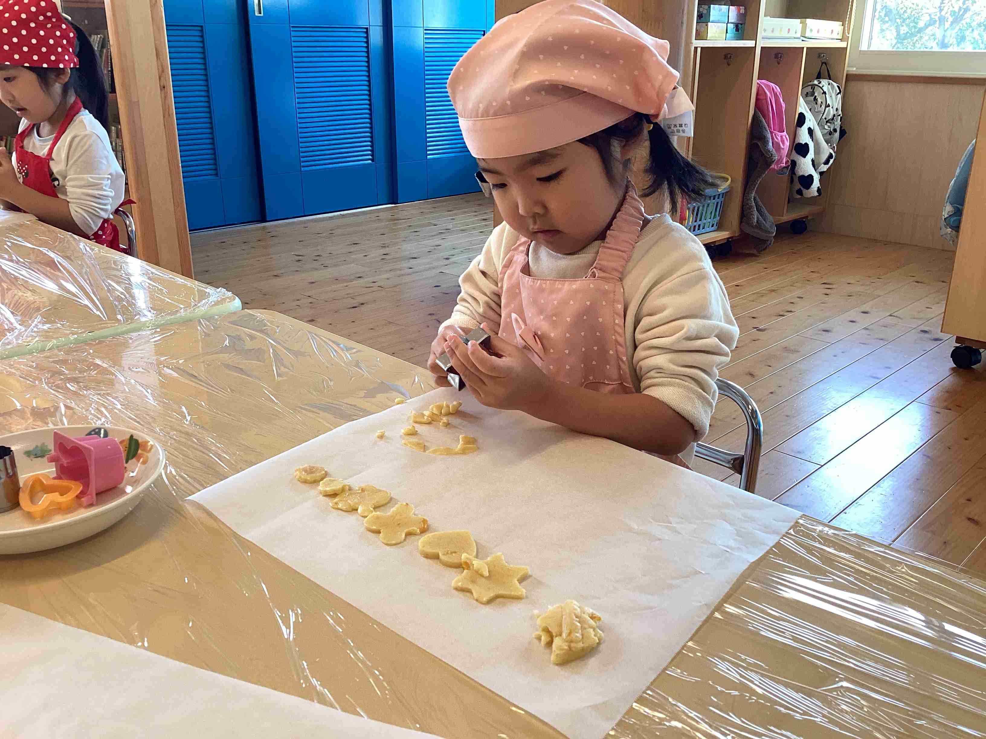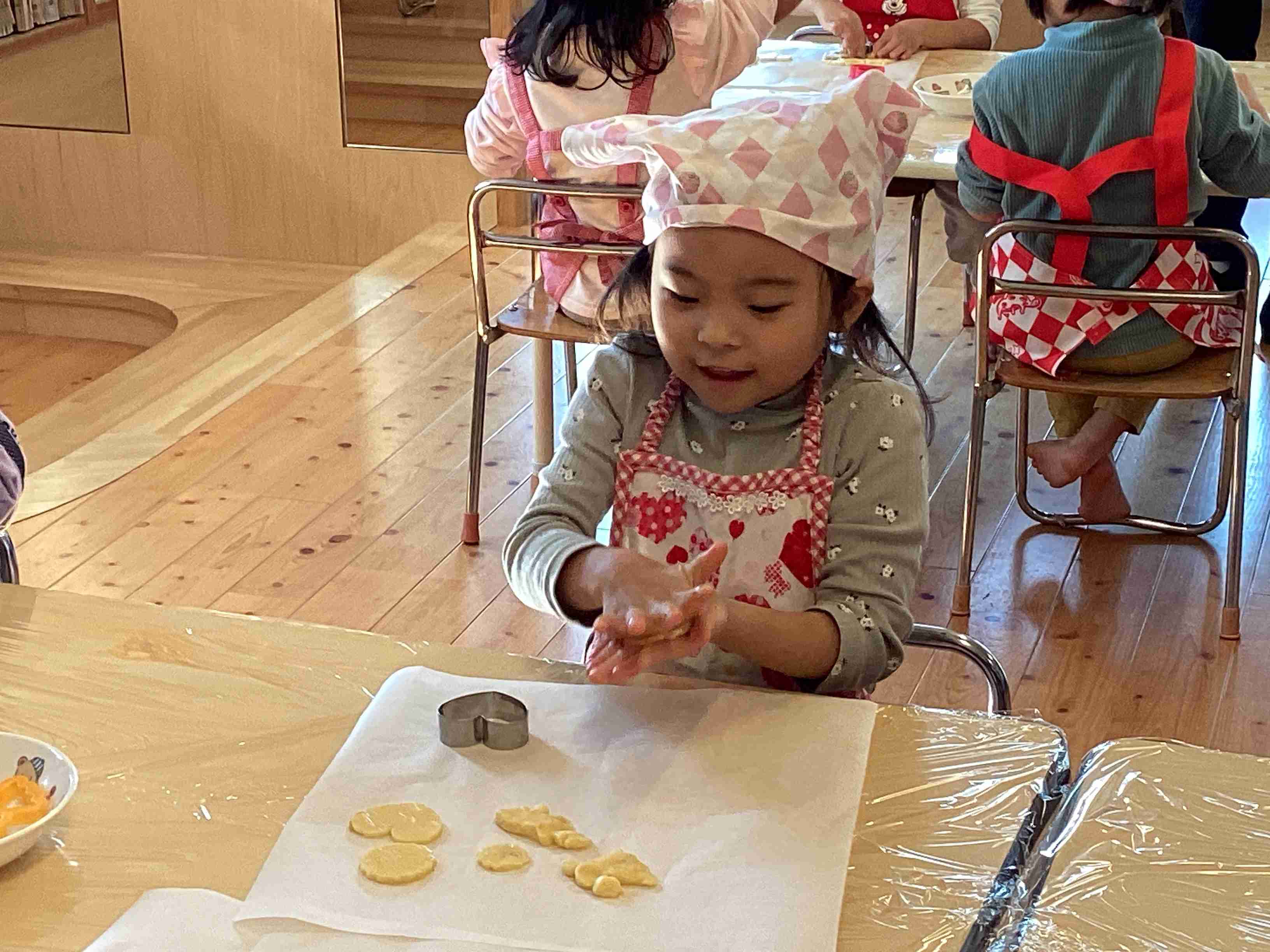 10月30日(木)きりん・ぱんだ組のクッキング・・・収穫したかぼちゃを入れた特製クッキーを作りました。生地の型抜きが一番楽しいと言いながら、何種類もの型を使って量産体制! それを給食の先生に焼いてもらい、午後からはチョコペンで落書きも楽しみ、オリジナルかぼちゃクッキーの完成・・・からの「いただきます!」で「ちょっと、固いな・・・」と言いながら食べました。