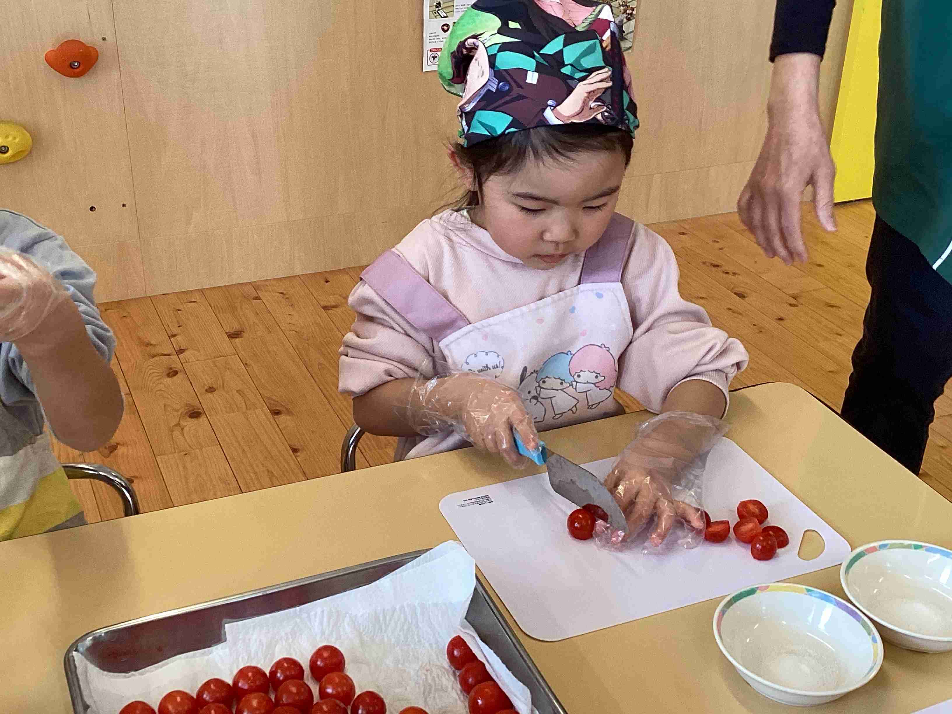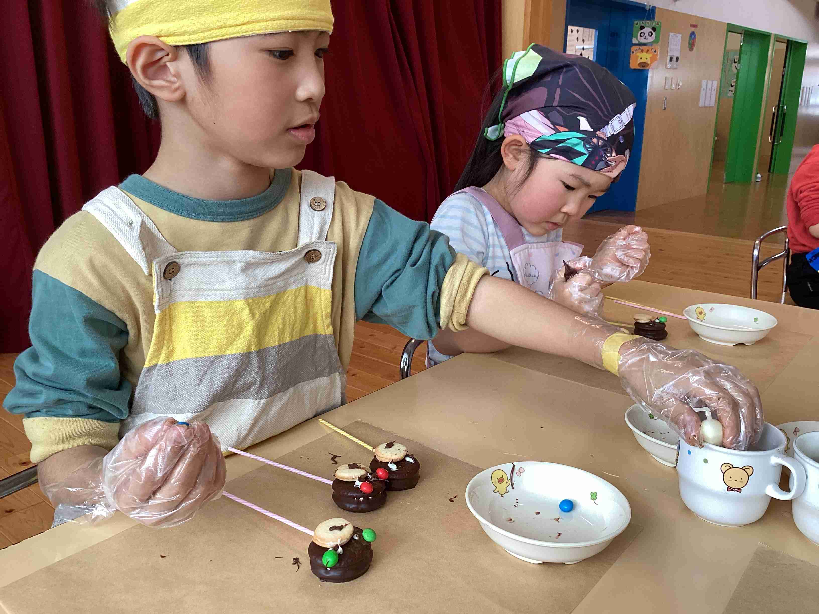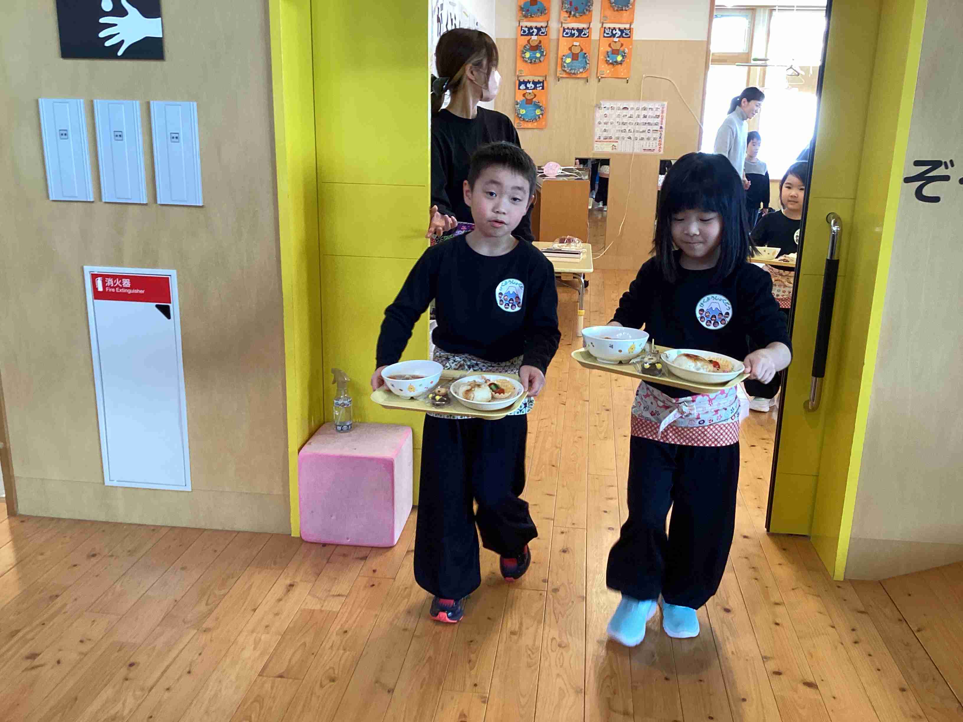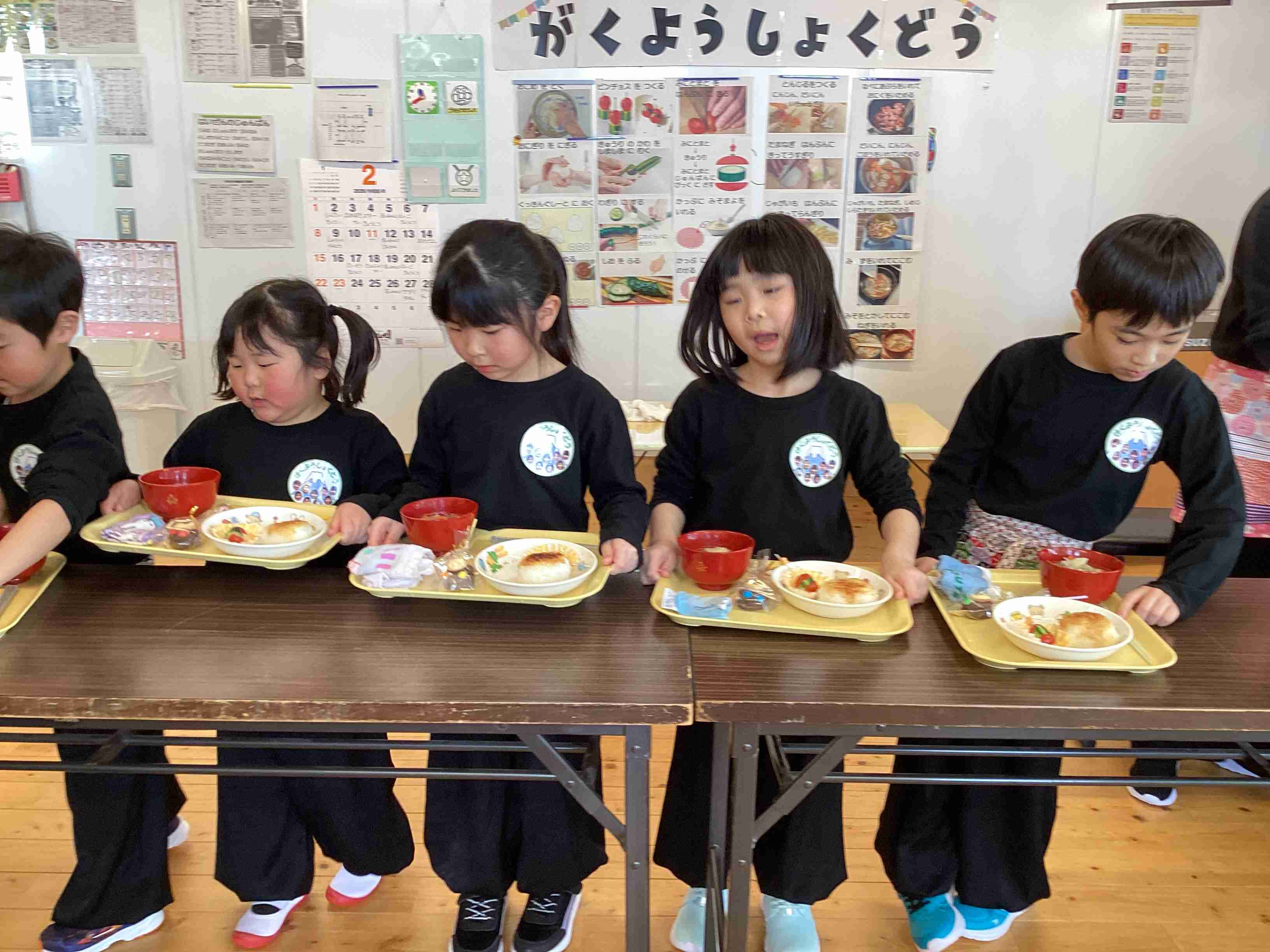2月14日(土) バレンタインデーの今日、ぞう組は6月に仕込んだ味噌を使って「焼きおにぎり」「豚汁」「野菜のピンチョス」そして「バレンタインデザート」を作り、お家の方を招待し給食を食べていただきました。前日のデザート作りから始まり、米研ぎ、食材カット、味付け・・・などを行ない「食堂」を開店し、おもてなしをしました。保護者の方にもとても喜んでいただき、大成功でした。
