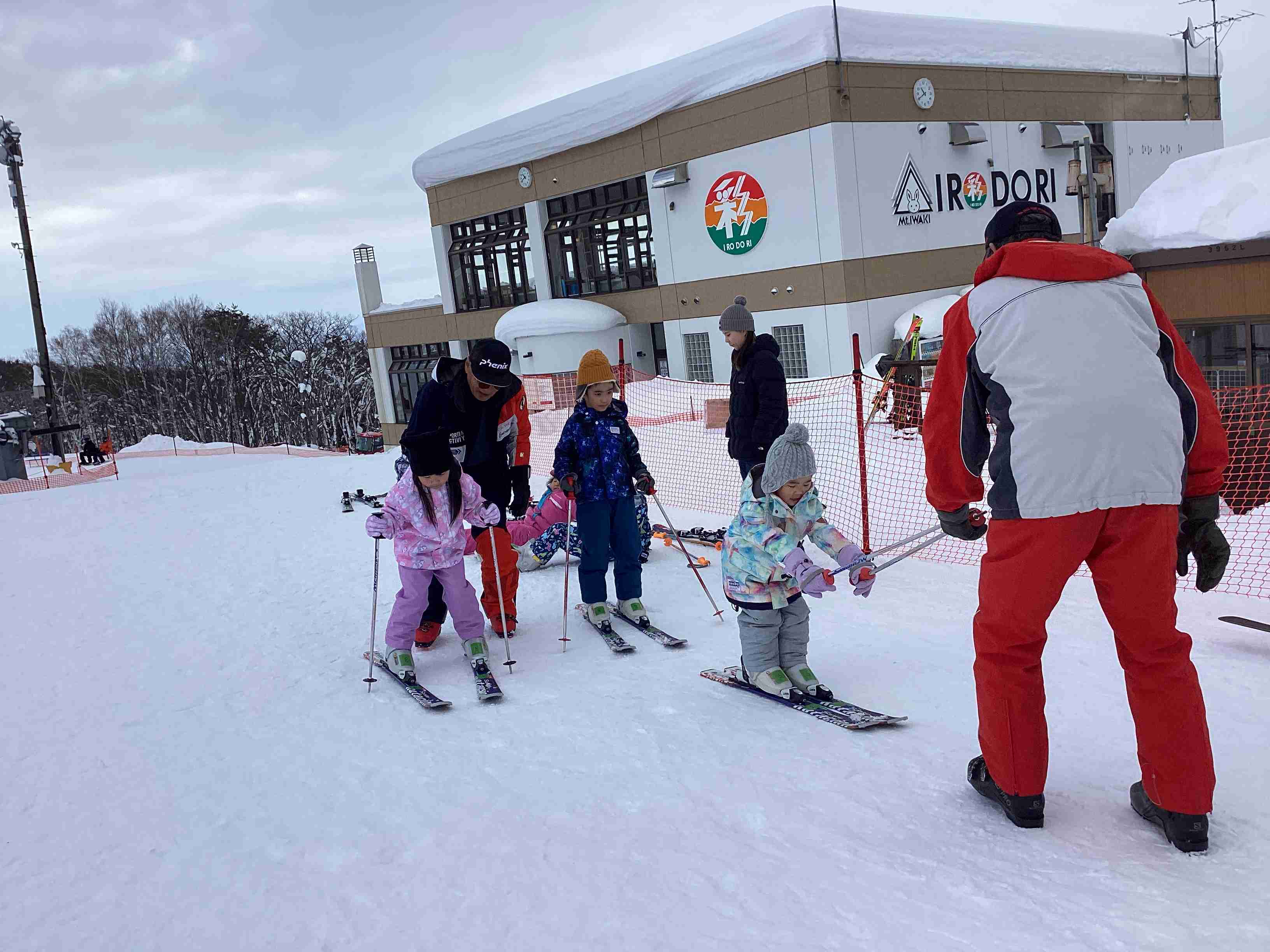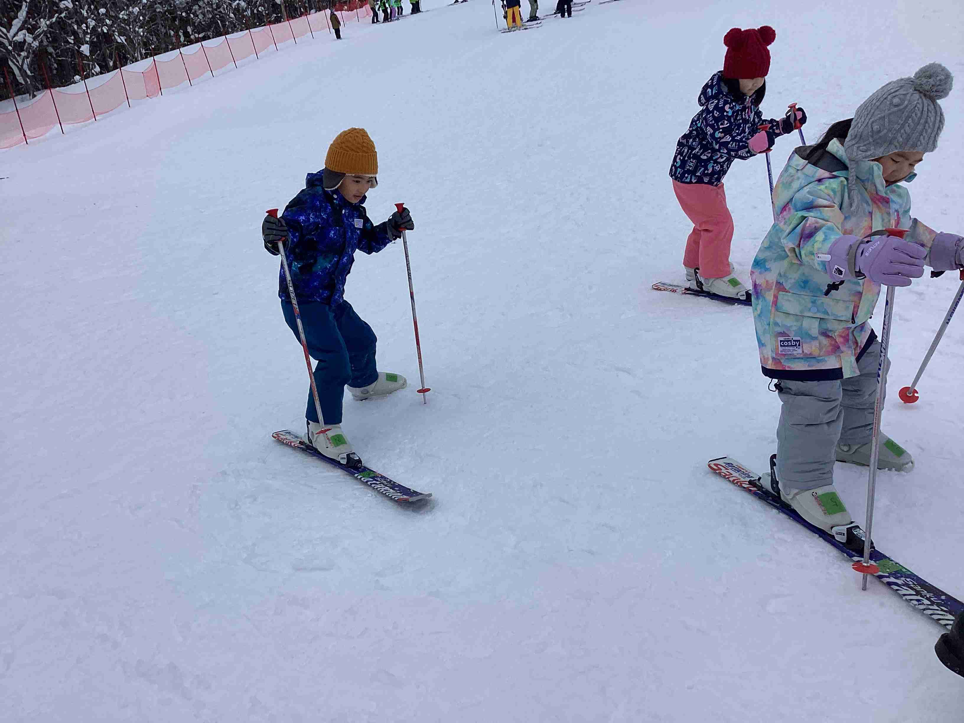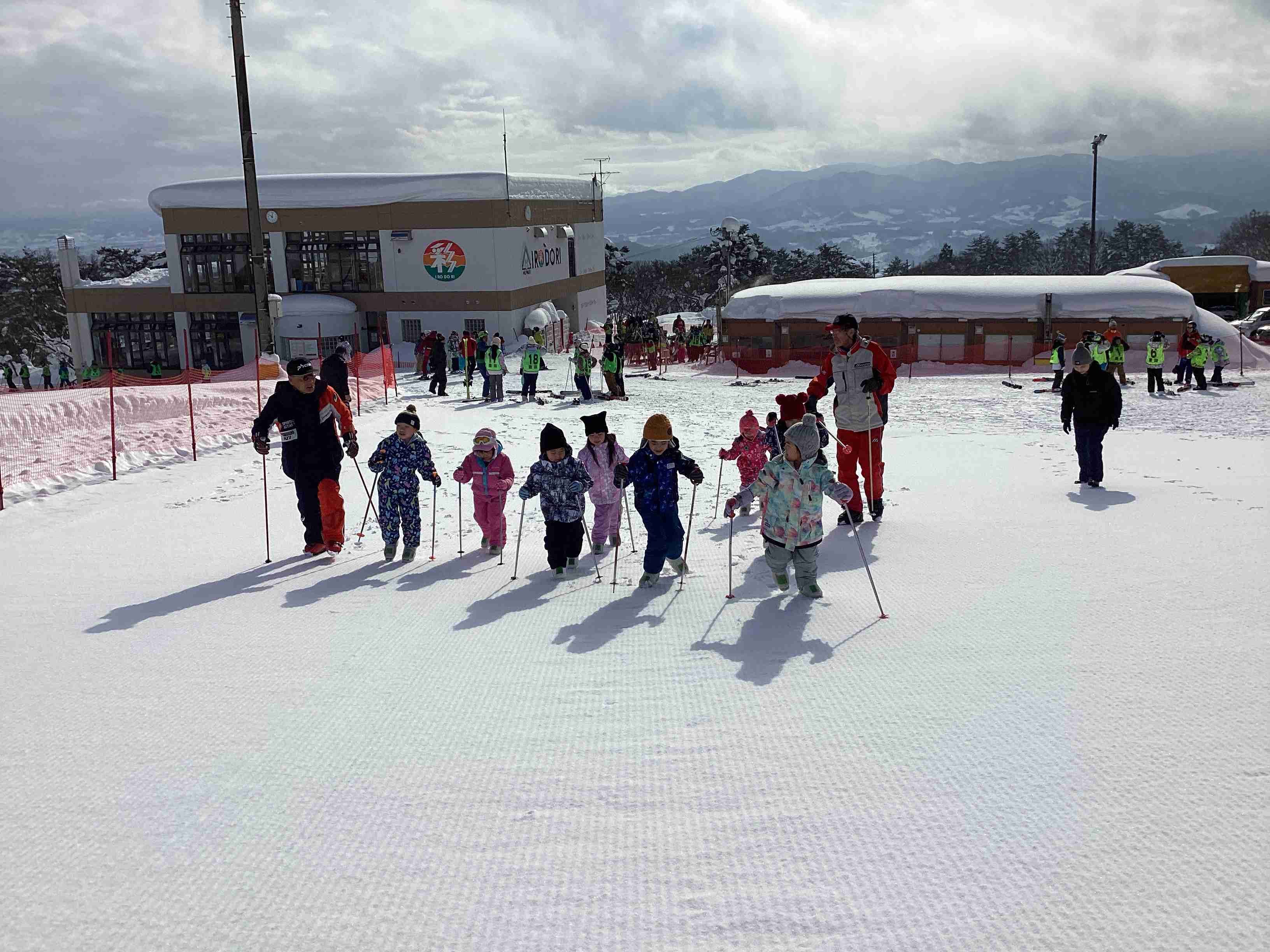 2月4日(水)・立春 子どもたちは人生初のスキーに挑戦‼ 寒波&豪雪だったのは昨日まで、今日は立春らしいおだやかな日和でした。みんな自信半分、不安半分で挑戦しました。まずは、スキー靴を履くことに苦戦・・・履いてからも歩きにくさに苦戦・・・いざゲレンデへ向かうとたくさんの小学校のスキー教室でにぎわっており、ちょっと圧倒され気味の様子。スキーの装着はまだまだ、スキー靴に慣れるためゲレンデを「歩く」「歩く」「歩く」これは上手にできました。ステップアップし片足だけスキー板を装着・・・時間と共に上手になり、できた気分になり両足にスキー板を装着したとたん、みんなへっぴり腰!自力ではなかなか思うようには滑れず、ストックで引っ張ってもらい少しずつ前進。「むずかし~」「できない」の声が多かったけどいい経験になりました。 岩木山百沢スキー場のみなさん、講師のみなさんお世話になりました。