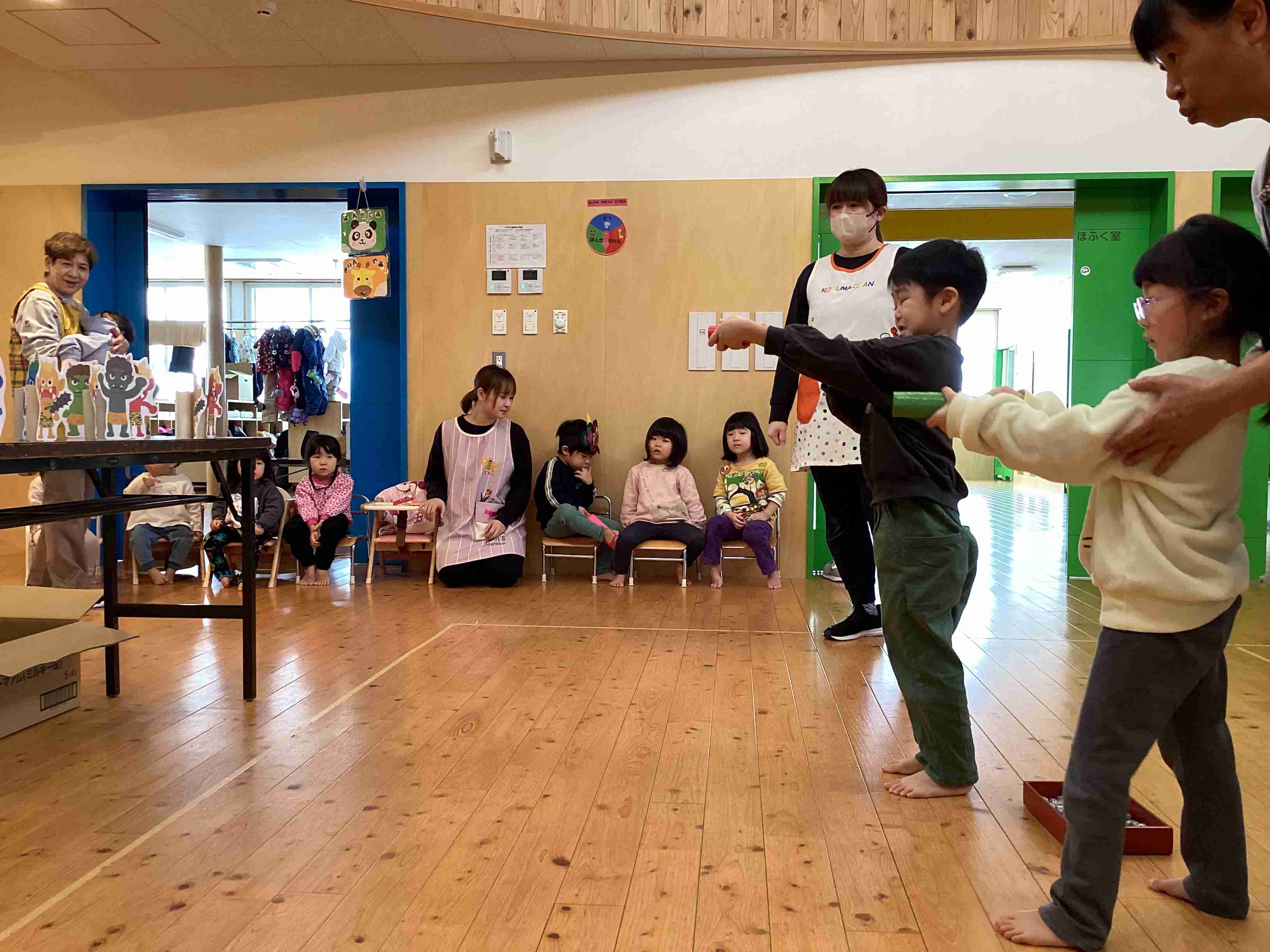 1月20日(火)今月の誕生児は2名です。紙芝居でお祝いをされ嬉しそうでした。未満児はpkキックでカッコよくシュートを決めて達成感爆上がり⤴ 以上児はみんなで協力して紅白対抗段ボールつみつみ競争をしました。段ボールは大きさ・形・素材など様々あり高く積み上げるには、段ボール選びが勝因になりそうです。 倒れても何度もチャレンジできてスリルも味わいながらのゲームを楽しみました。 給食メニュー:キャロットライス・うまハンバーグ・ポテトサラダ・オムレツ・キャベツスープ・りんごのコンポートヨーグルト添え