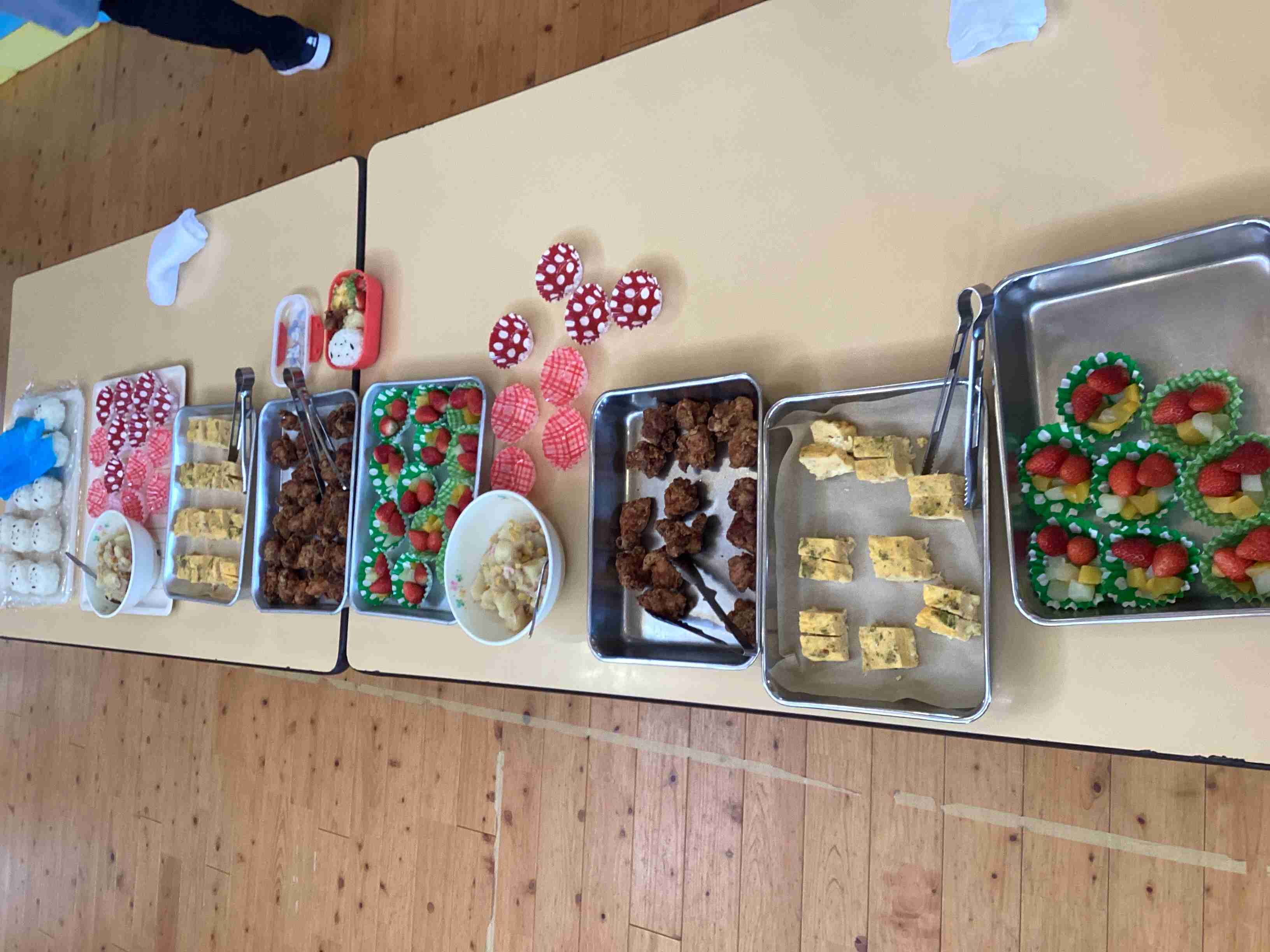 2月9日(火) 食育弁当の日のメニューは・シマエナガおにぎり・唐揚げ・ツナオムレツ・ジャーマンポテト・いちごとミックスフルーツ 持参した弁当箱に詰めていきます。大きさによって全部入りらなそうなものもあるのですが、そこはみっちみちに詰め込んで、完成です!みんなの大好きな唐揚げはいつも大人気で1個にしようか、2個のしようか次のおかずを入れるスペースがなくなりそうと思いトングを置く!こんな子が多数いましたが、おかわりで唐揚げをGet!していました。