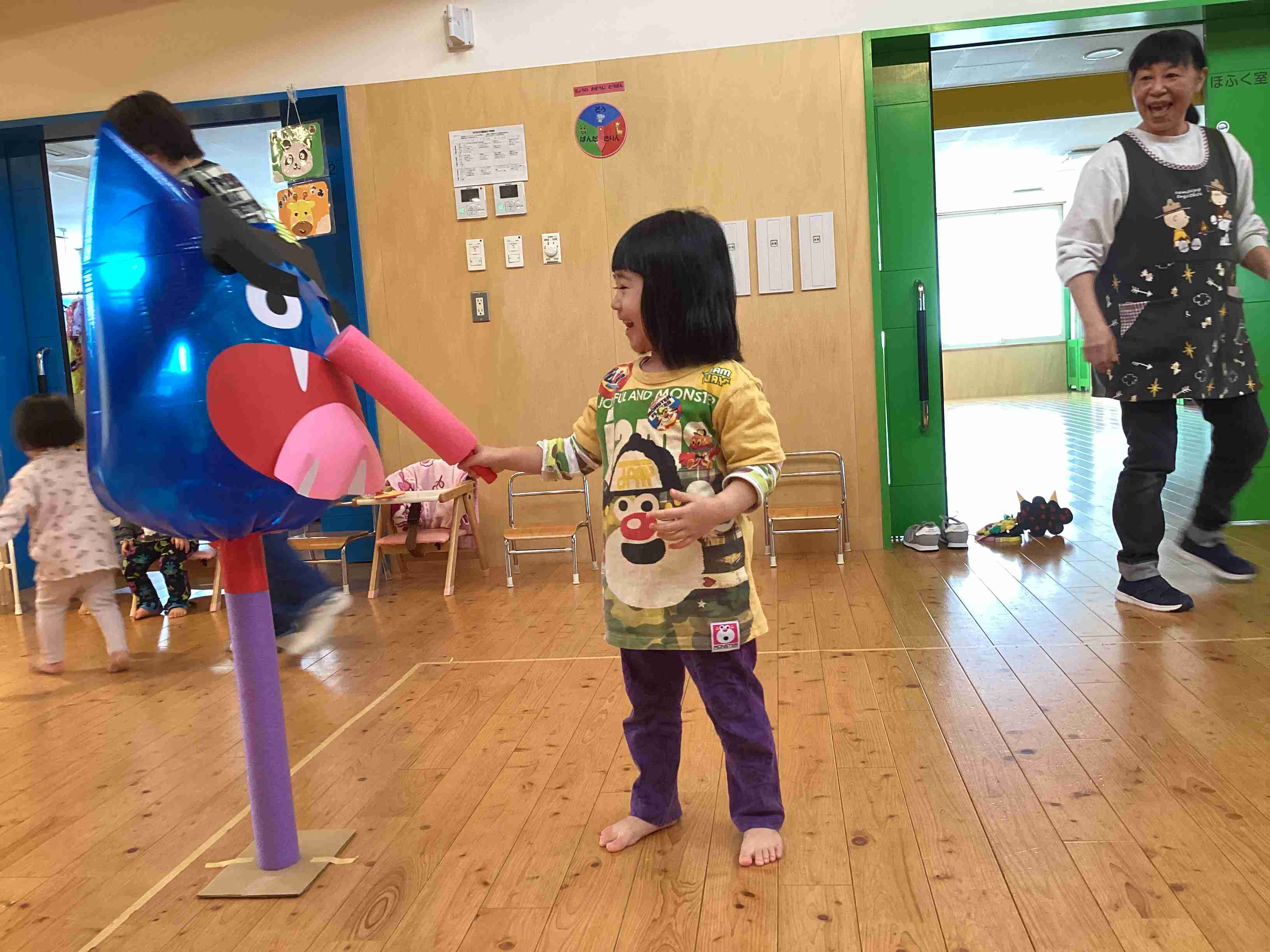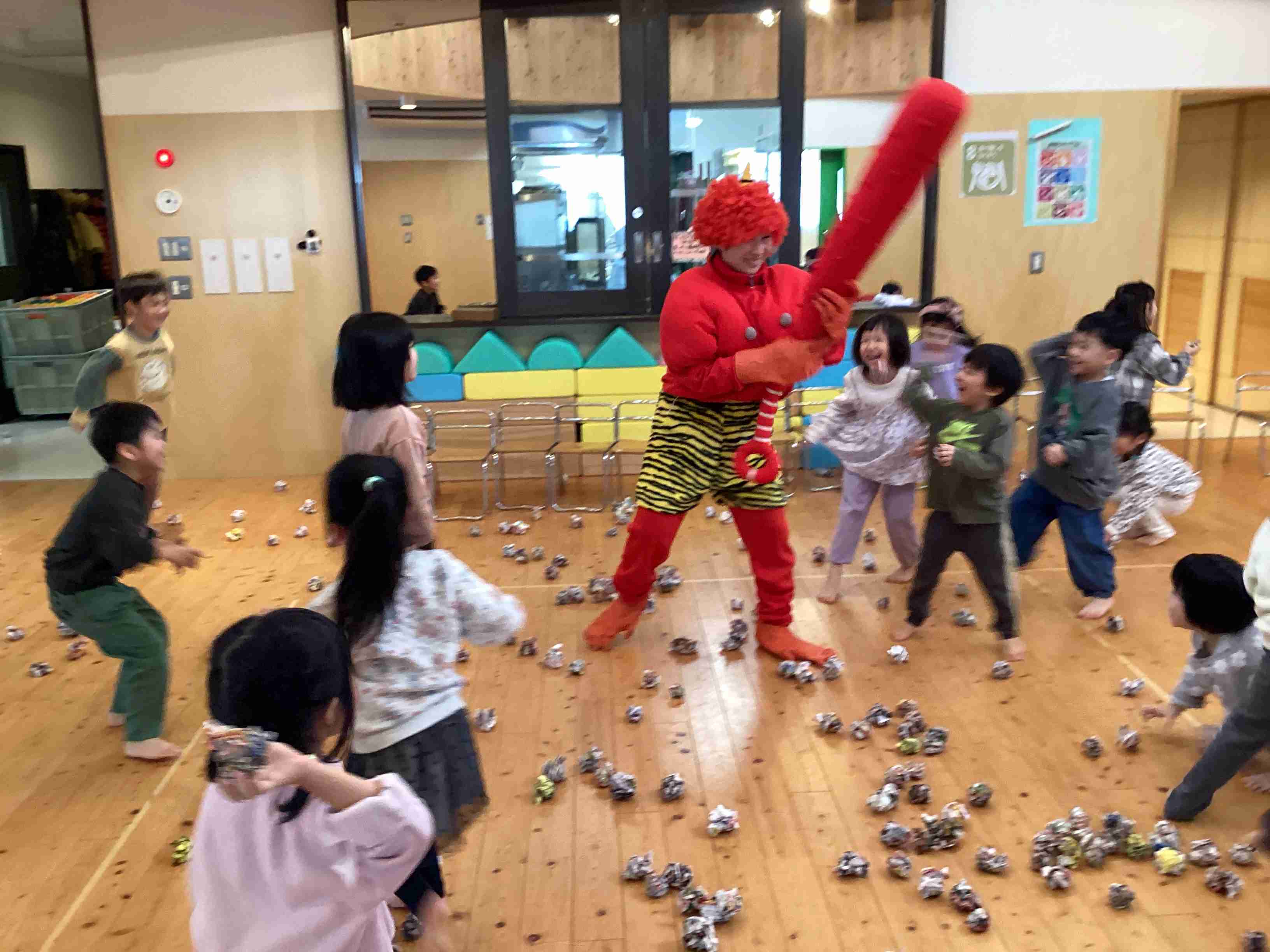 2月3日(火)節分 豆まき会は色々な鬼がいることを解説してもらい、自分は○○おにだ!と話を聞きながら自分の鬼を見つけていました。「おにって先生でしょ!」「おにくるの?」となんだかそわそわ・・・しかし、鬼のパンツの歌とダンスで元気100%、アンコールまでして盛り上がりました。 小さい子はバルーンおにをやっつけて、きりん・ぱんだ組は空気砲でおにをたおして、ぞう組は小豆・大豆を箸で移すゲームを楽しみました。子どもたちも、もうそろそろかな~と廊下を気にしていると金棒がチラチラ見え鬼が登場!!!さあ~みんなで鬼退治開始!元気に豆をまき、記念撮影をして終了しました。 給食メニュー:鬼ぎり・金棒ハンバーグ・キュベツの塩昆布あえ・かにかまスープ