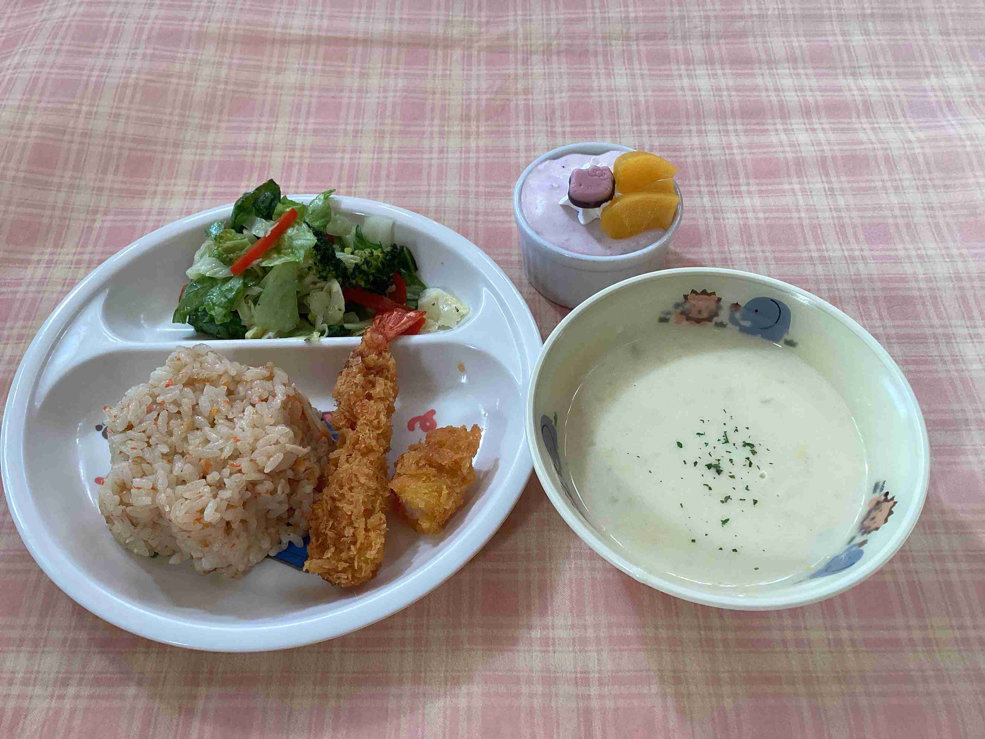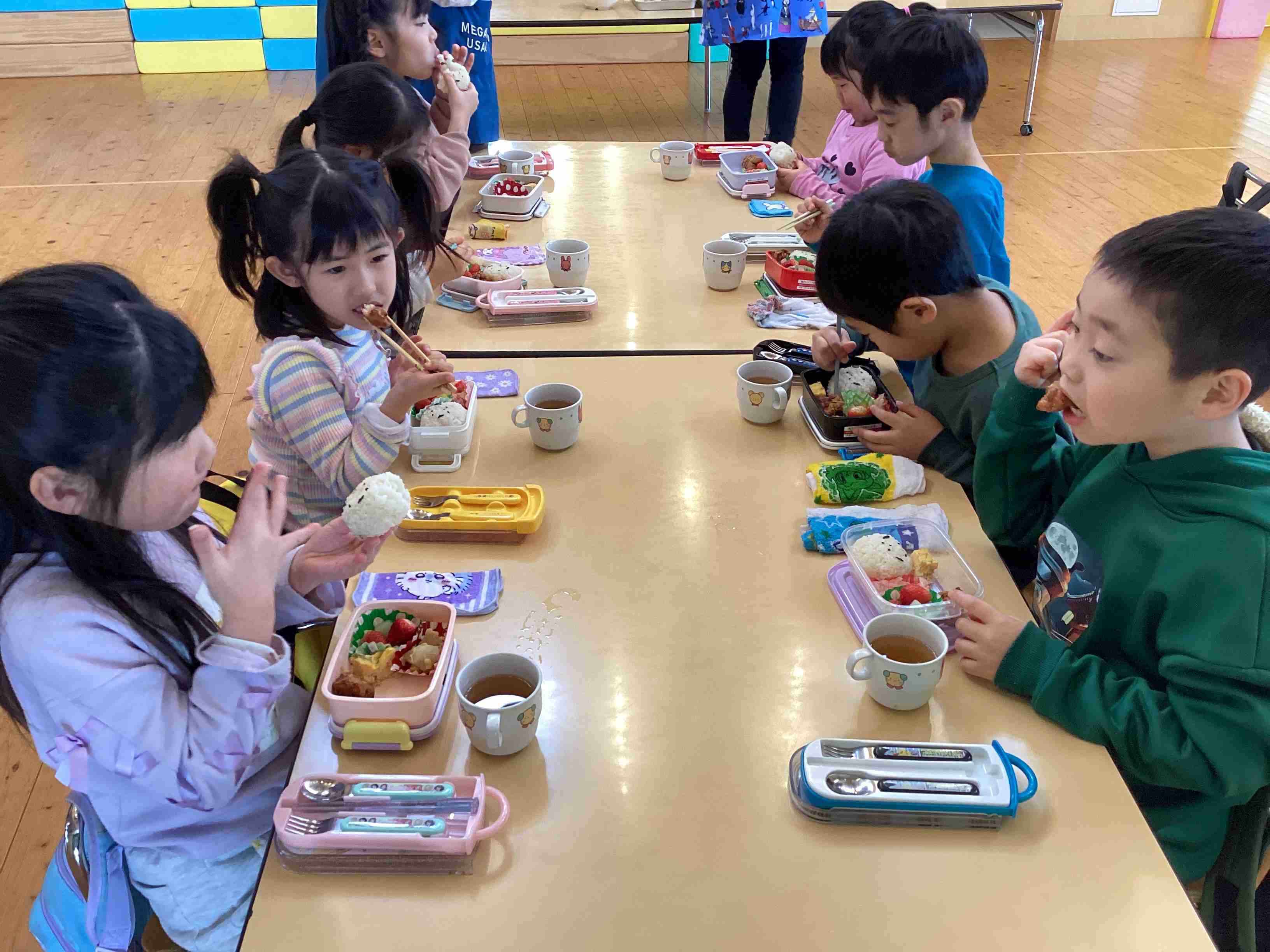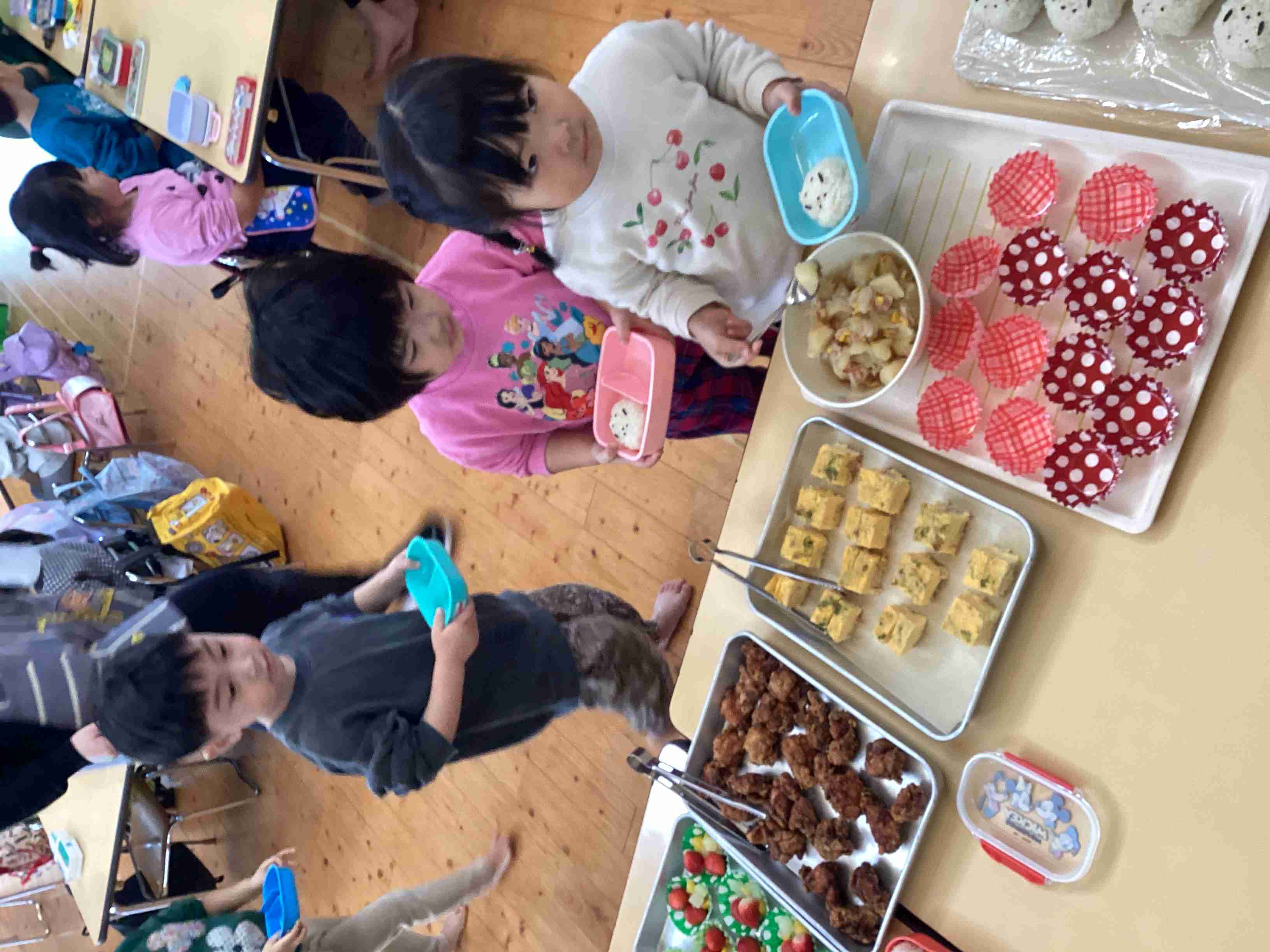 12月19日(金)今日は食育弁当の日。持参した「から」の弁当に自分でおかずを詰めます。今回はおにぎりもにぎりました。トングの使い方も慣れ、どこにメインのおかずを入れようかなど考えながら順番を待っています。弁当におにぎりをINする子、絶対に弁当には入れない子・・・好きなスタイルでいいんです! メニュー:竹輪の納豆揚げ・和風卵焼き・かぼちゃのチーズ焼き・ミニゼリー・ブロッコリー 午後のおやつは、さつまいもチップスです。園で作ったさつまいもをチップスにしいただきました。さつまいもの甘さ+塩少々でおいしいと大人気、おかわりの声がいっぱいでした。