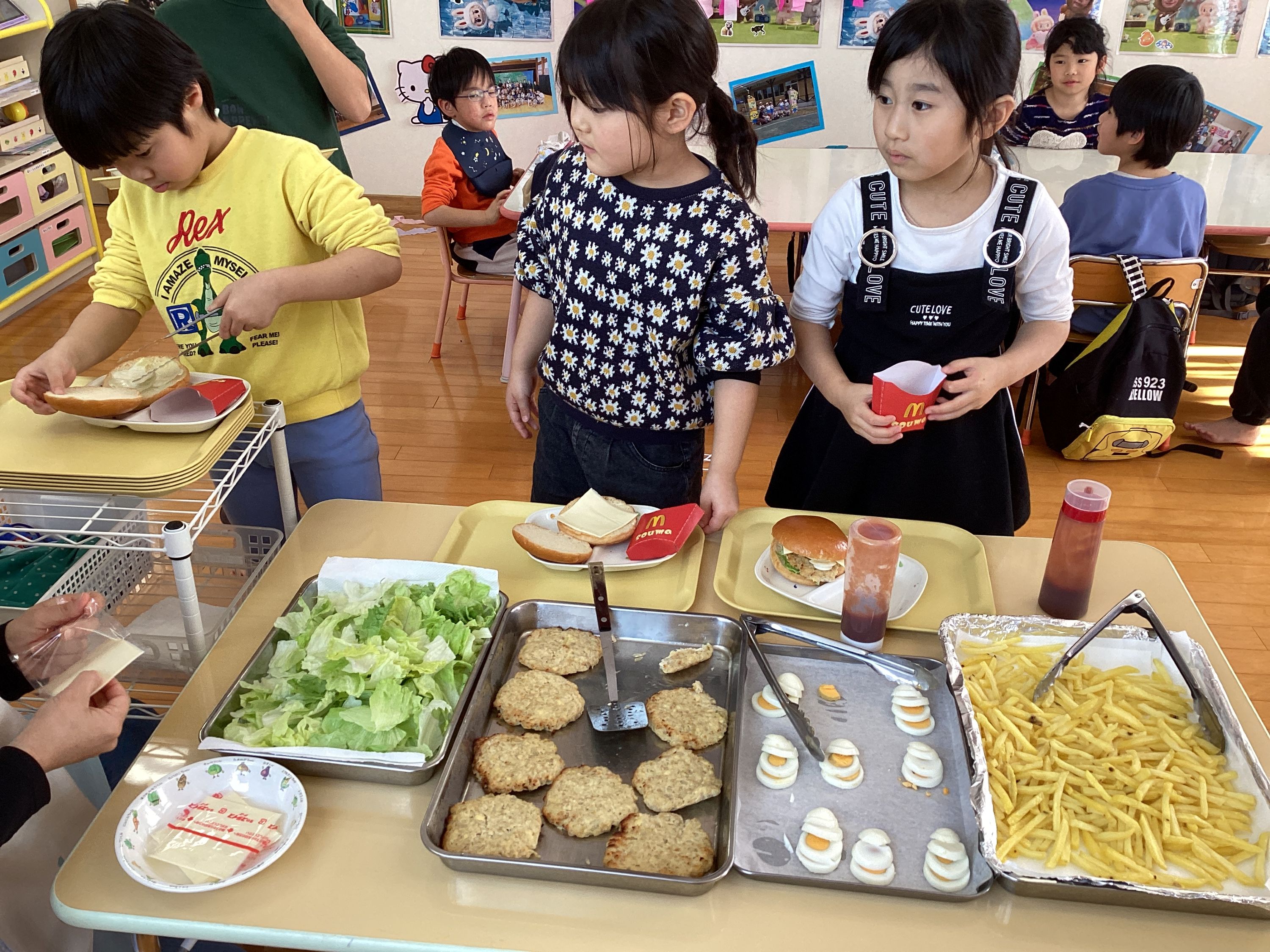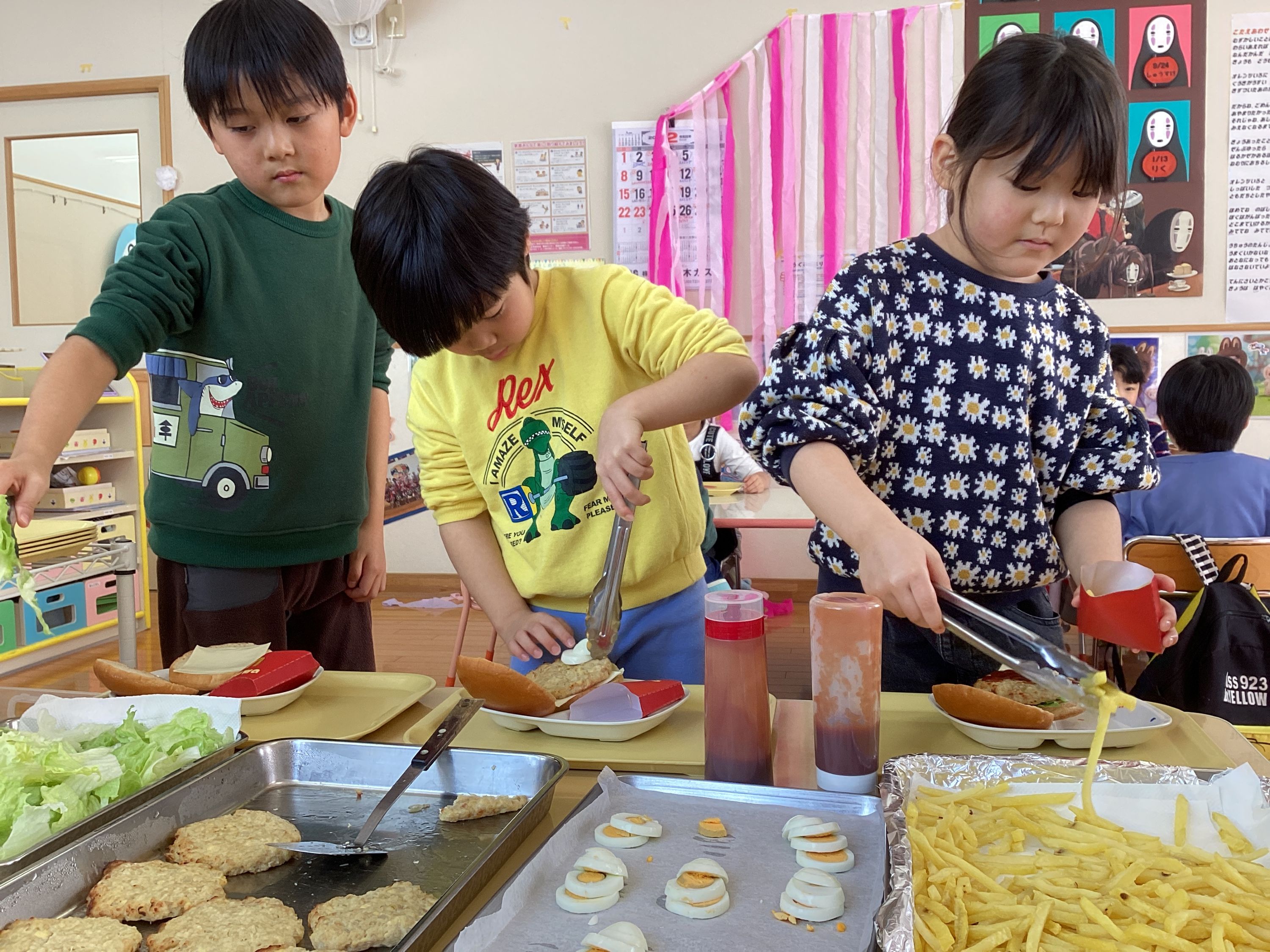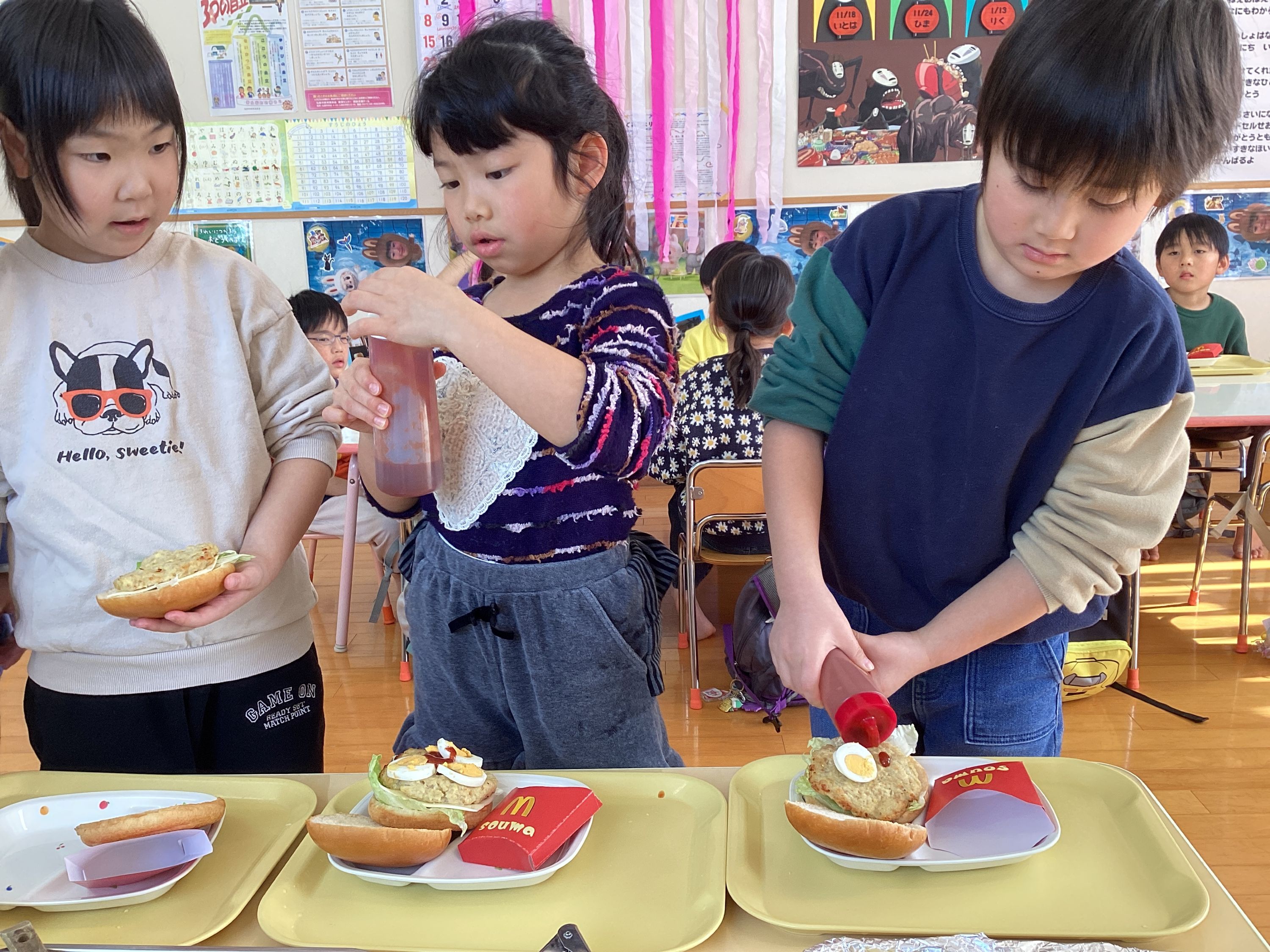 2月10日(火)は年長組の「お楽しみ会」でした。午前中は、「マリービスケットケーキ」をみんなでクッキング‼マリービスケットを牛乳に浸して、クリームを挟んで何層にも重ねていきました。「これ、お家でやりたい!」「ママに教えよう~」など楽しい会話が聞かれました。仕上げは美味しそうないちごをのせて、冷蔵庫で冷やして午後のおやつの時間を待つことに~!クッキングの後は、先生たちの顔を似顔絵にしてカードを作って、「にがおえビンゴ」で盛り上がりました。そして、楽しみにしていた給食!なんとぞう組さんだけの特別メニュー(Mのマークのハンバーガーとポテト、ジュース)セルフでバンズにレタスとチーズハンバーグ、ゆで卵、オリジナルソースをかけてはさんでいきました。バンズが顔くらいの大きさでしたが、みんな残さず完食でした。おいしかったね!また思い出になればうれしいなぁ~