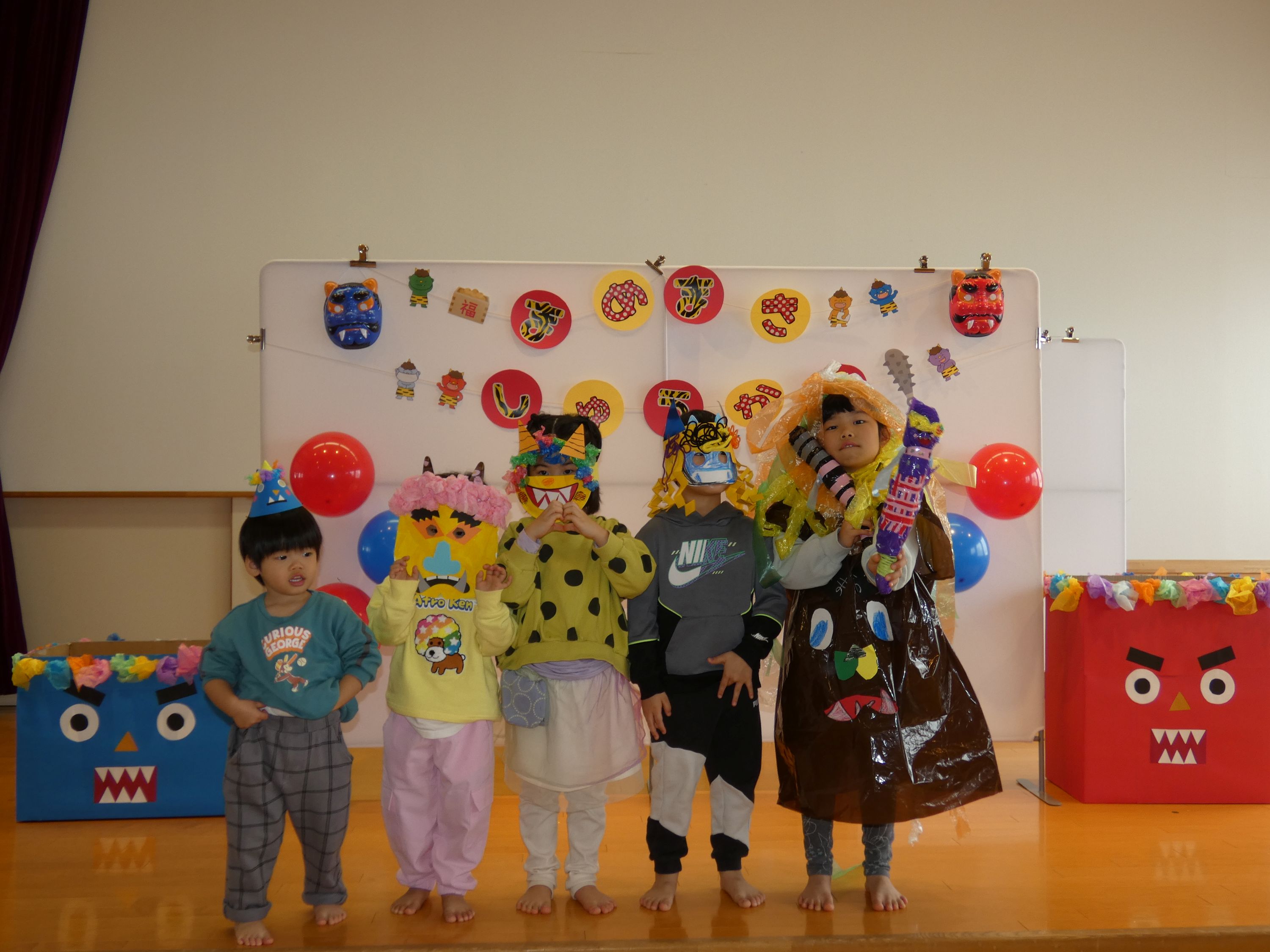 2月3日(火)は「豆まき集会」でした。自分で製作した自慢のお面をつけて、遊戯室に集合!クラスの代表がステージに上がり、「ここが難しかった」「切るのを頑張った」など作品紹介。次に「豆まき」「おにのパンツ」を元気にうたいました。♫はこう、はこうオニのパンツ!とノリノリでした。次は「節分にちなんだ○×クイズコーナー」問題をよく聞いて、○や×に移動し、年長さんは未満児さんの手を引いている、やさしい姿が見られました。そして次は、大きいお友達に見守られて、りす、こあら、うさぎ組は「鬼の玉入れ」、きりん、ぱんだ、ぞう組は男女に分かれて「鬼ごっこ」をしました。なんと!本物?先生鬼も参加し、オニ役のお友達がみんなを捕まえていました。最後は記念写真を撮って「はいポーズ!」みんな、自分の中の悪いオニをやっつけたかな?