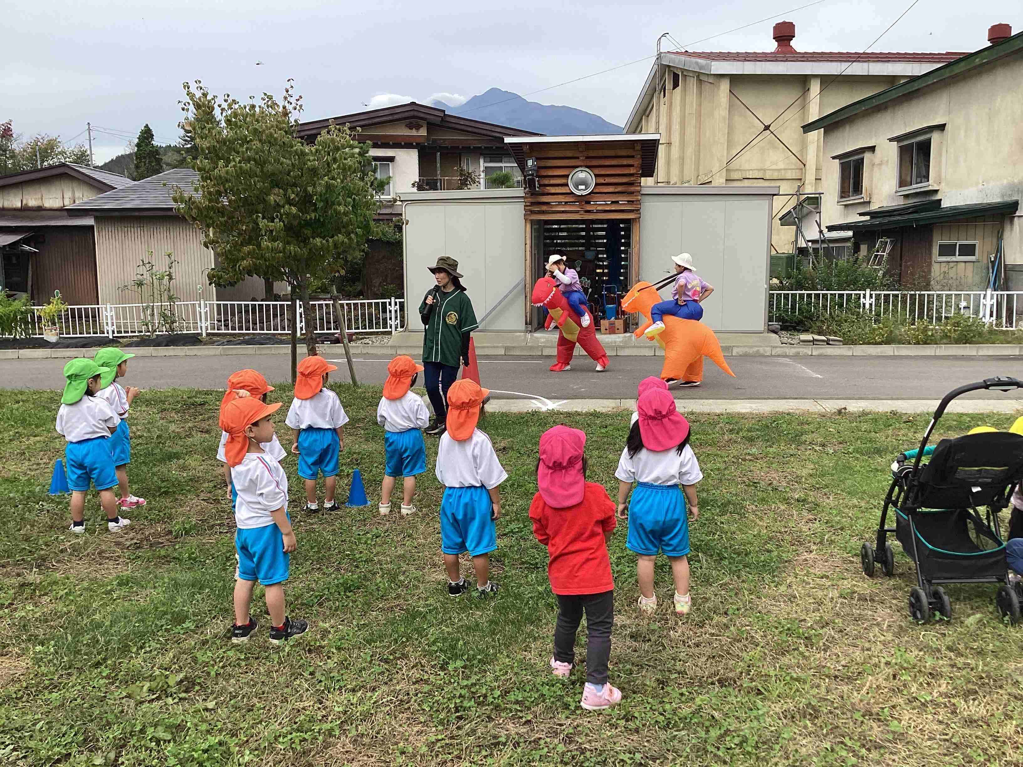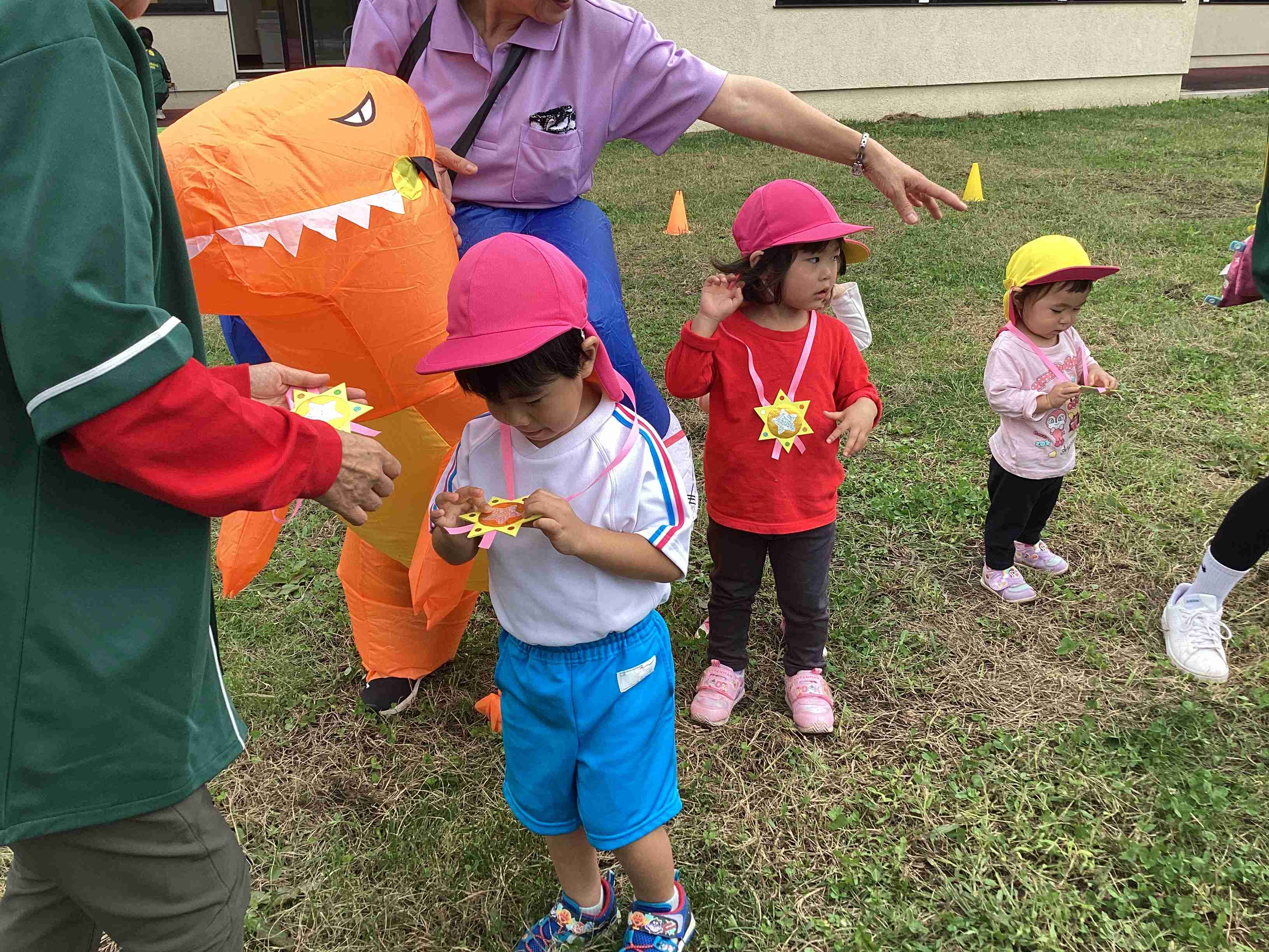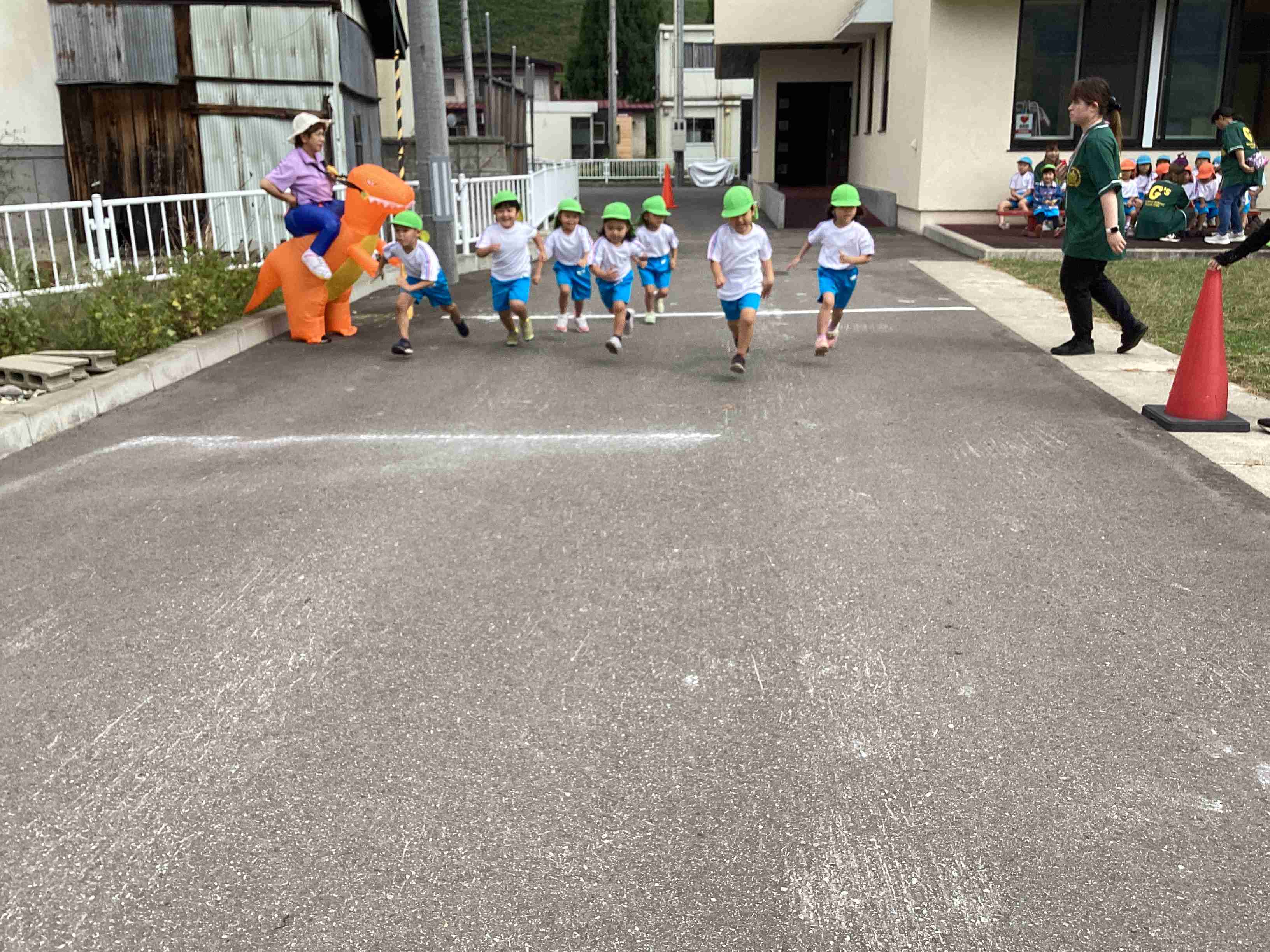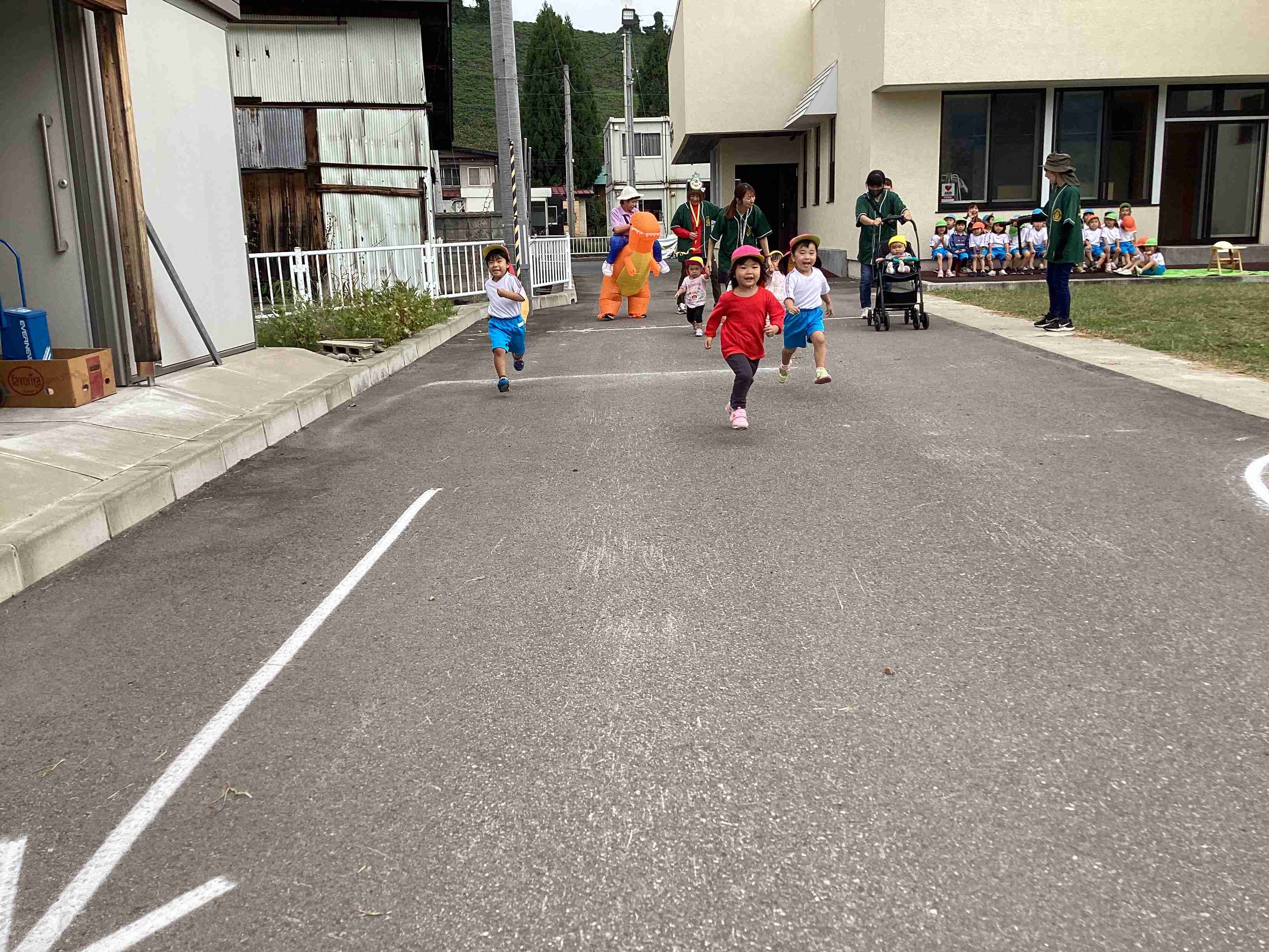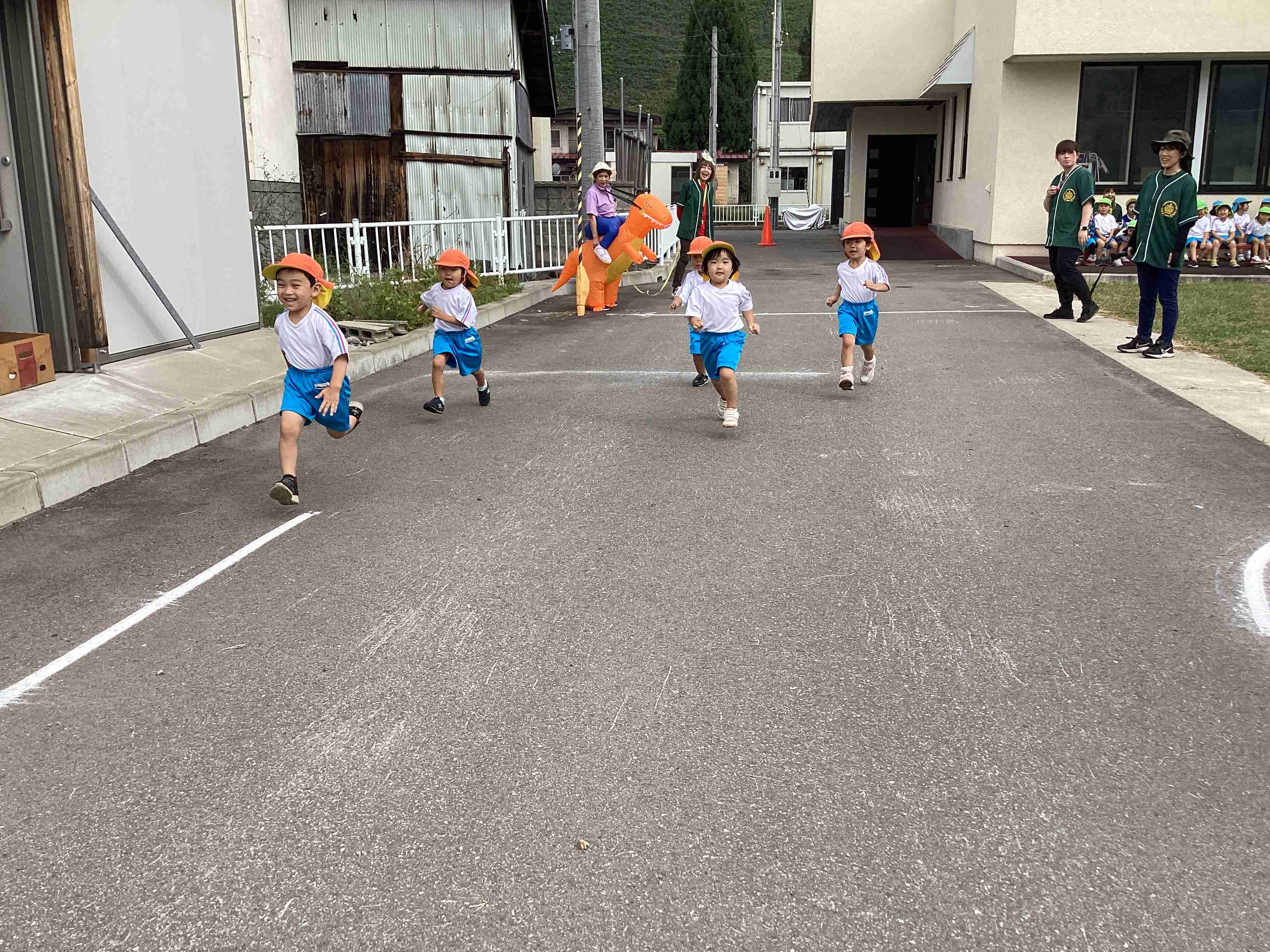 10月1日(水)たくさんのとんぼが空高く飛び交って秋晴れの良い天気に恵まれたこの日、マラソンデーを開催しました。準備体操は国スポ2026のイメージソング「青の煌めきダンス」で始め、飛び入りのティラノザウルスが登場し、園児は不意打ちを食らった様子でしたが気を取り直し全園児がクラスごとの距離を完走しました。練習とは違った結果に涙する子もいましたが、全園児が全力で走り切り、ご褒美は「メダル」です。世界陸上(9月13日~21日)の記憶もありメダルに感激の様子でした。