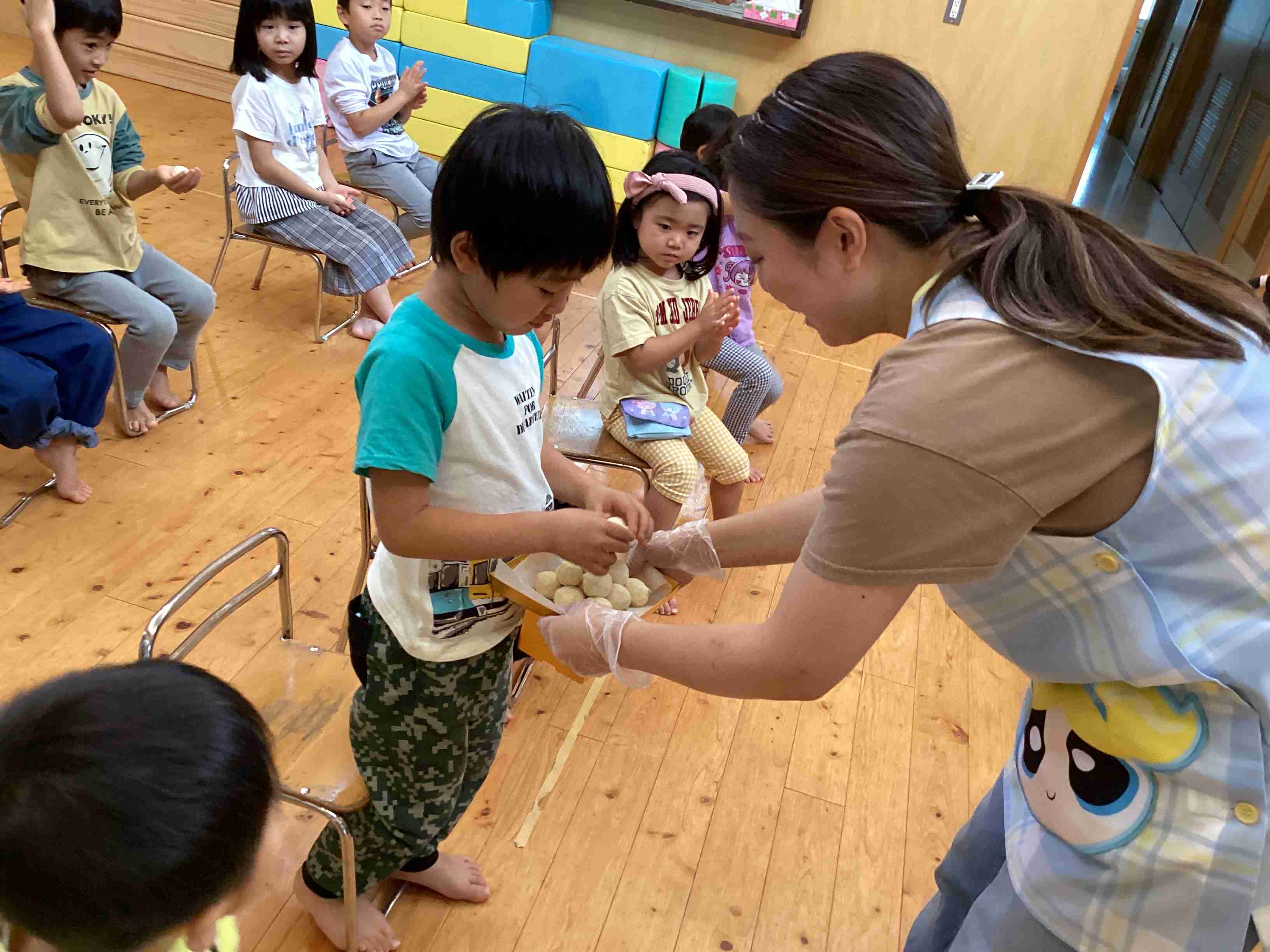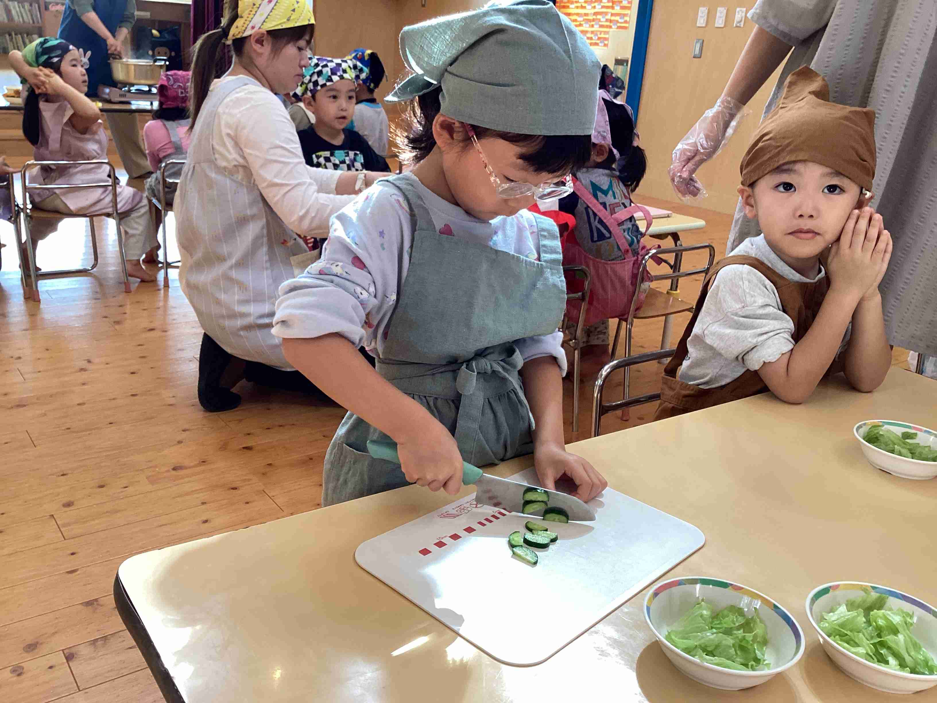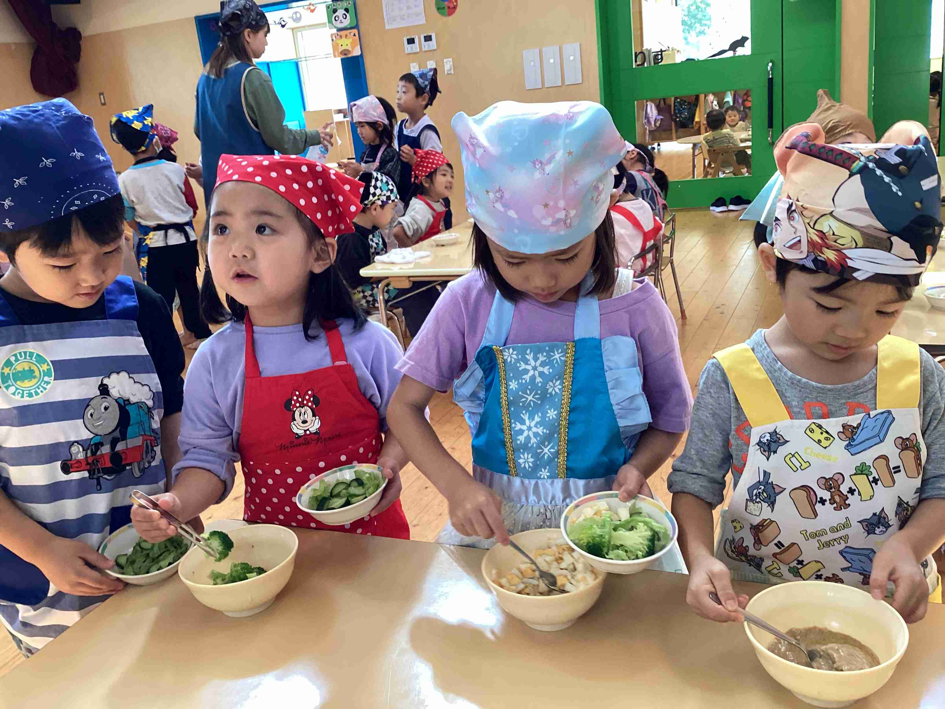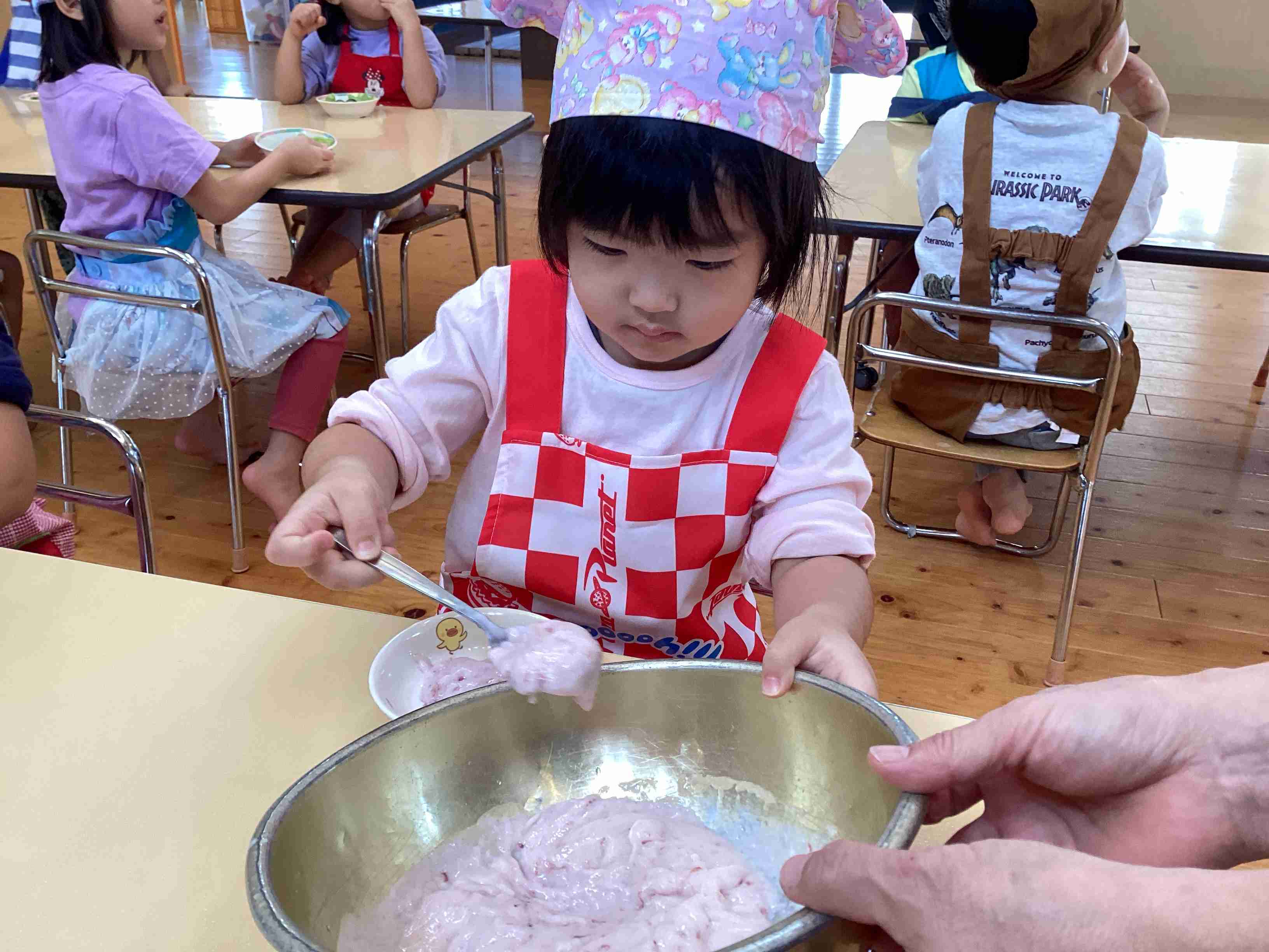ぱんだ組はサラダ担当・きりん組はフルーチェ担当 みんなでキッキング‼