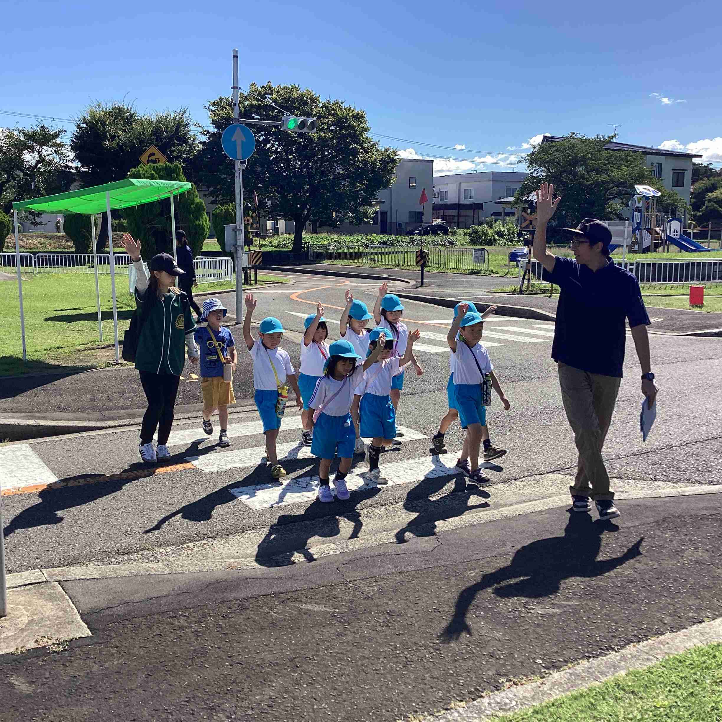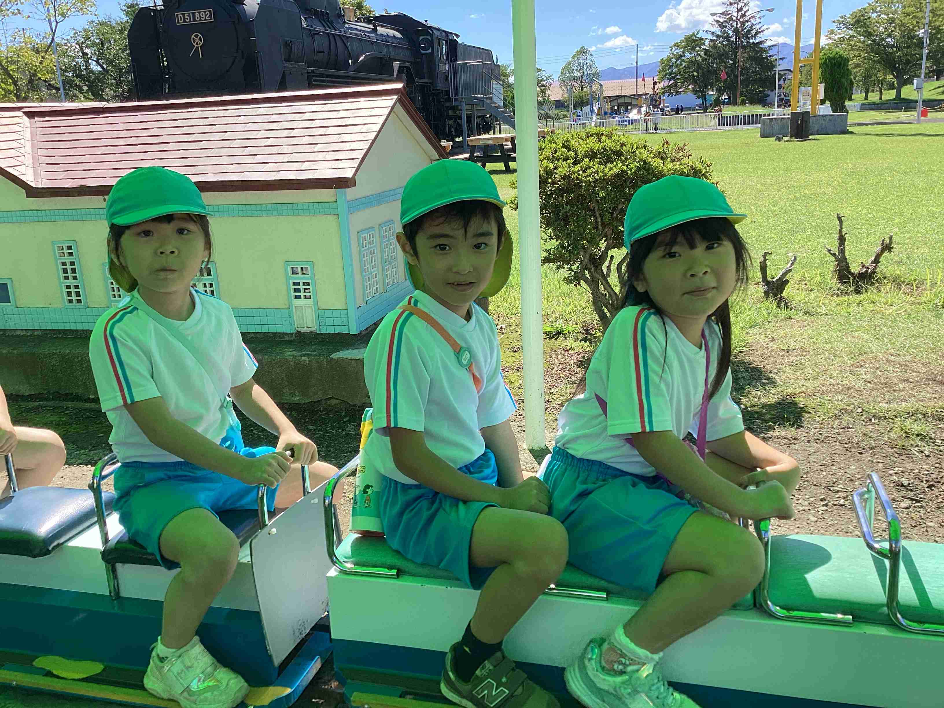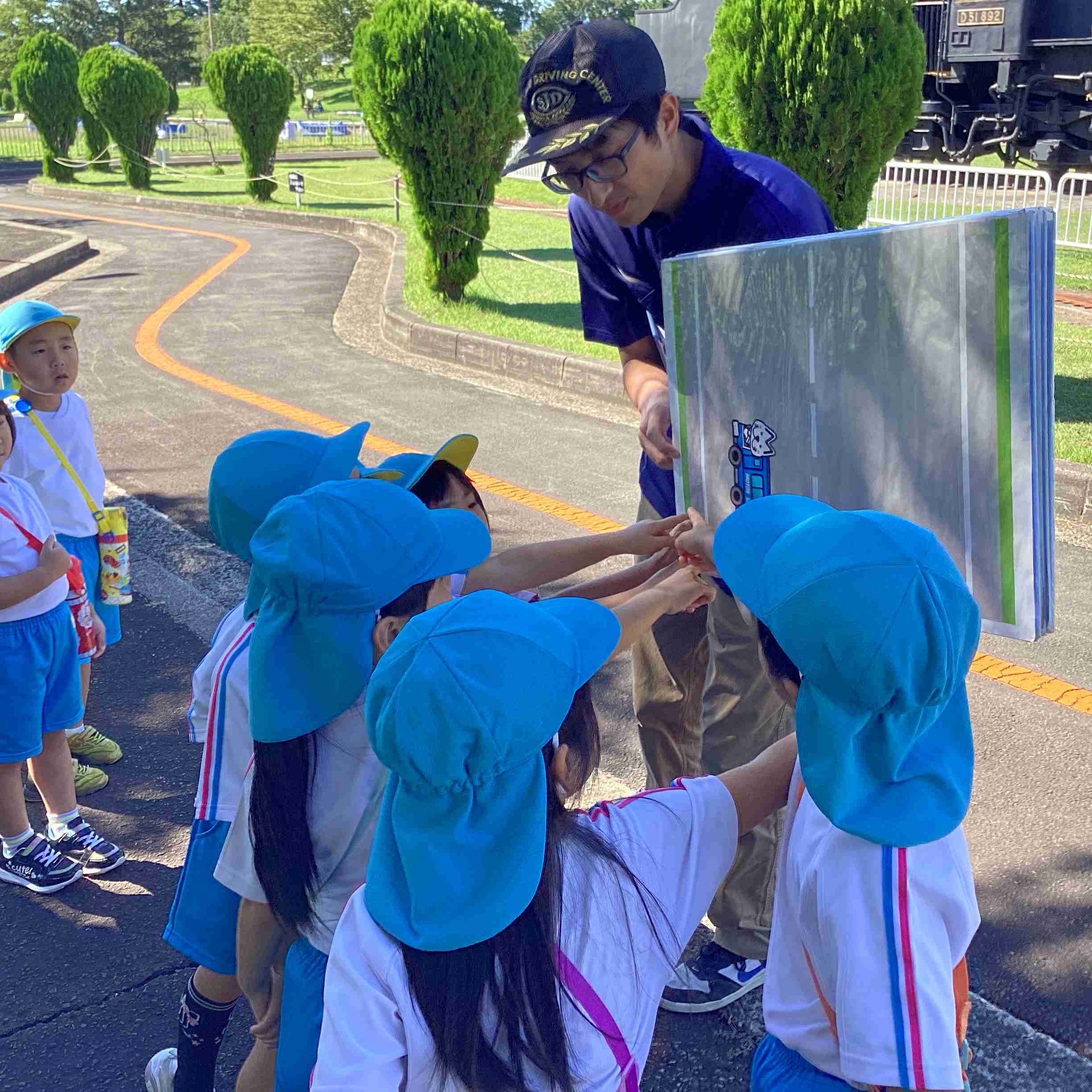 9月19日(金)まだまだ暑さを感じる9月も後半に入ってきました。ぞう組は就学に向けて交通ルールや標識の見方などを学ぶため城北公園交通広場に行きました。モータースクールのスタッフさんにご指導をしていただき、道路を渡るときの「三本指のちかい」を声に出して練習しました。ちょっと自信なさそうでしたが最後にはしっかりと合格をもらいました。新幹線やでっかいすべり台で遊んでいつもと違う園外学習を体験しました。