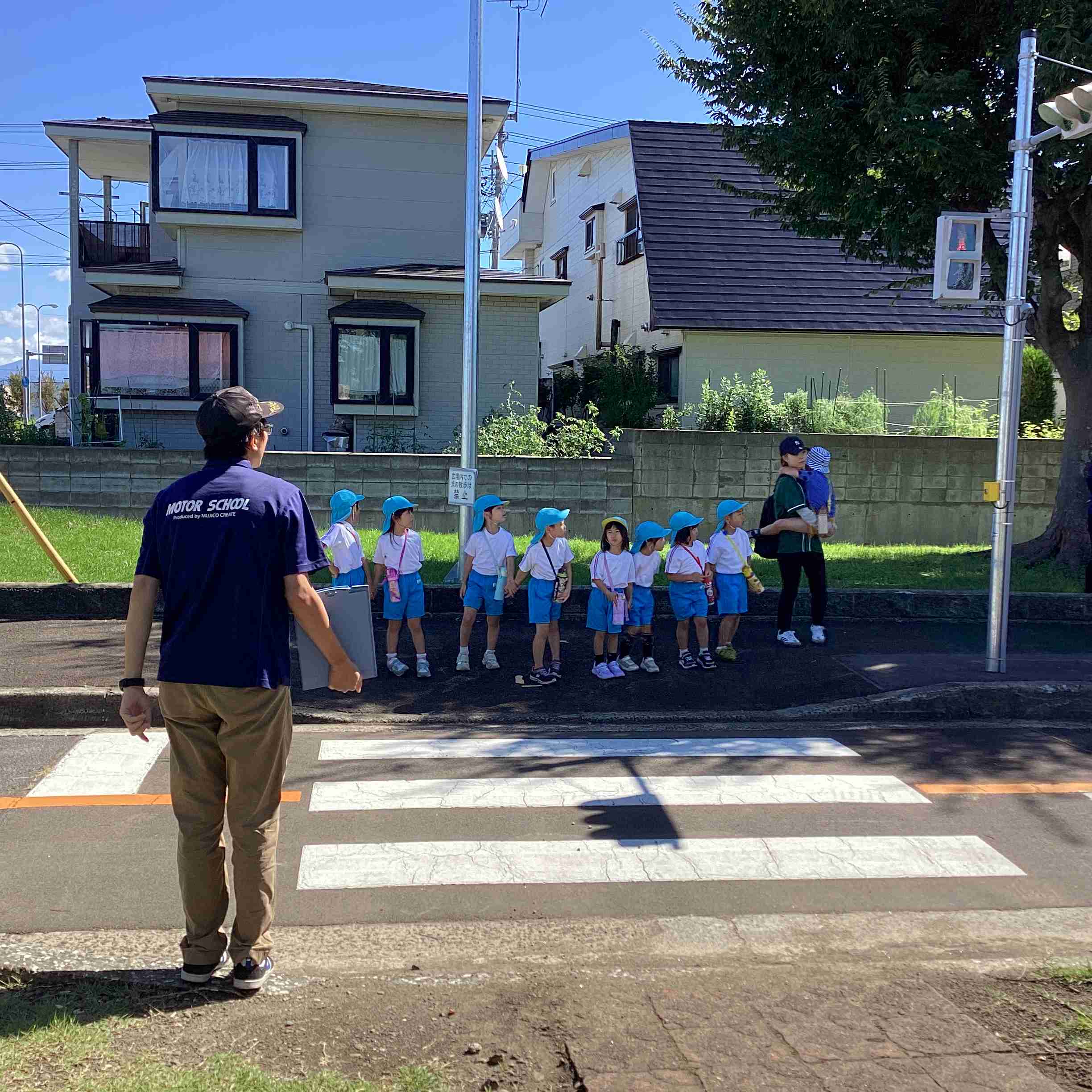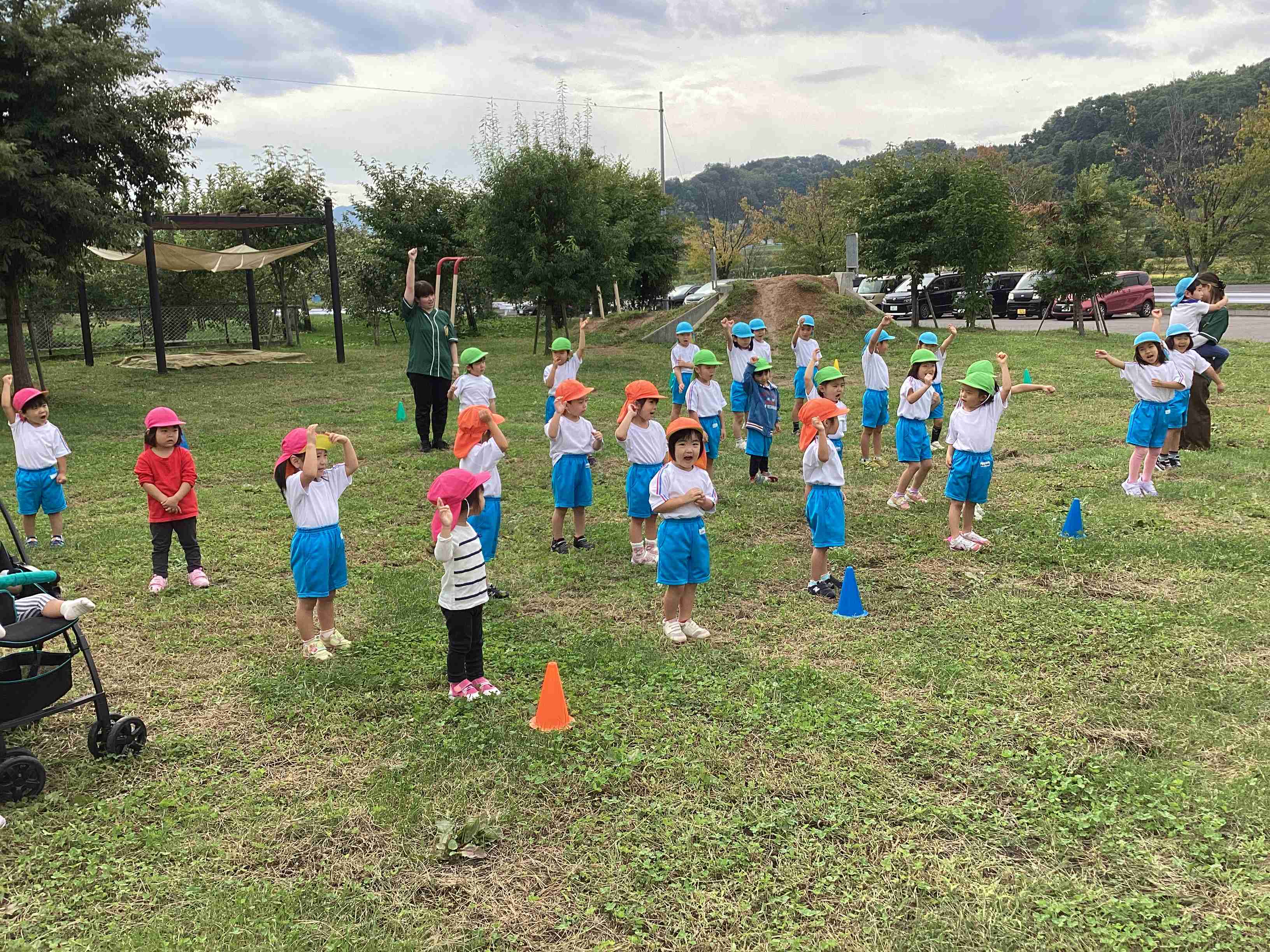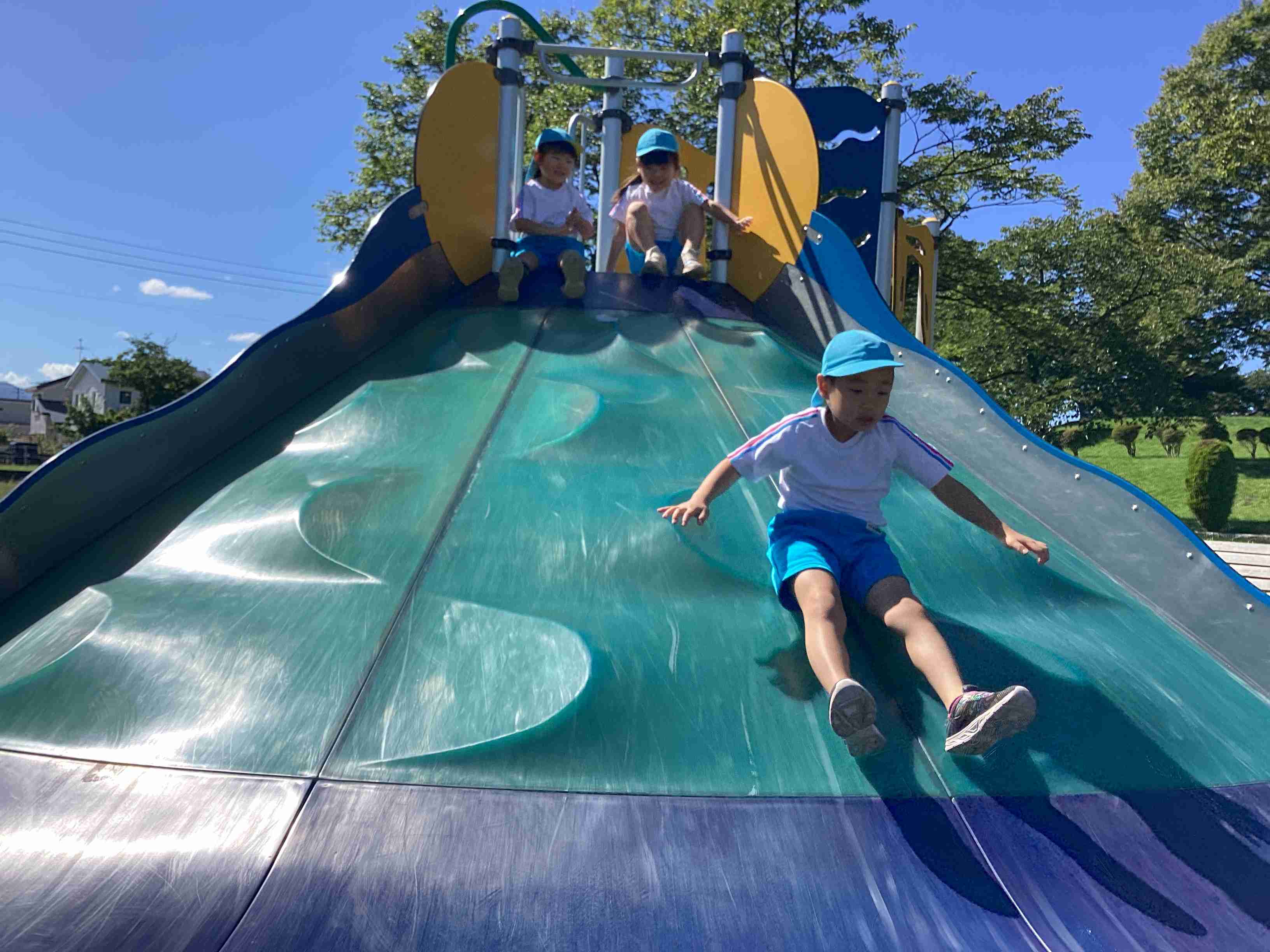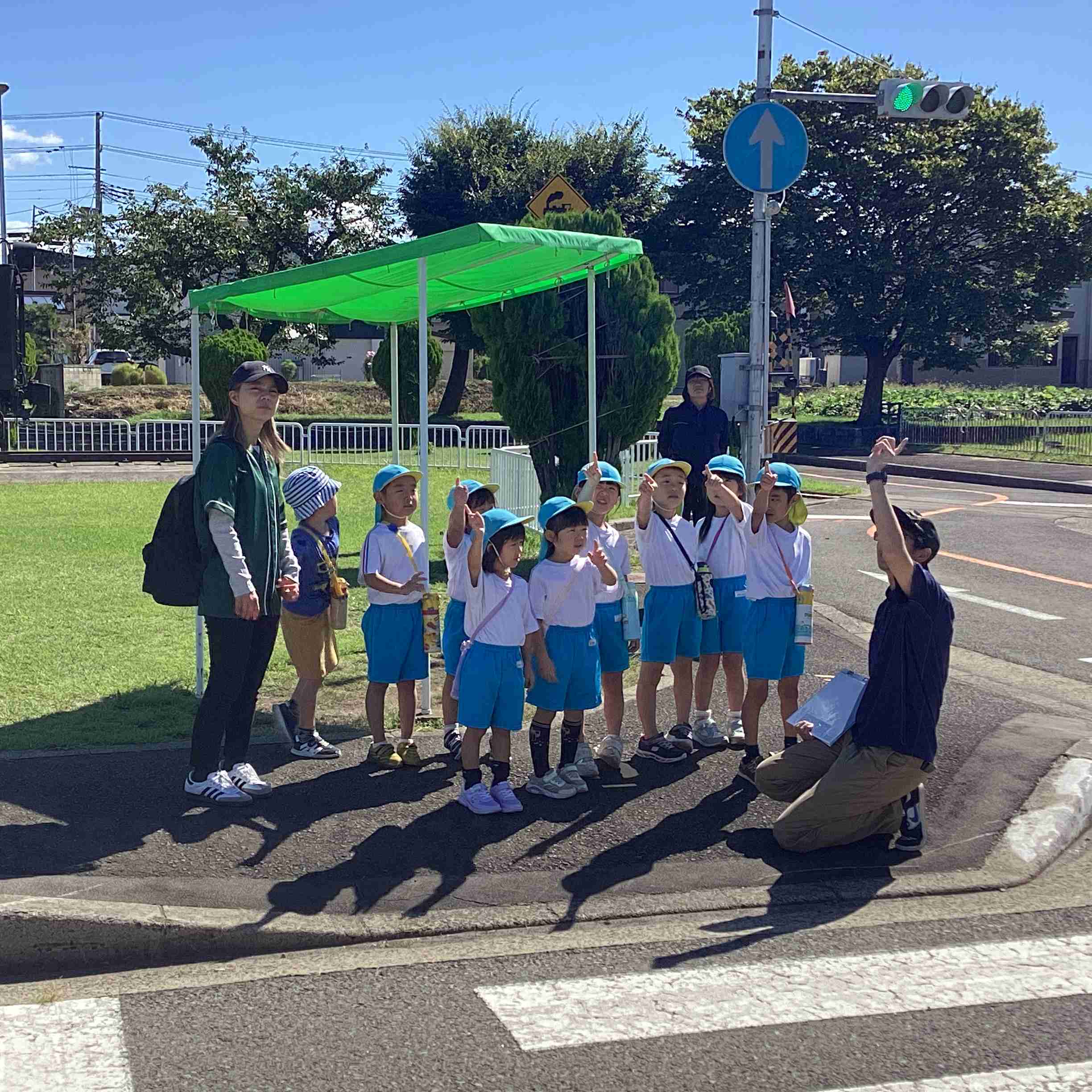 9月19日(金)まだまだ暑さを感じる9月も後半に入ってきました。ぞう組は就学に向けて交通ルールや標識の見方などを学ぶため城北公園交通広場に行きました。モータースクールのスタッフさんにご指導をしていただき、道路を渡るときの「三本指のちかい」を声に出して練習しました。ちょっと自信なさそうでしたが最後にはしっかりと合格をもらいました。新幹線やでっかいすべり台で遊んでいつもと違う園外学習を体験しました。