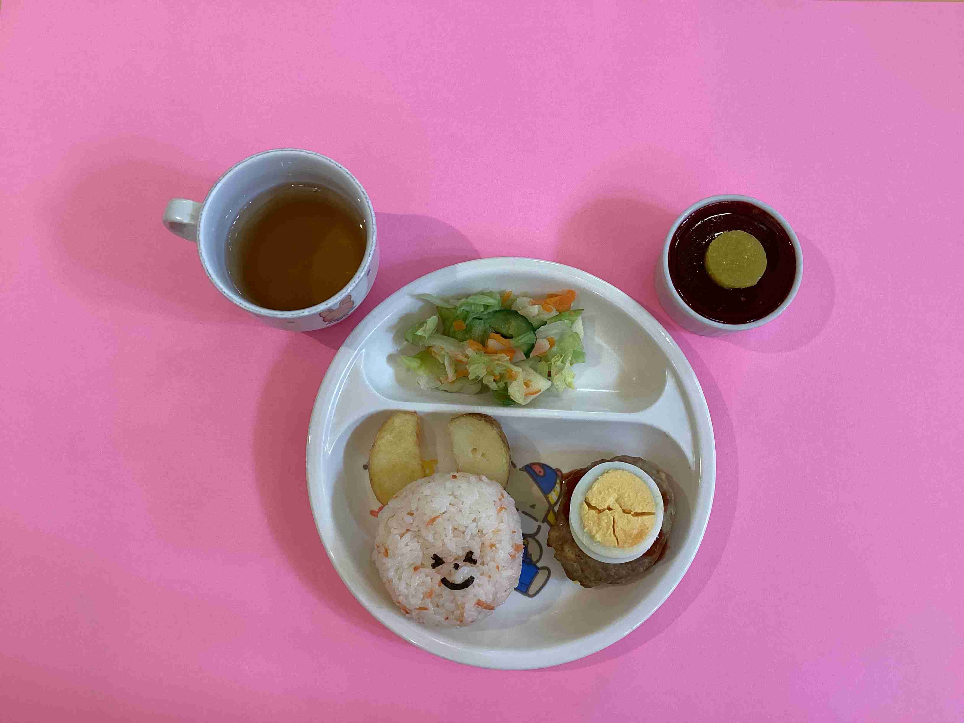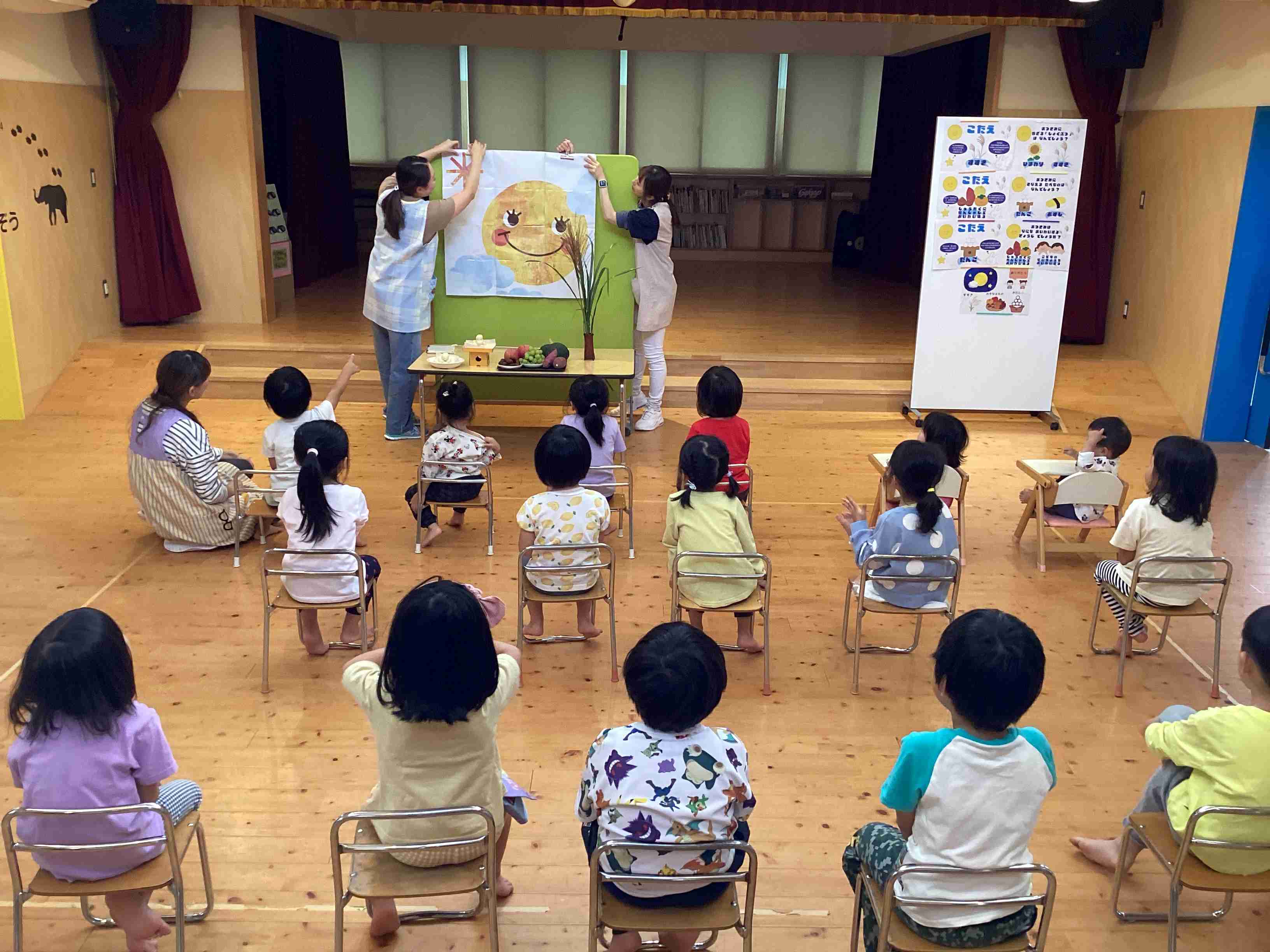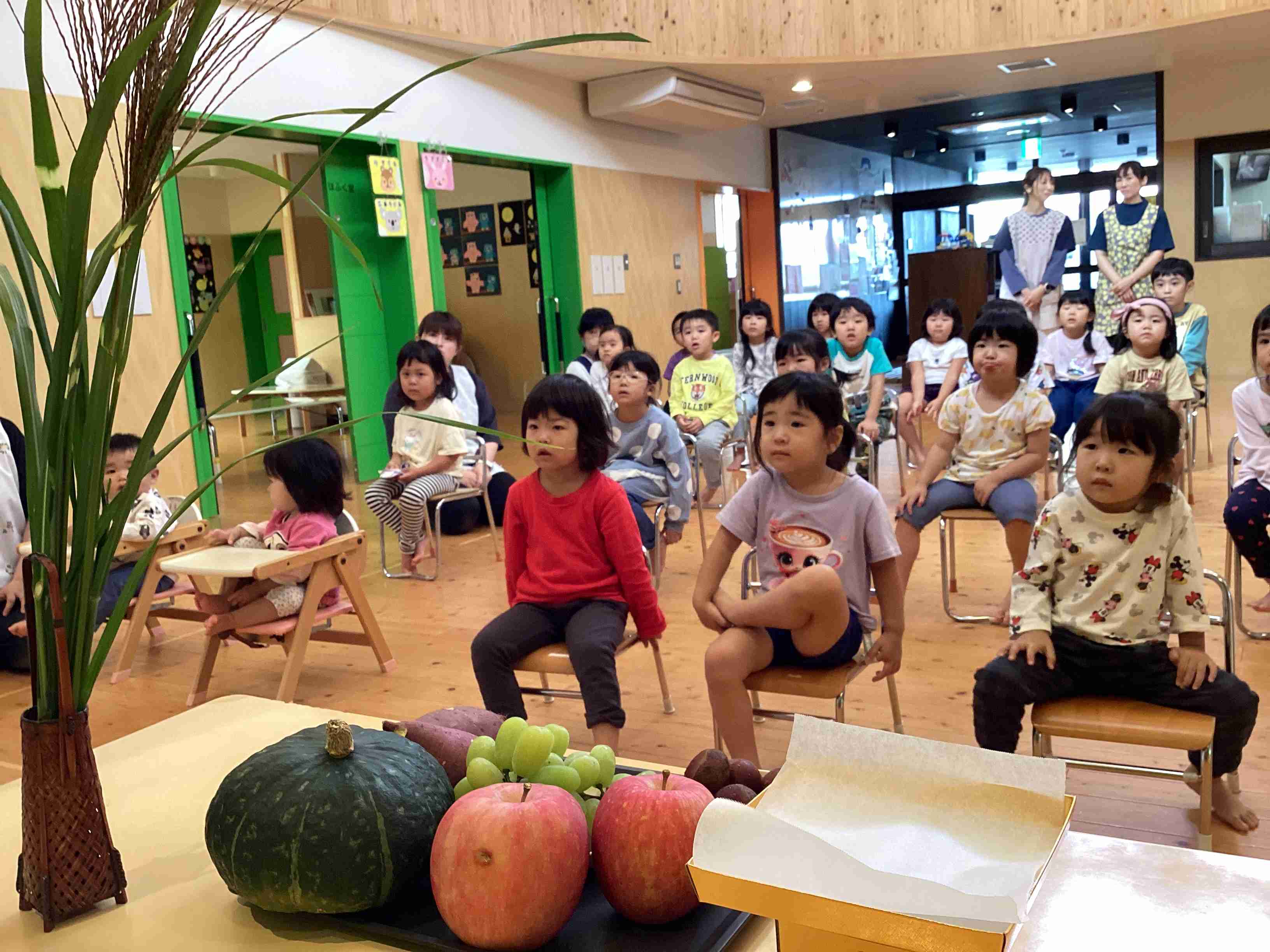 10が圧6日(月)先週までまだまだ暑いと思っていましたが、すっかり涼しくなりました。今日は十五夜です。保育園の「お月見会」では、畑で栽培したカボチャ・さつまいもや秋の味覚のりんご・ぶどう・栗などのほかに園児がまるまる丸めた団子をお供えし、十五夜にちなんだクイズや由来のはなしを聞き、紙芝居や歌を歌って夜の満月に期待しました。 給食のメニュー:お月見ハンバーグ・うさぎおにぎり・りんごサラダ・お月見ゼリー