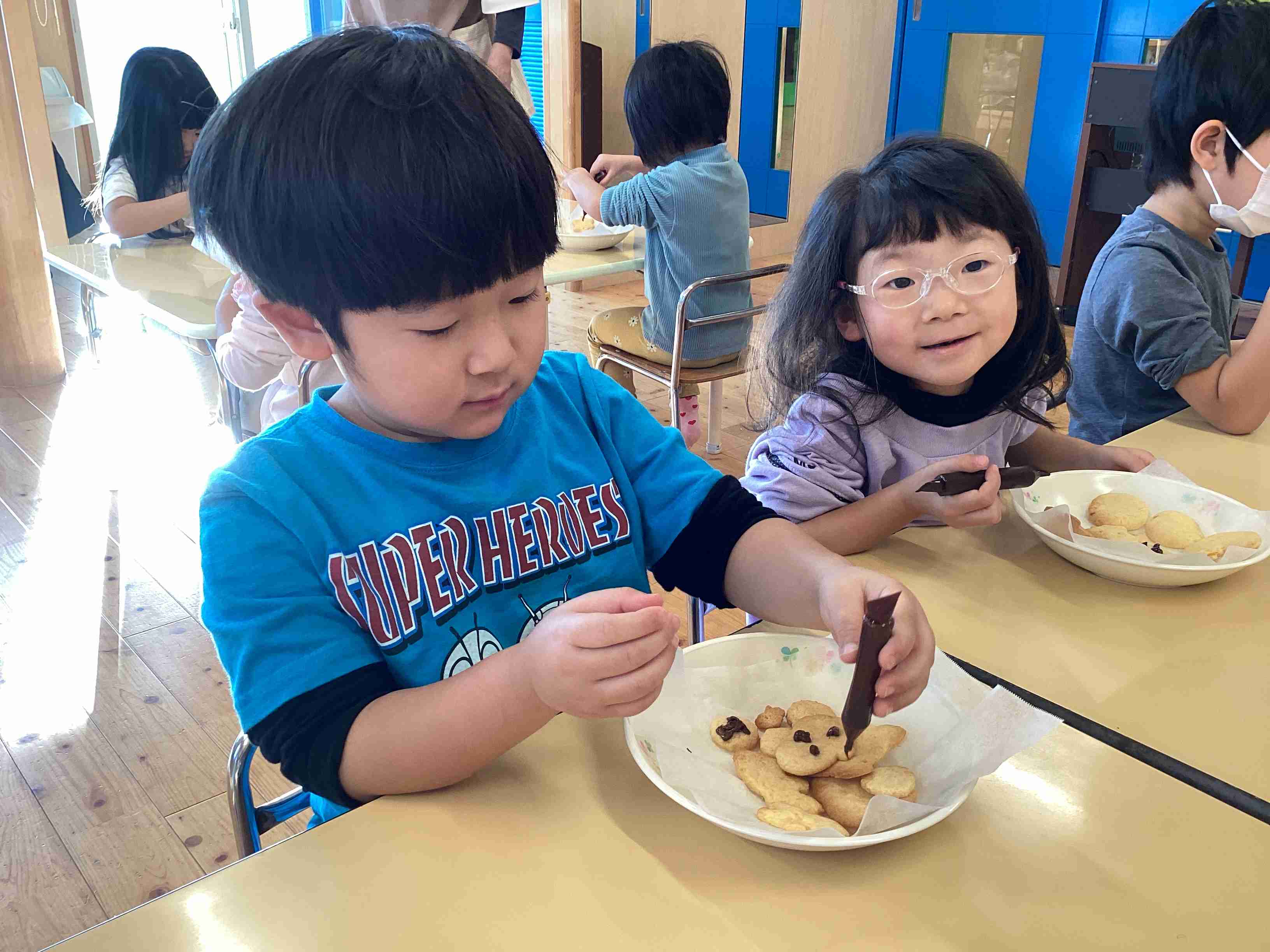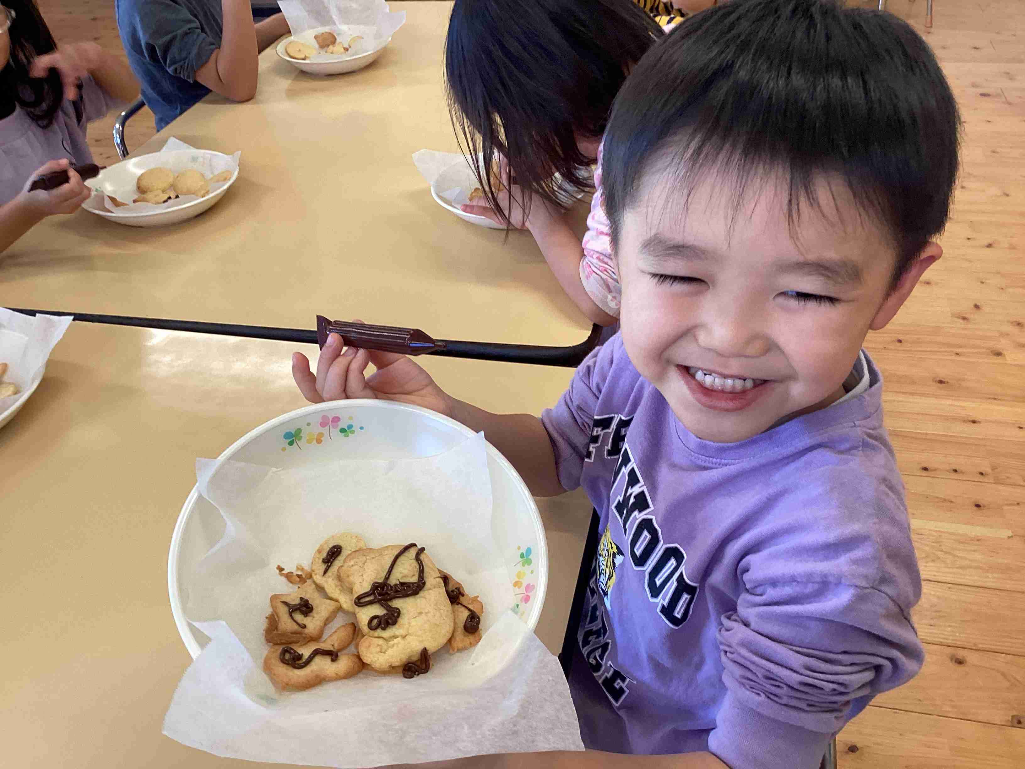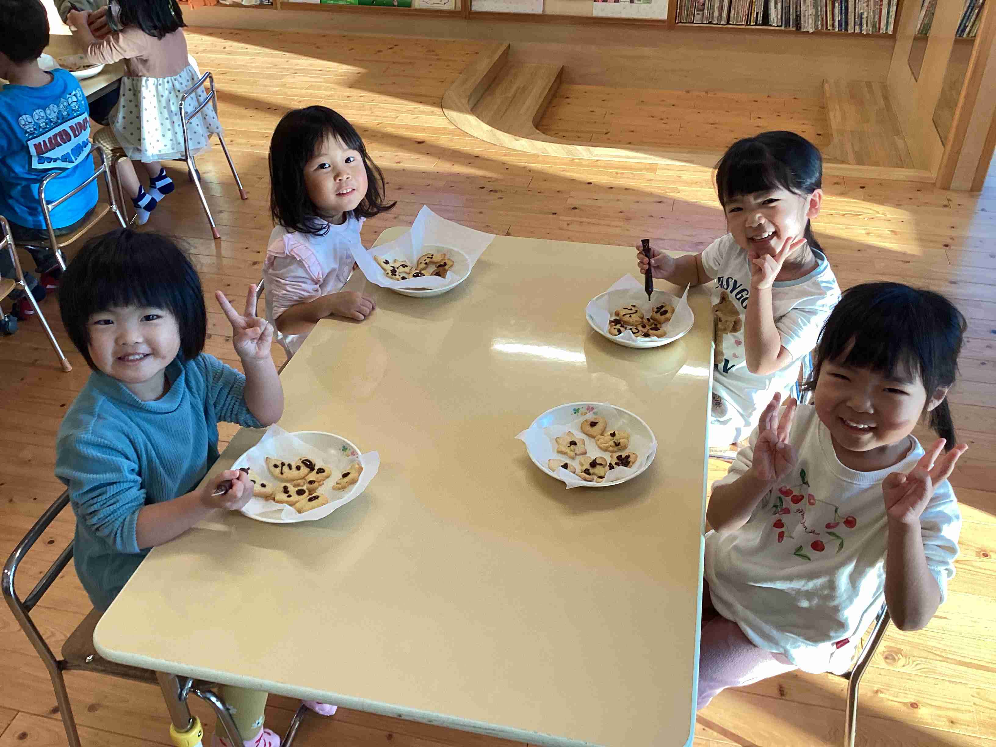 10月30日(木)きりん・ぱんだ組のクッキング・・・収穫したかぼちゃを入れた特製クッキーを作りました。生地の型抜きが一番楽しいと言いながら、何種類もの型を使って量産体制! それを給食の先生に焼いてもらい、午後からはチョコペンで落書きも楽しみ、オリジナルかぼちゃクッキーの完成・・・からの「いただきます!」で「ちょっと、固いな・・・」と言いながら食べました。