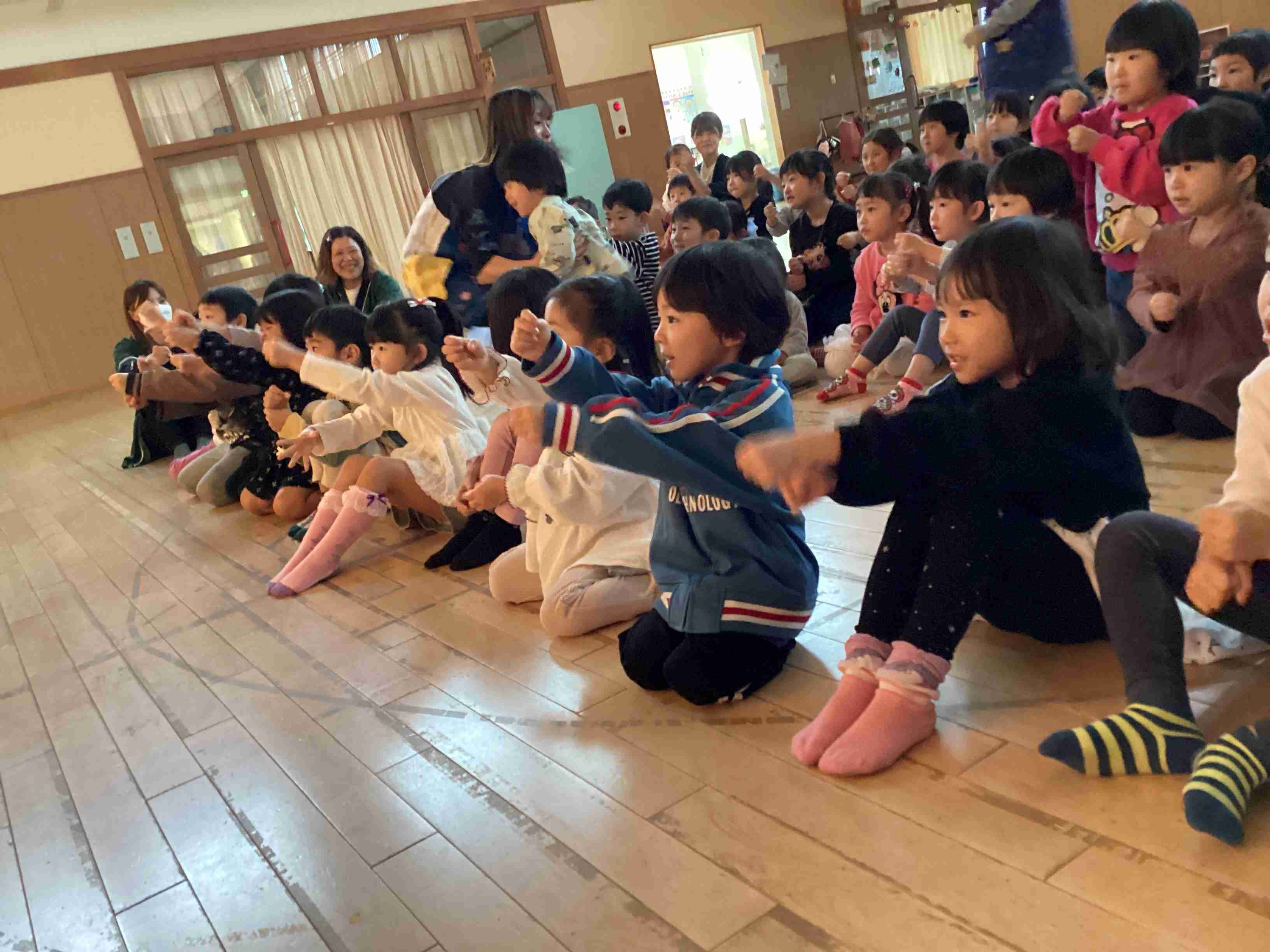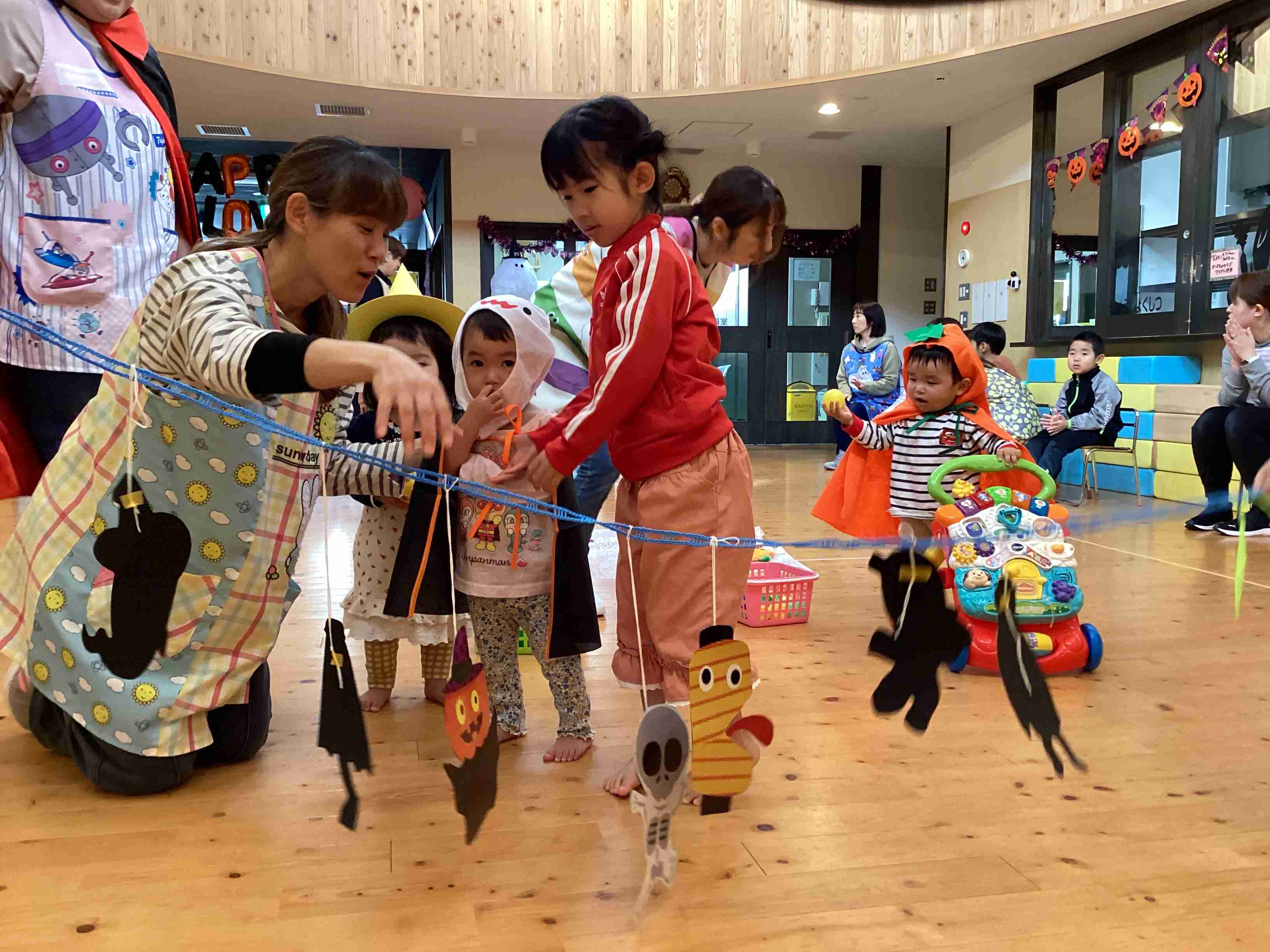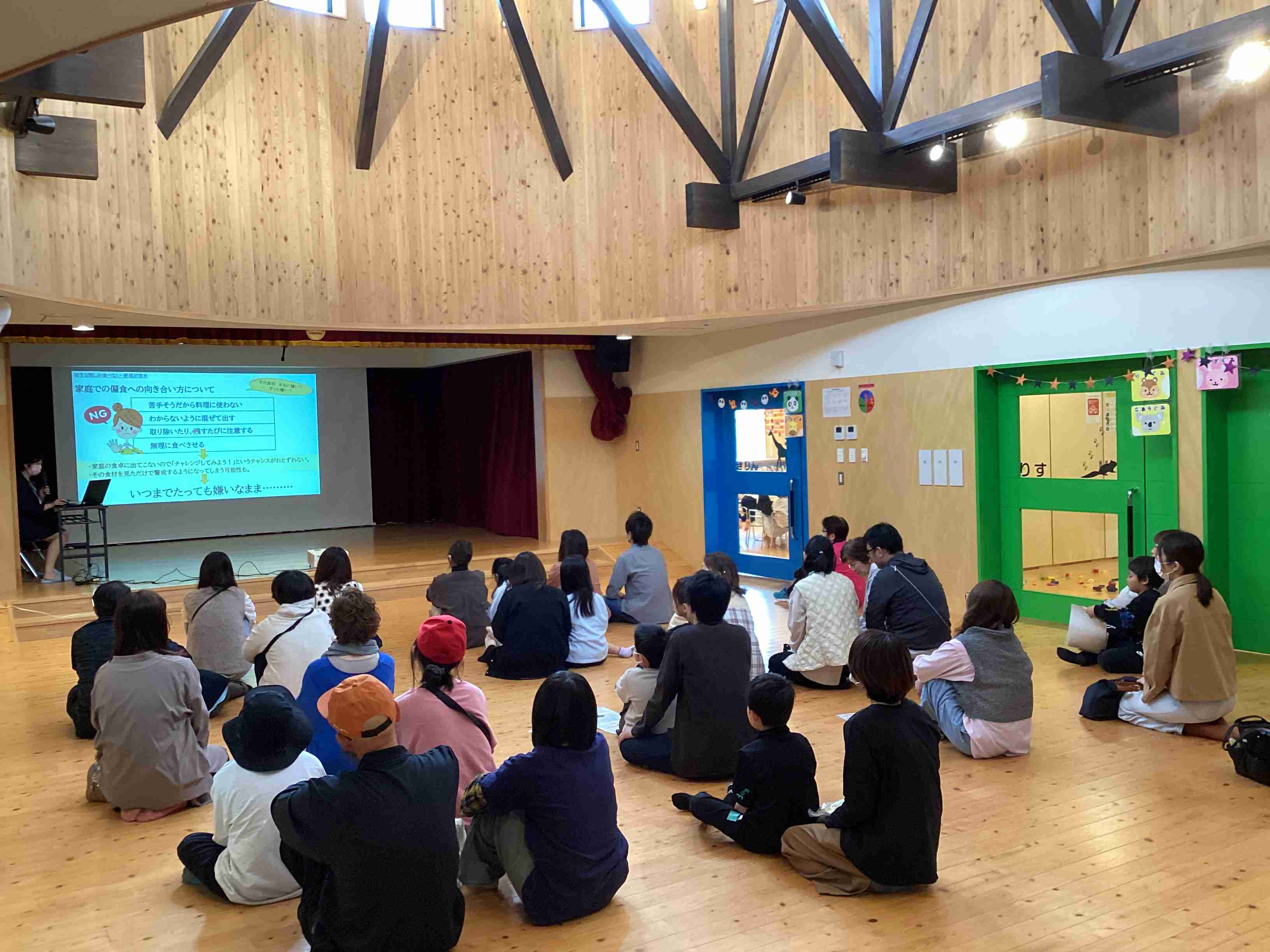 10月11日(土)参観日です。参観の前に保護者を対象に弘前市健康こども部・健康増進課・健康づくり総合推進係・管理栄養士 小山内さんに「幼児食育健康講座」と題してこどもの食事について講義していただきました。とても参考になるお話でした。その後は各クラスでの参観です。ぞう組はげんき先生の「体操教室」です。保護者と一緒に運動遊びを行ないました。家でできる運動遊びをたくさん教えていただきました。ぱんだ・きりん組は「ハロウィン」をテーマにした活動を見てもらいました。未満児組はお買い物ごっこを保護者と一緒に楽しみました。