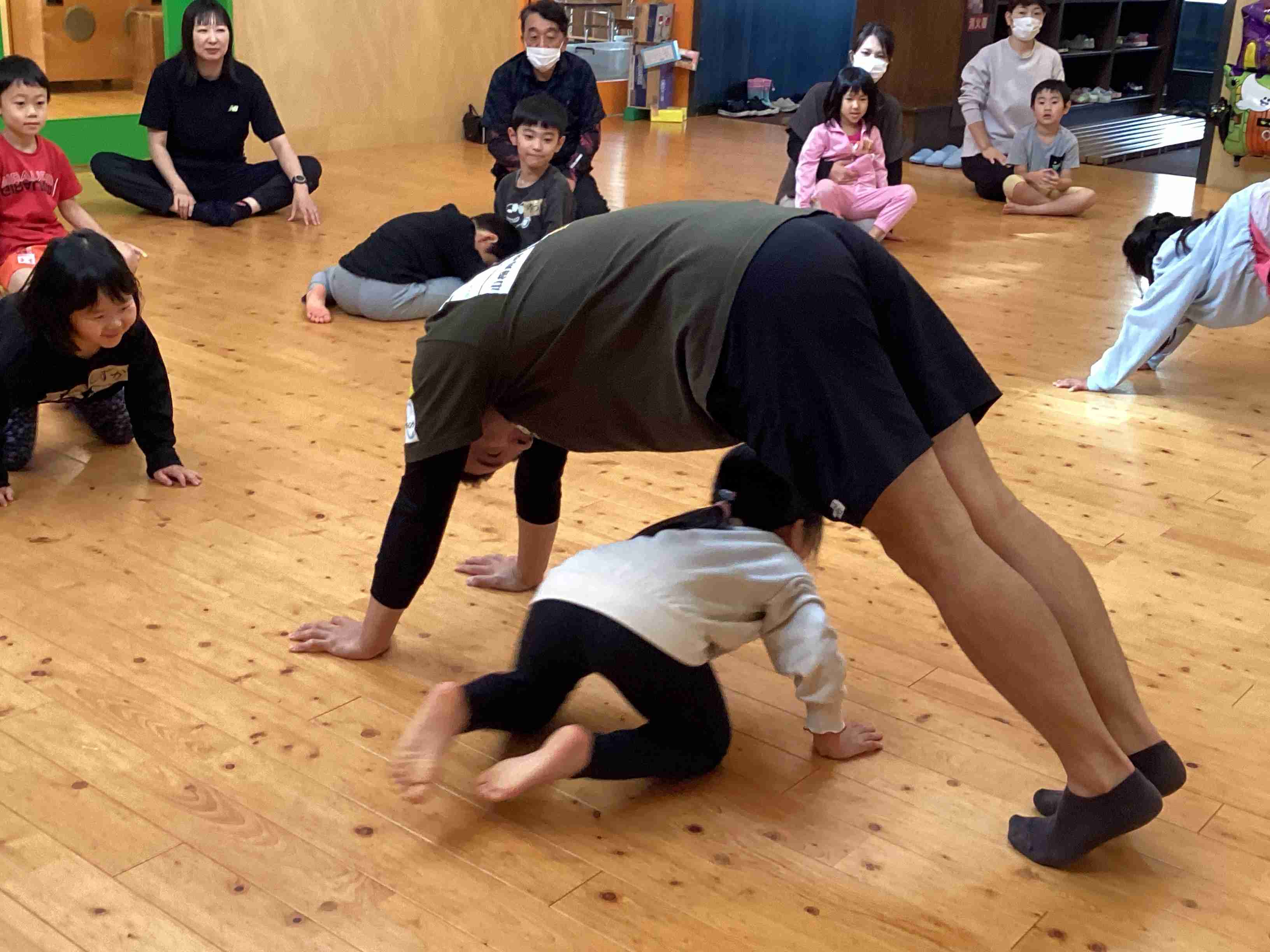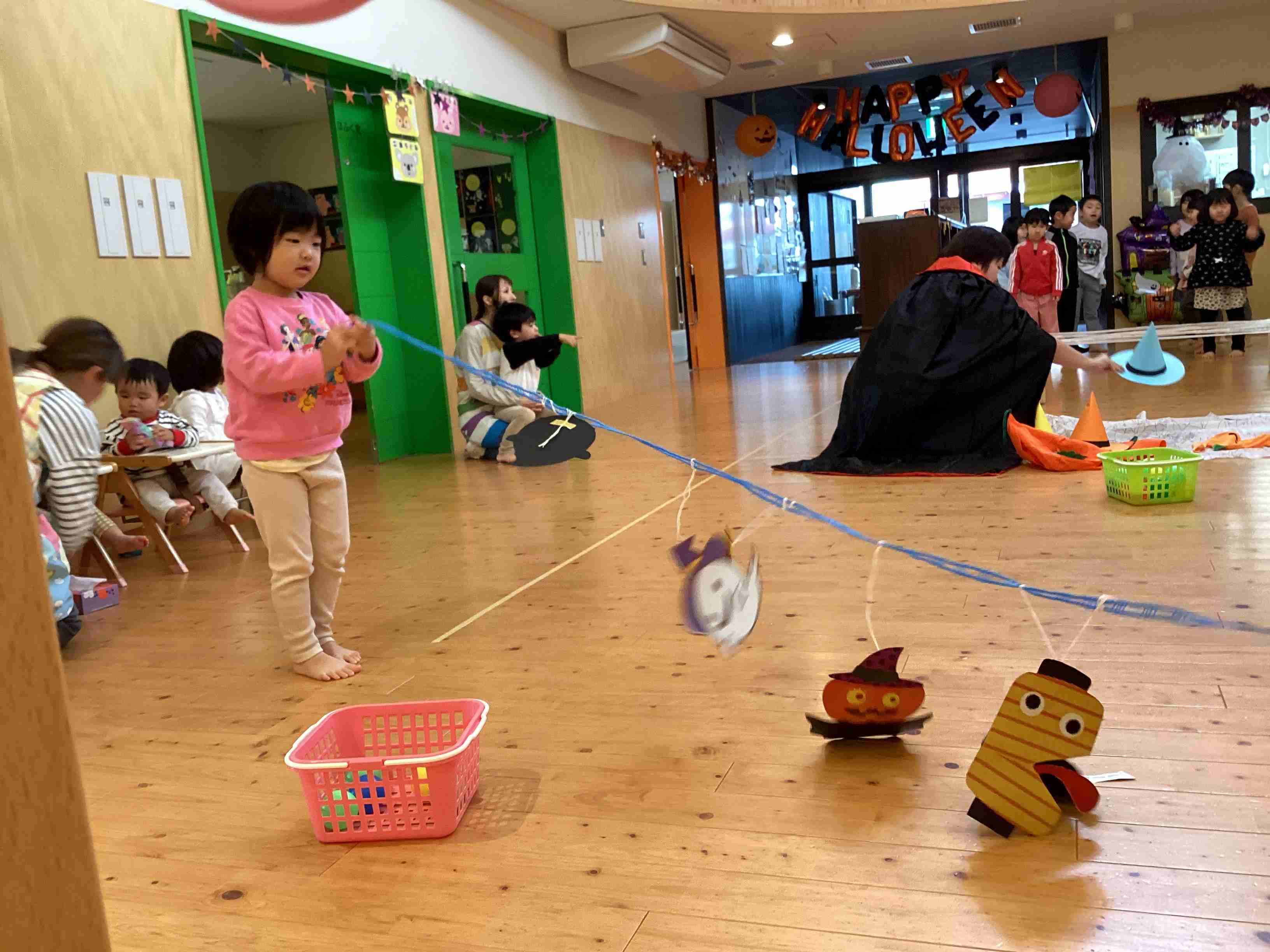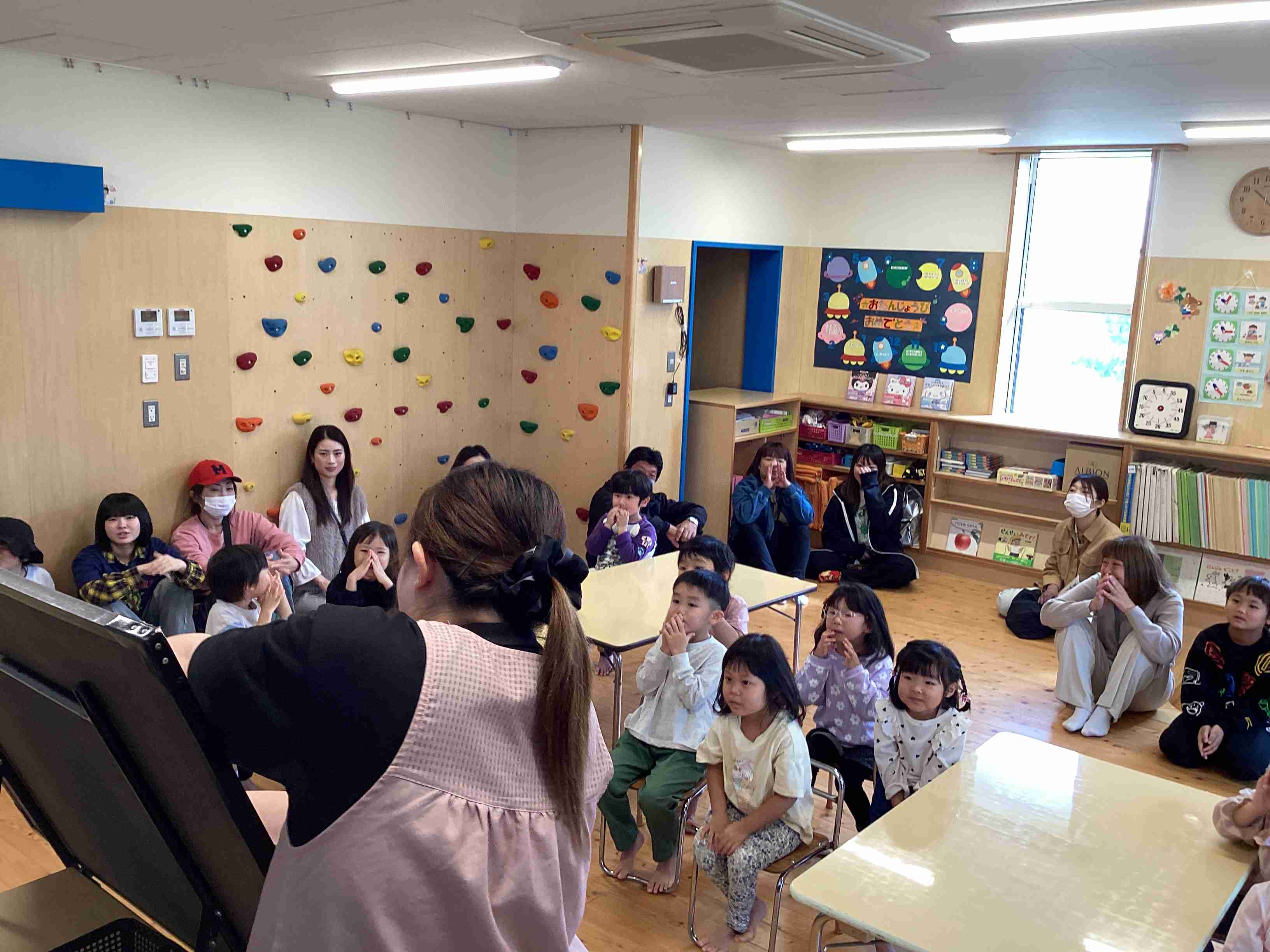 10月11日(土)参観日です。参観の前に保護者を対象に弘前市健康こども部・健康増進課・健康づくり総合推進係・管理栄養士 小山内さんに「幼児食育健康講座」と題してこどもの食事について講義していただきました。とても参考になるお話でした。その後は各クラスでの参観です。ぞう組はげんき先生の「体操教室」です。保護者と一緒に運動遊びを行ないました。家でできる運動遊びをたくさん教えていただきました。ぱんだ・きりん組は「ハロウィン」をテーマにした活動を見てもらいました。未満児組はお買い物ごっこを保護者と一緒に楽しみました。