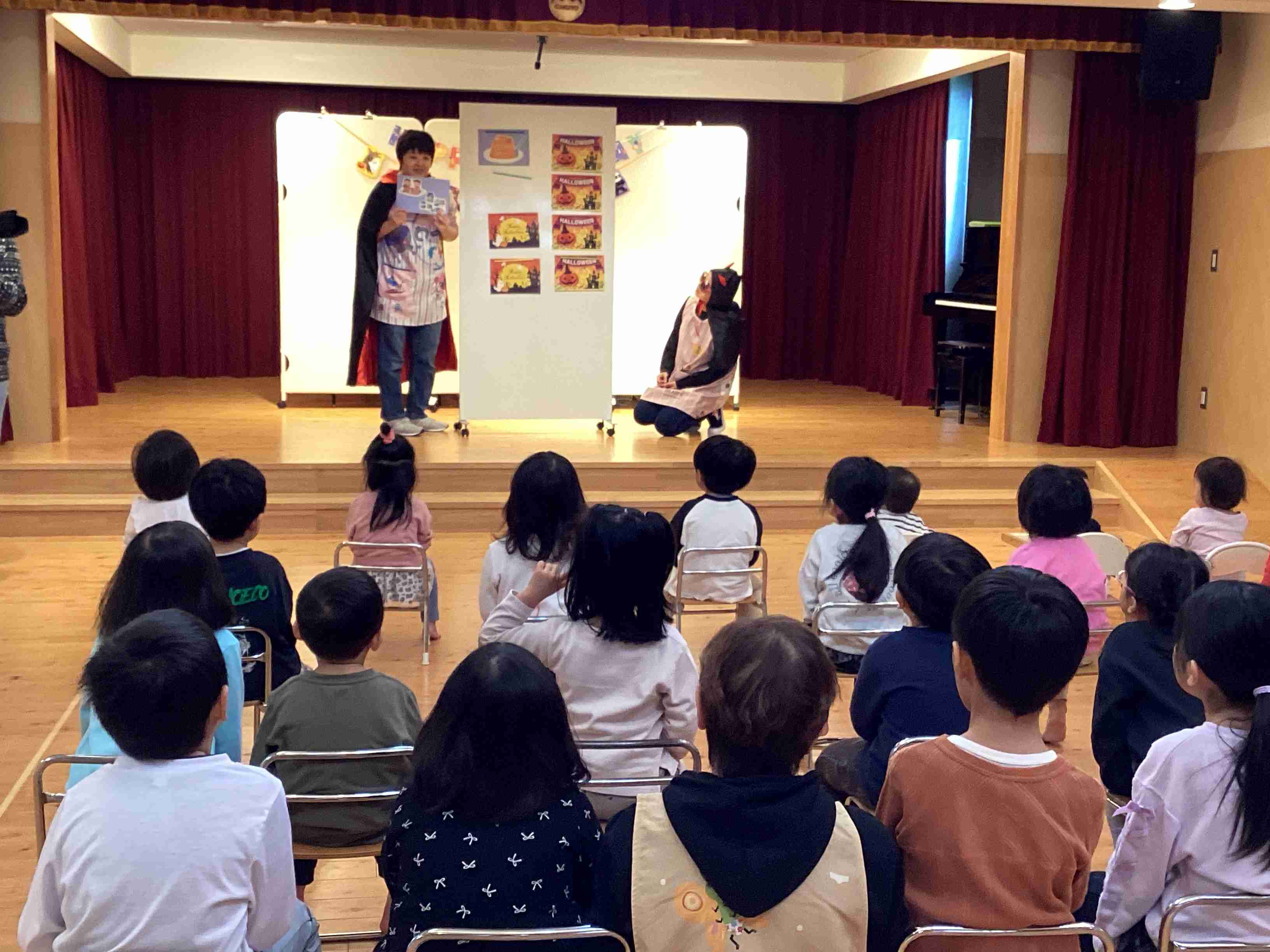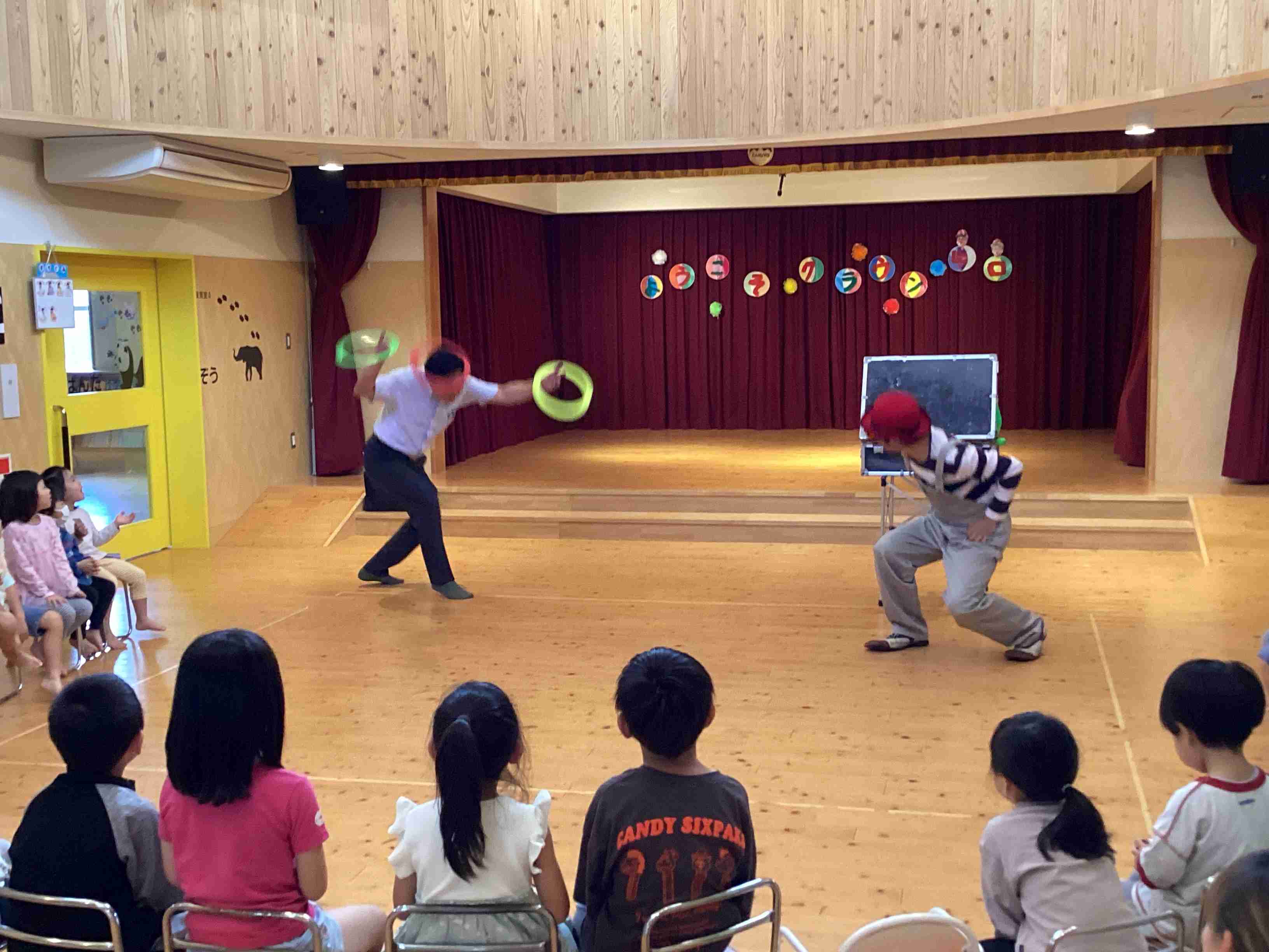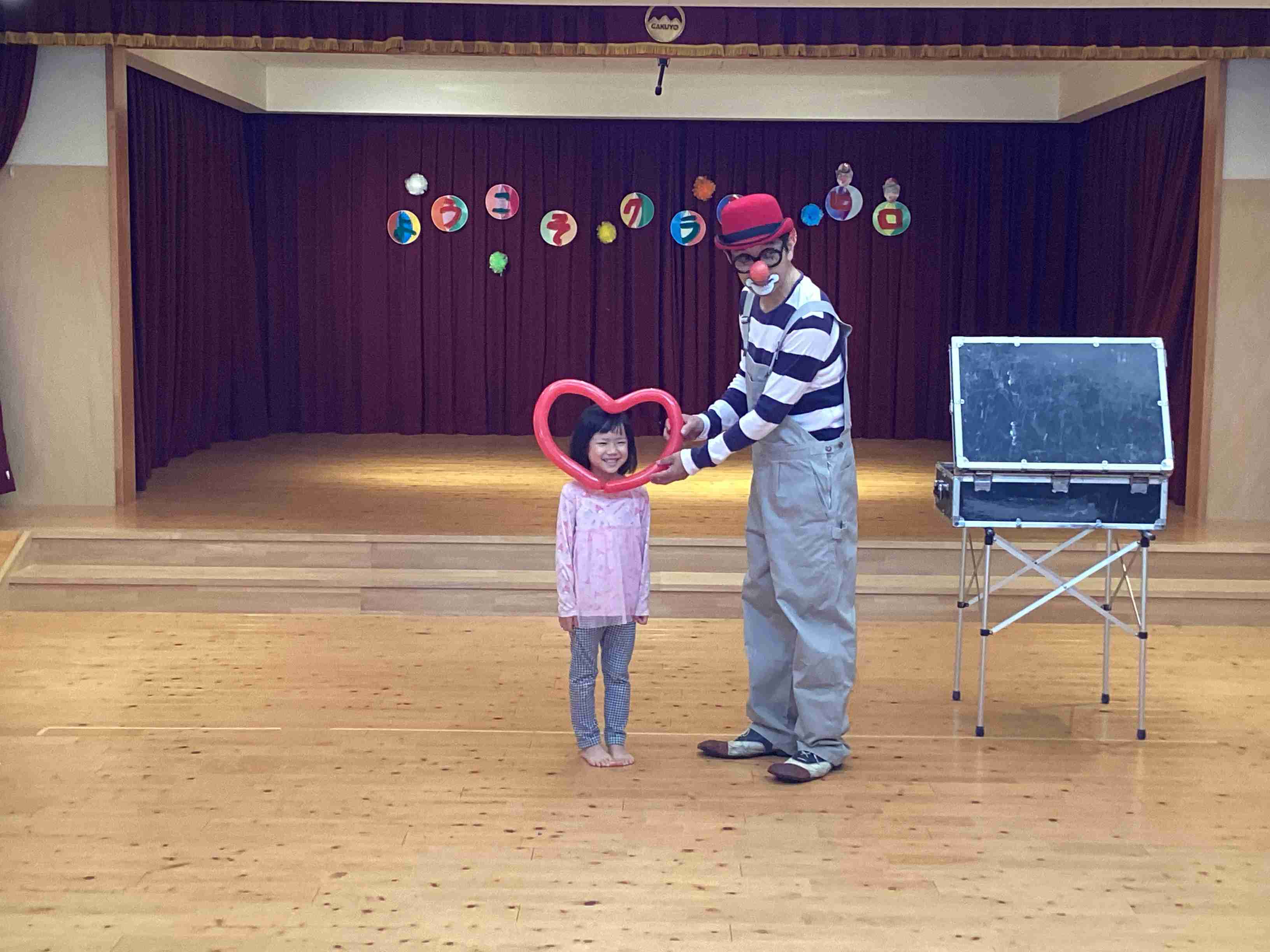 9月30日(火)前に日からステージを飾って準備をして今日とうとうこの日を迎えました。「クラウン ヒロ」(ピエロ)パフォーマンスショーの日です。ヒロさんのお心遣いで子どもたちとより近く臨場感たっぷりにパフォーマンスをしてくれるということで、いつもと違う椅子の並べ方に子どもたちもやや緊張の様子でしたが、参加型のパフォーマンスに登場から爆笑の連続でした。パントマイムあり、ジャグリングあり、バルーンアートありとまじかに見て大興奮の子どもたちでした。 クラウンヒロさん また来てね~~~!