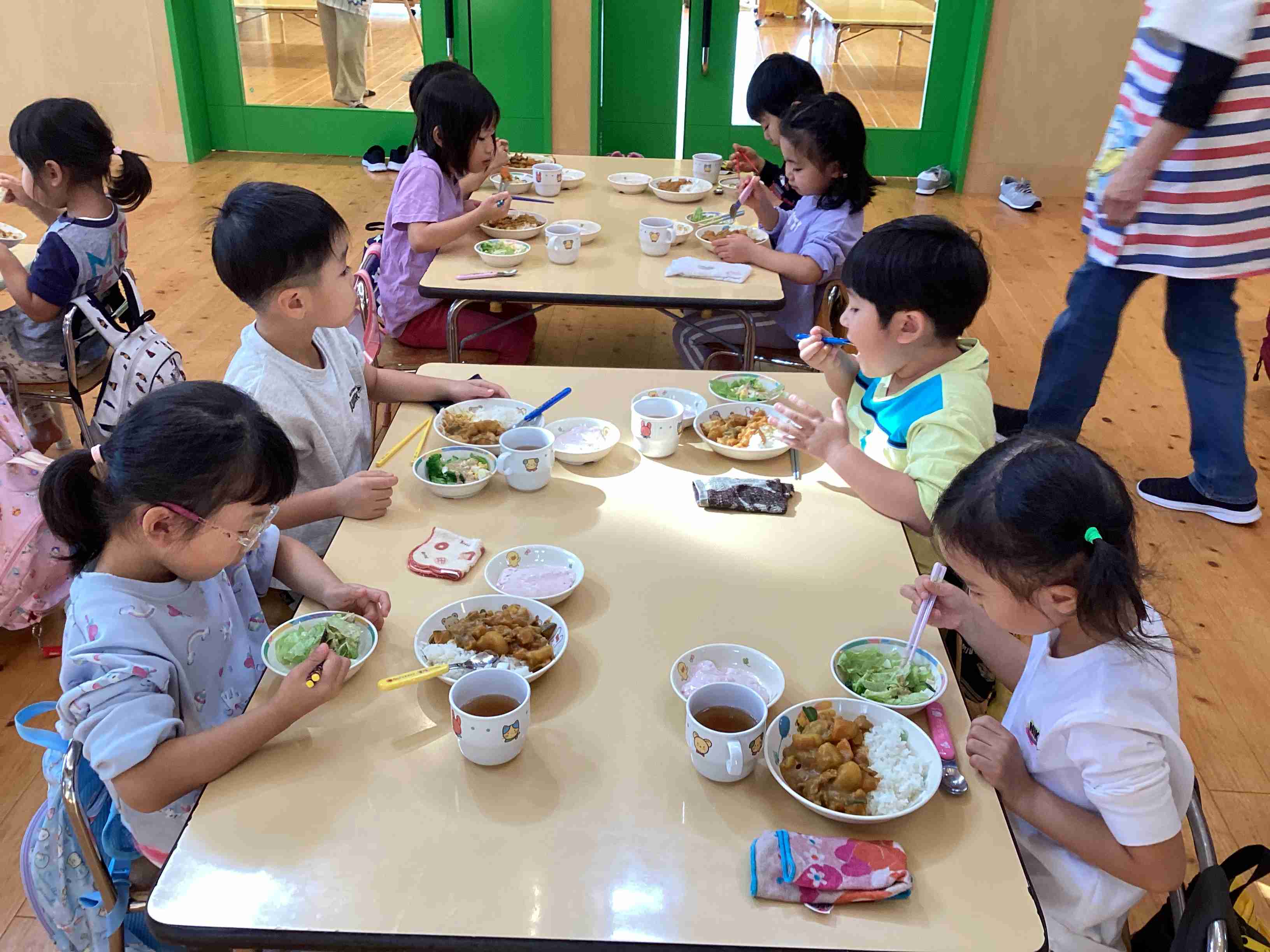 10月15日(水)カレークッキングをしました。ぞう組は畑でとれたじゃがいも・かぼちゃなどを洗うところからスタート! 皮をむく・切るなどピーラーやはじめての包丁で下ごしらえが今回の大きな仕事です。途中、たまねぎチームは目をゴシゴシしはじめました。・・・そっかぁ~!たまねぎの成分が目にしみたんだ~(これもいい経験ですよ!) 緊張の包丁作業の次は、鍋で煮込みます。みんなの愛情も入れながら、コトコト煮込んで完成しました。 ぱんだ組はサラダ担当で、レタスをちぎって、きゅうりを包丁で切る。こちらも初包丁にハラハラドキドキしながらも、厚めのきゅうりのスライスができました。 きりん組はフルーチェ担当で、牛乳を入れて混ぜ混ぜしたよ。 みんなが役目を持って調理しました。 みんなからはいつも以上に「おいⅭ~!」の声が聞かれました。