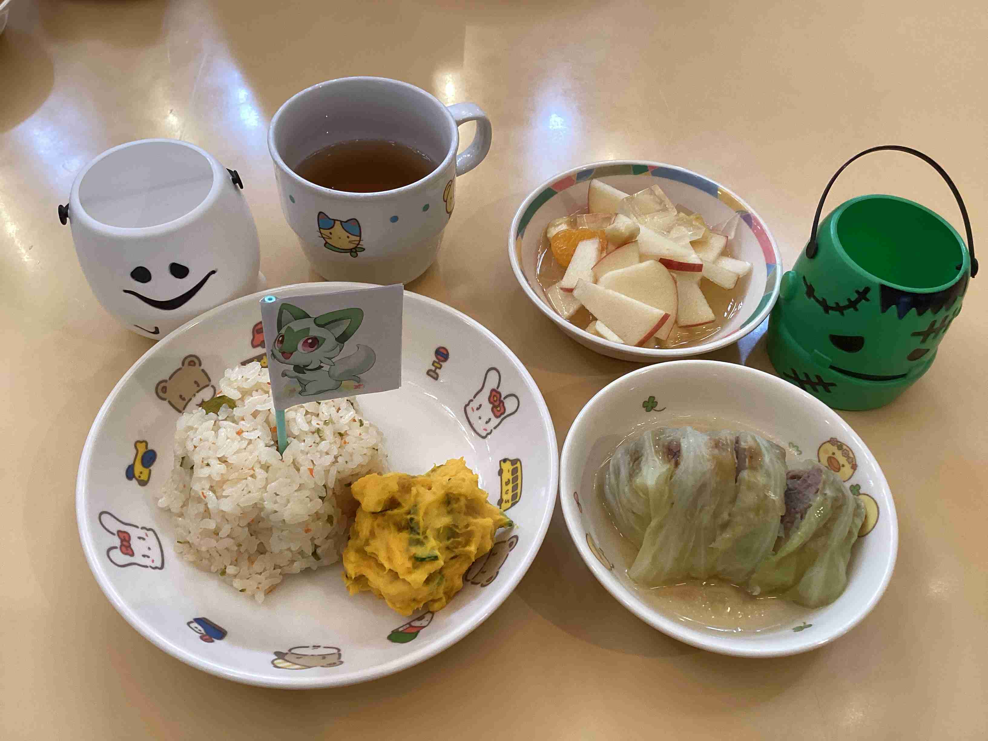 10月21日(火) 10月の誕生会は「ハロウィン」をテーマに仮装やパネルシアター、誕生児の紹介もぜ~んぶハロウィンだぞ~ でも怖くないかわいいお化けさんがたくさん現れました。給食メニュー:ピラフ・ロールキャベツ・かぼちゃサラダ・フルーツポンチ