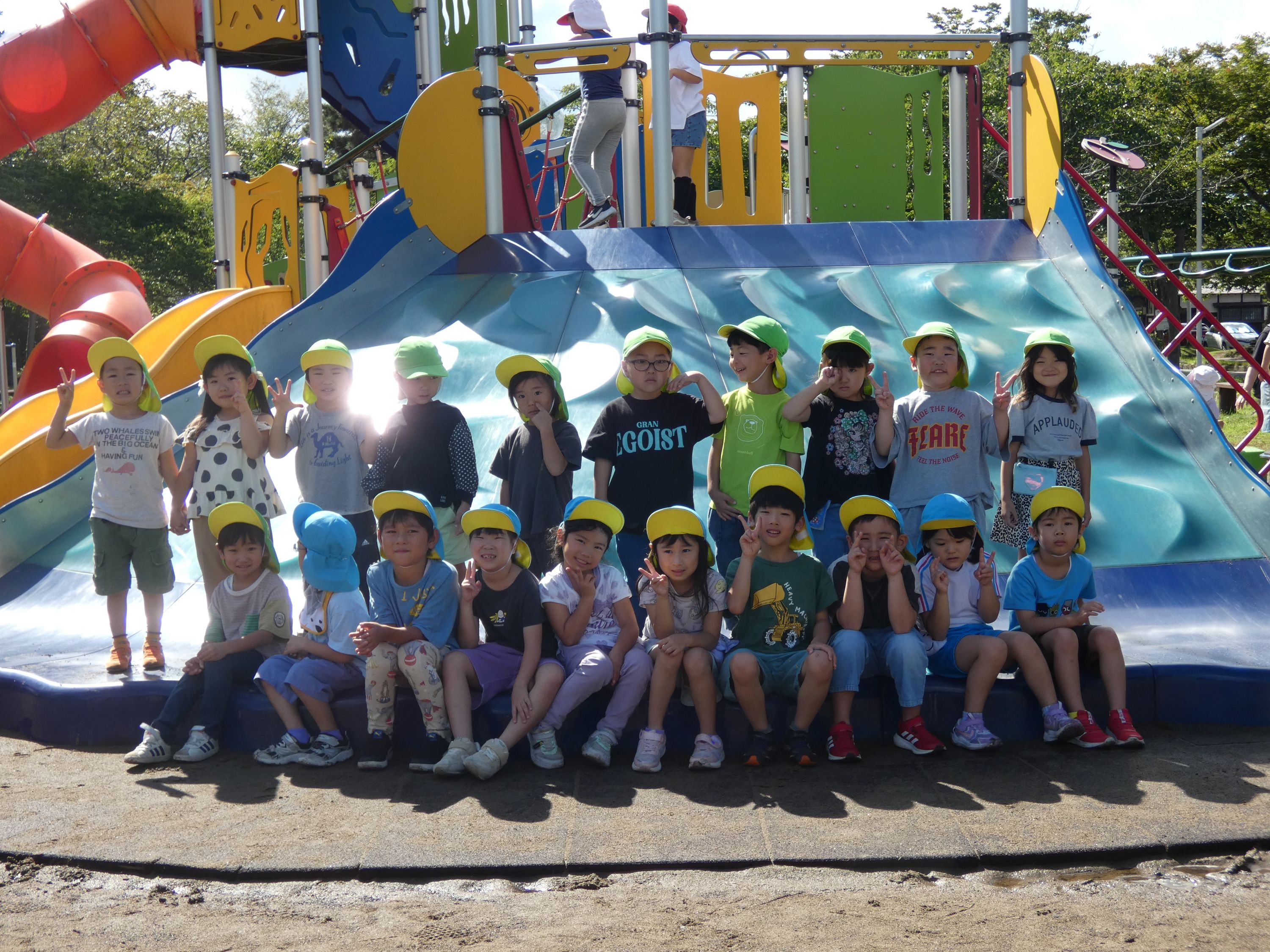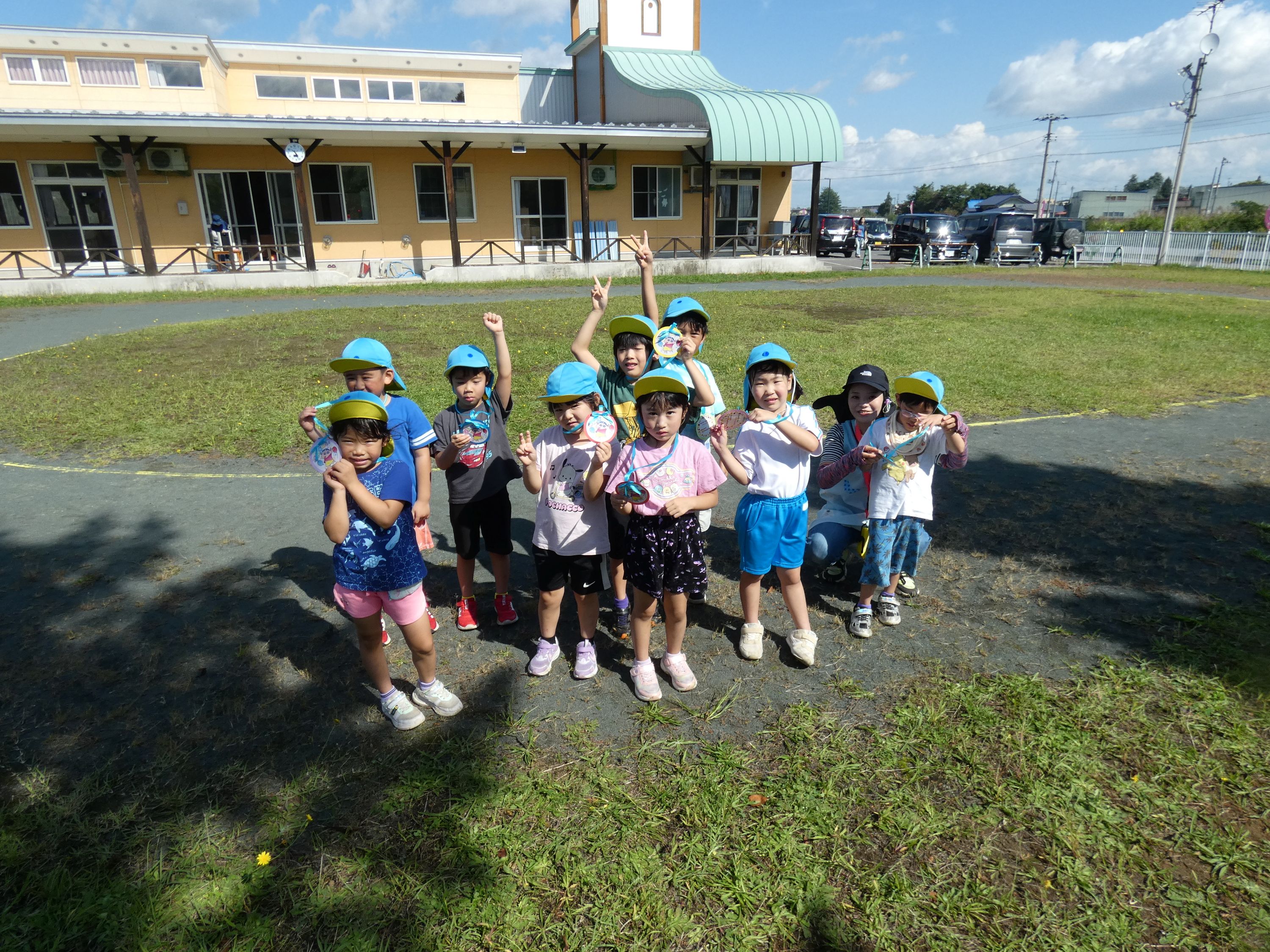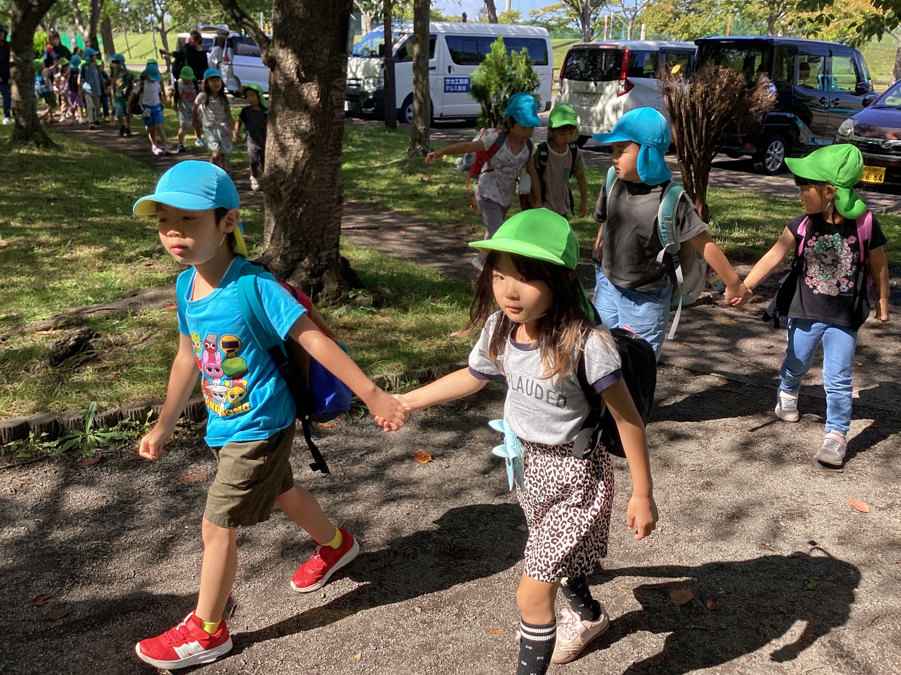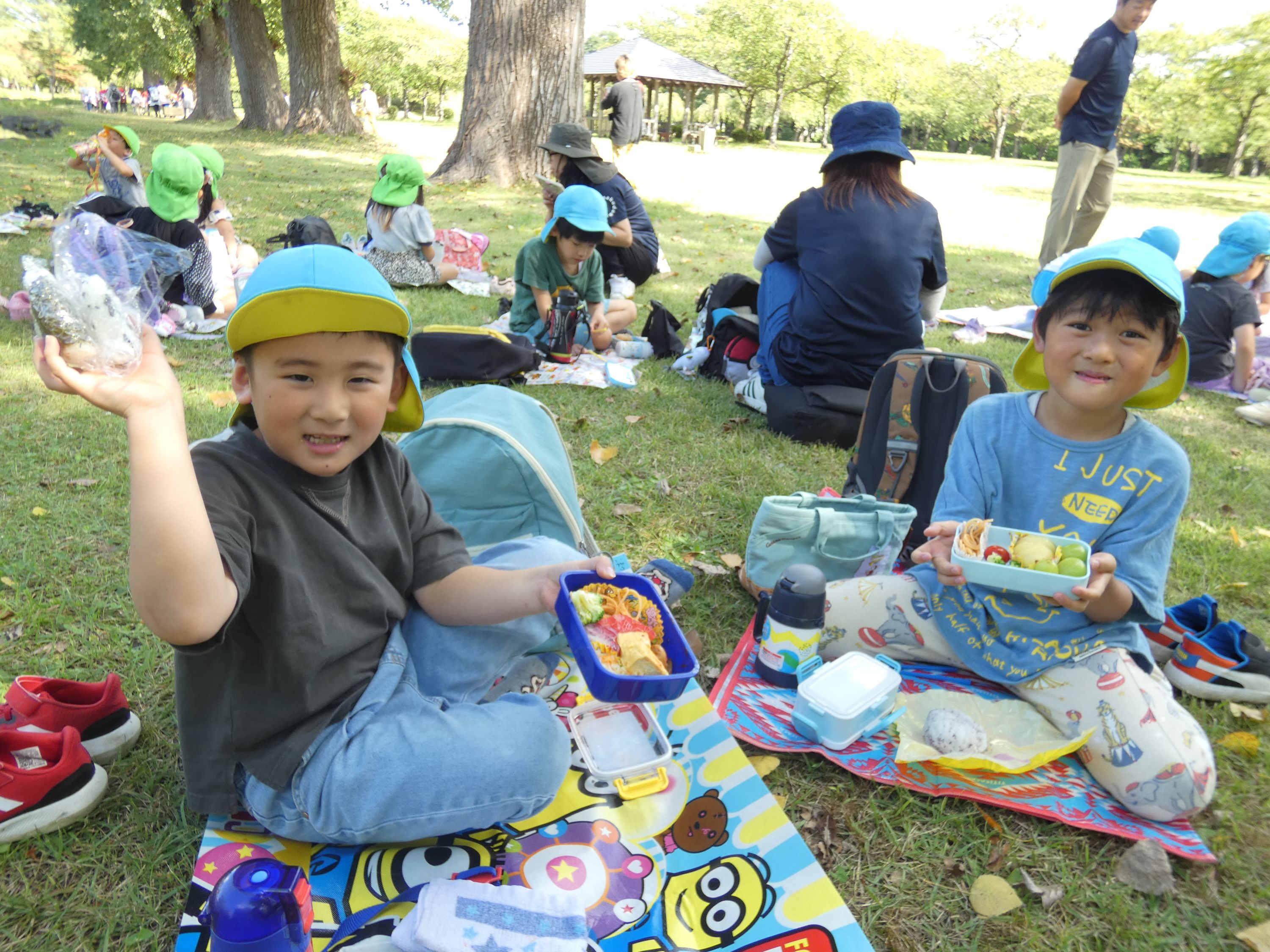 お天気に恵まれた9月30日(火)ぞう組とぱんだ組さんは、五所川原市にある菊が丘運動公園へ遠足に行って来ました。バスの中では、季節のうたを次々うたい、スリーヒントクイズで盛り上がり、あっという間に到着。整備された公園では立派な遊具があり子どもたちの好奇心が全開!着いてすぐ、集合写真を撮り「さあ!遊びましょう~」の合図で目当ての遊具にすばやく並んでいました。近くには小川が流れていてよく見ると、ザリガニがいました。たくさん遊んだ後は愛情たっぷりのお弁当タイム。友達と見せ合いながら、おいしそうに食べていました。お弁当の後は、おやつタイム!楽しすぎてあっという間に時間になりましたが、「またお家の人と来ようね」と帰路に、、、たくさん身体を動かしたので、帰りのバスでは疲れて熟睡する子もいました。遠足楽しかったね。