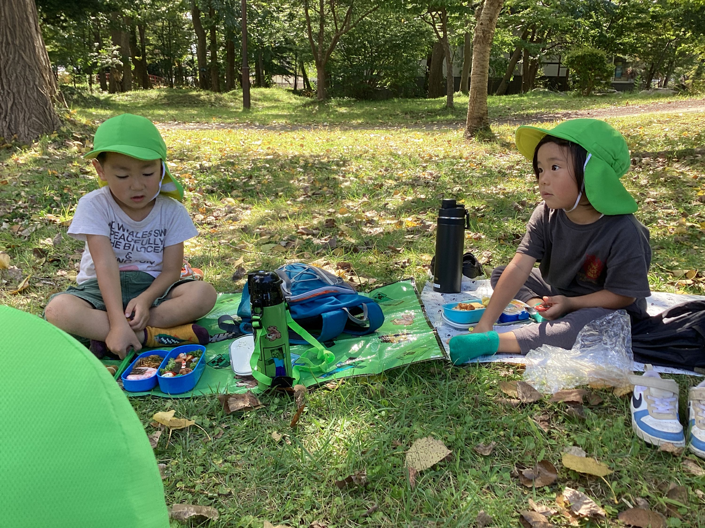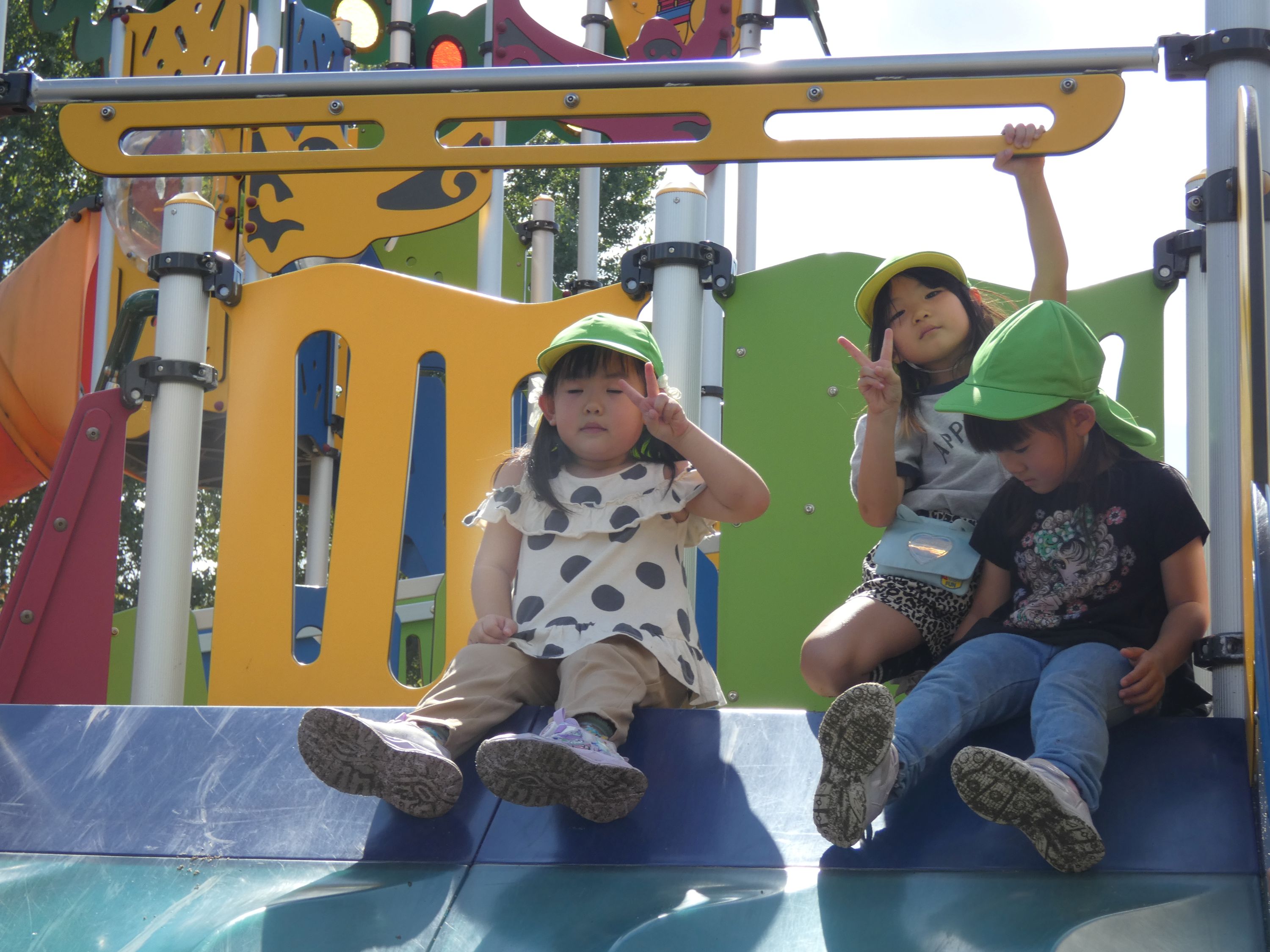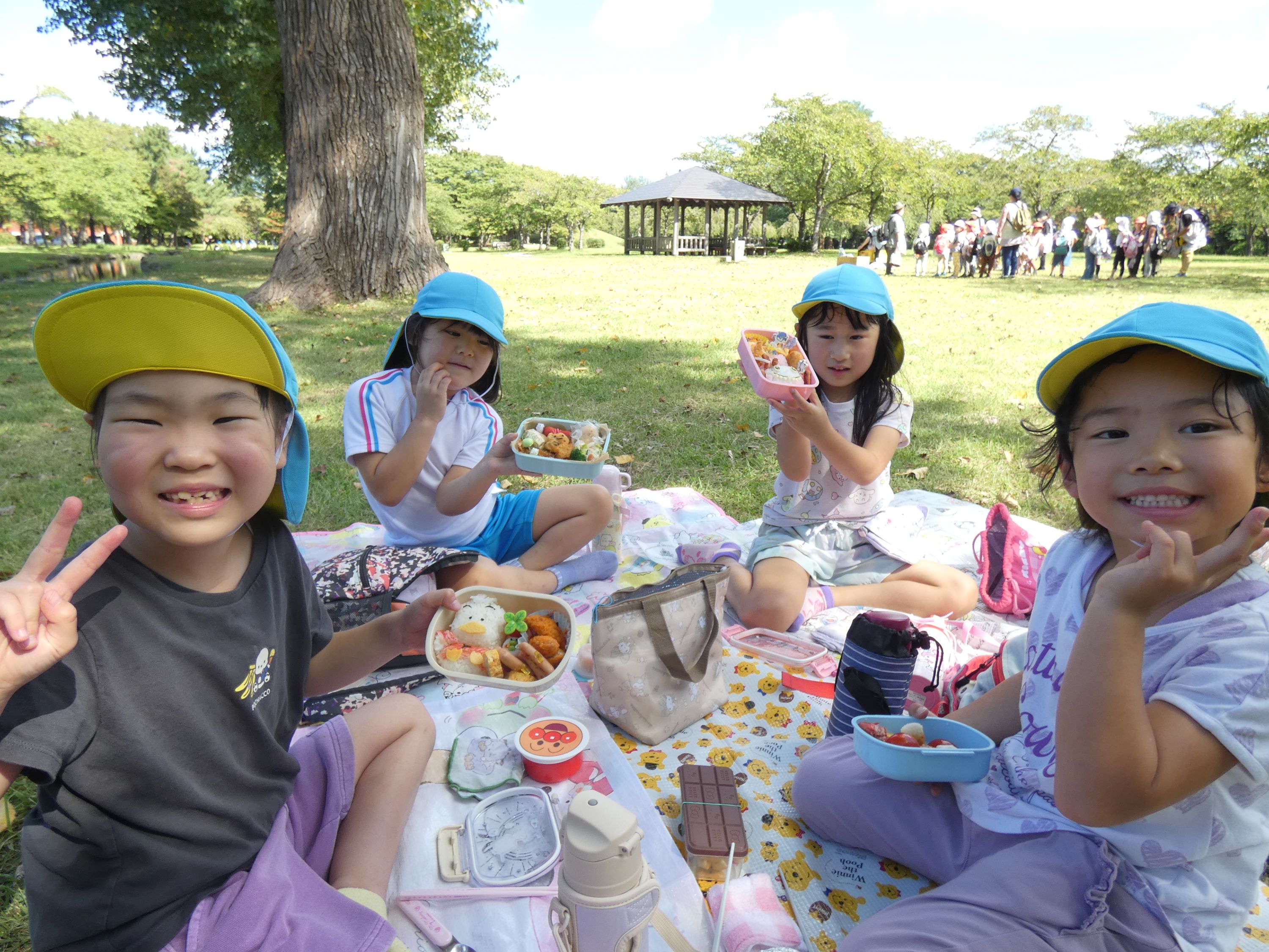 お天気に恵まれた9月30日(火)ぞう組とぱんだ組さんは、五所川原市にある菊が丘運動公園へ遠足に行って来ました。バスの中では、季節のうたを次々うたい、スリーヒントクイズで盛り上がり、あっという間に到着。整備された公園では立派な遊具があり子どもたちの好奇心が全開!着いてすぐ、集合写真を撮り「さあ!遊びましょう~」の合図で目当ての遊具にすばやく並んでいました。近くには小川が流れていてよく見ると、ザリガニがいました。たくさん遊んだ後は愛情たっぷりのお弁当タイム。友達と見せ合いながら、おいしそうに食べていました。お弁当の後は、おやつタイム!楽しすぎてあっという間に時間になりましたが、「またお家の人と来ようね」と帰路に、、、たくさん身体を動かしたので、帰りのバスでは疲れて熟睡する子もいました。遠足楽しかったね。