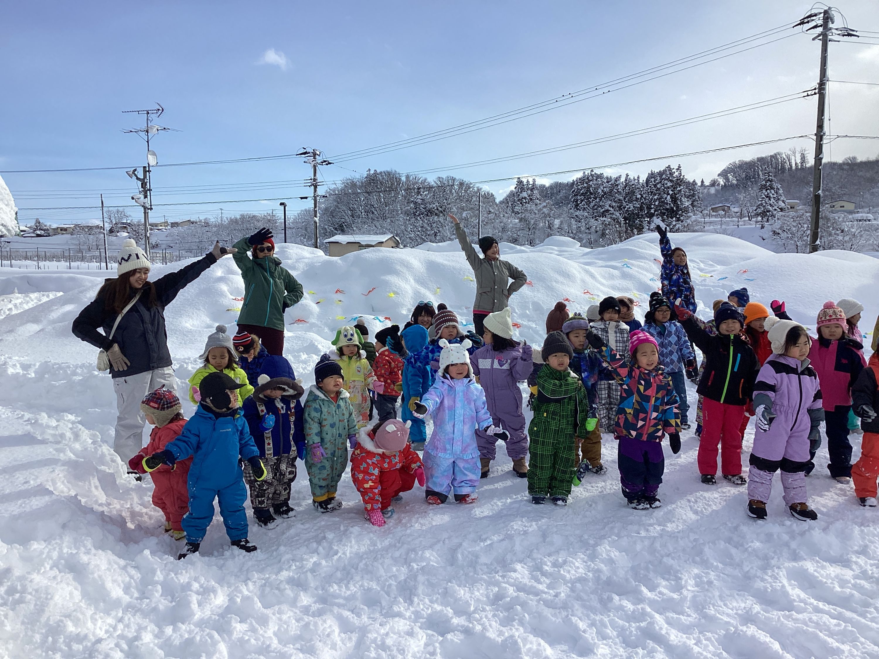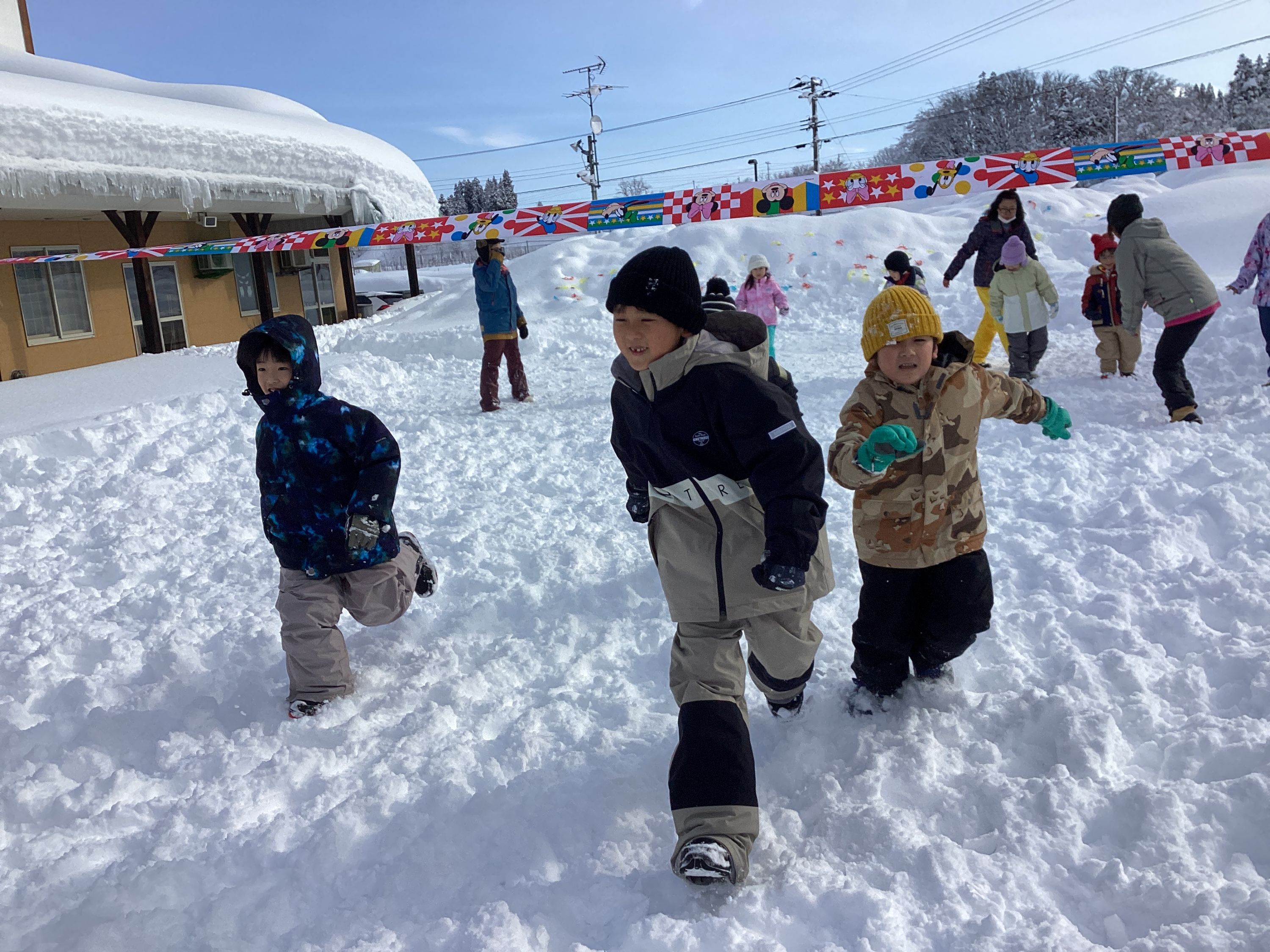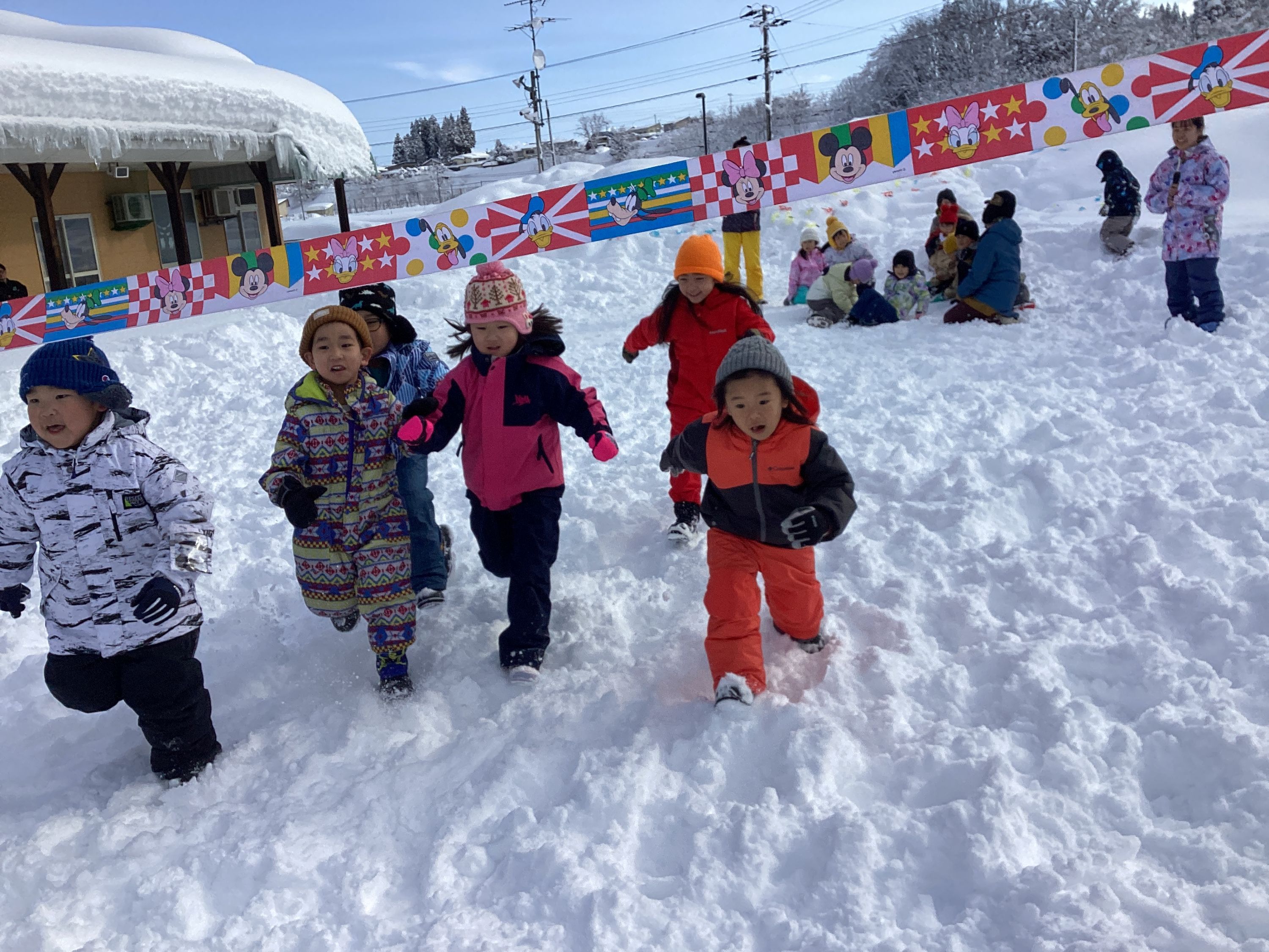 毎日雪が降り積もる日が続いていましたが、1月29日(木)の雪上運動会の日は、子どもたちの願いが届いてとてもいい天気になりました。はじめに、全員で「青のきらめき」を踊ってウオーミングアップ!身体が温まったら、こあら組さんから「よーいどん」ゴールテープに向かって走りました。次の競技は、高く積もった雪山にかくれたメダルを探しました。出てきたメダルが好きなキャラクターで「やったー!」「これじゃないのがいい!」とずーっと探す子も…やっと見つけて笑顔になり、最後はみんなで「これで、雪上運動会を終わります」と元気にあいさつできました。保護者の方も何人か見学にいらしてました。応援ありがとうございました。