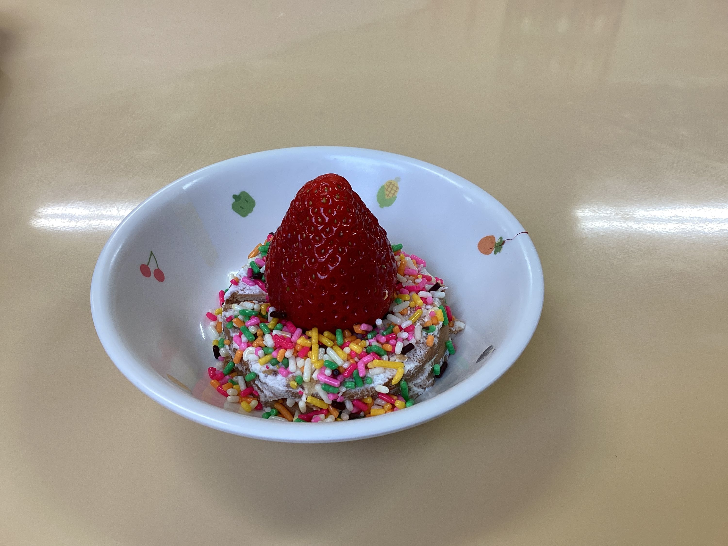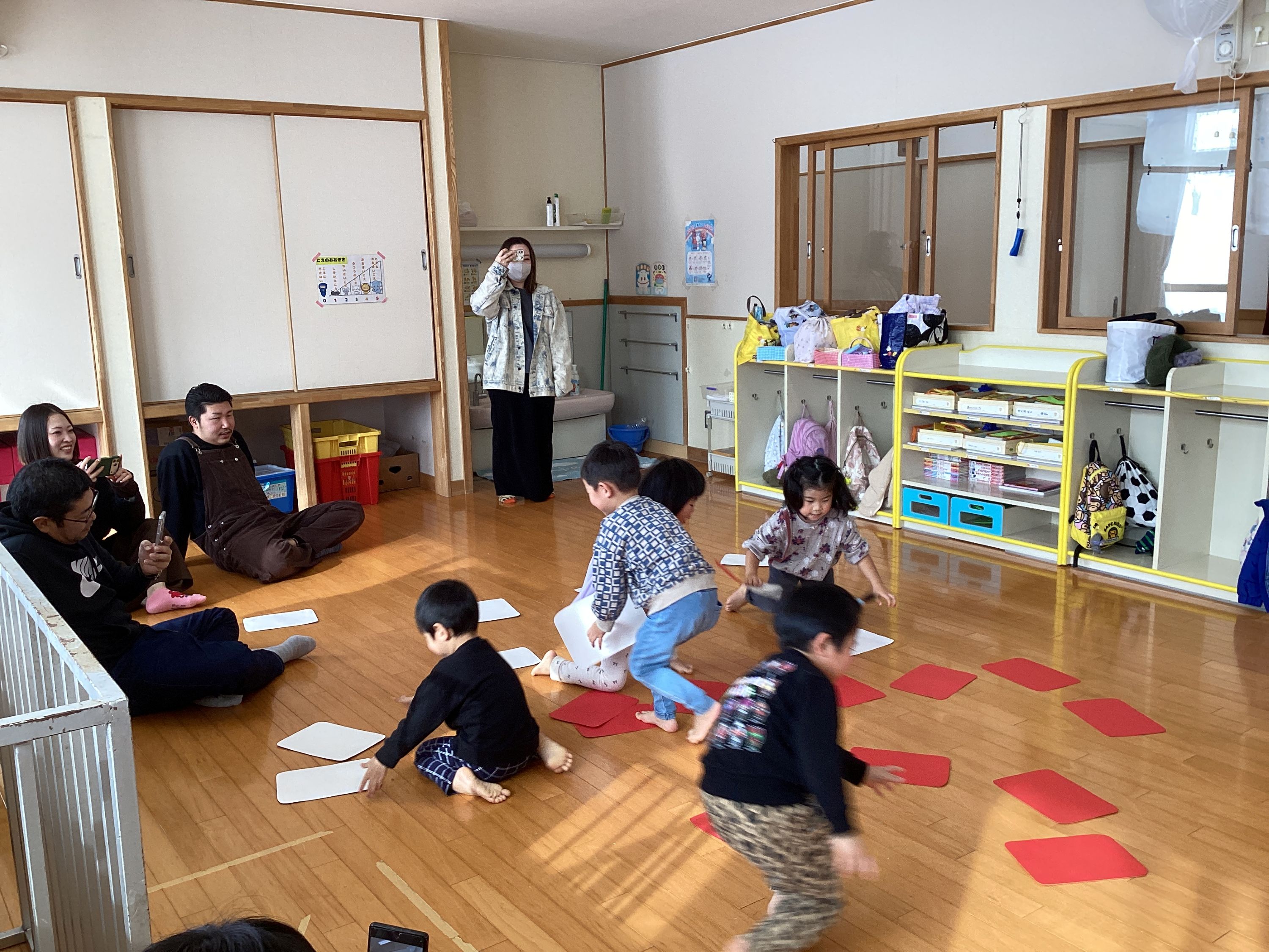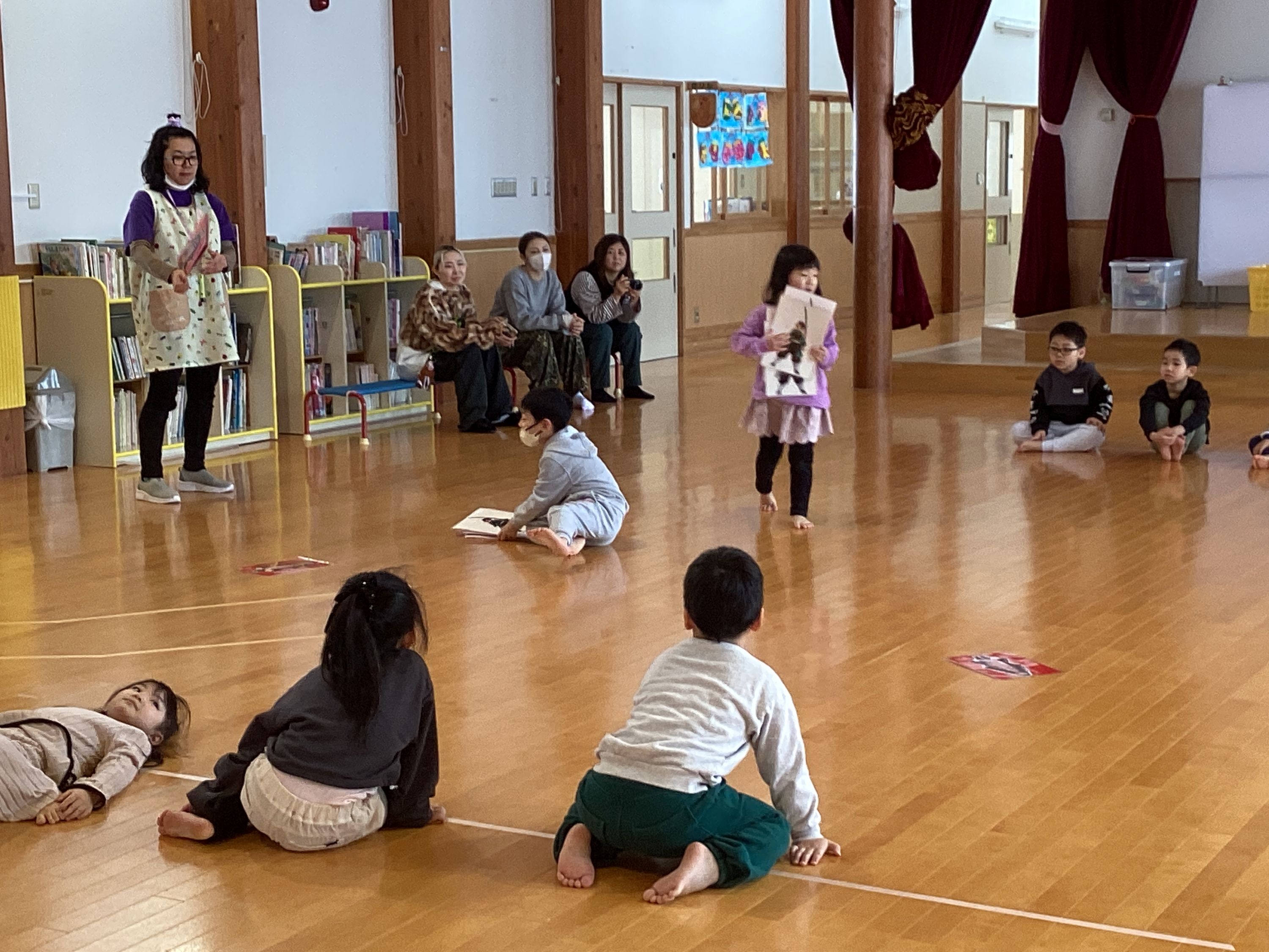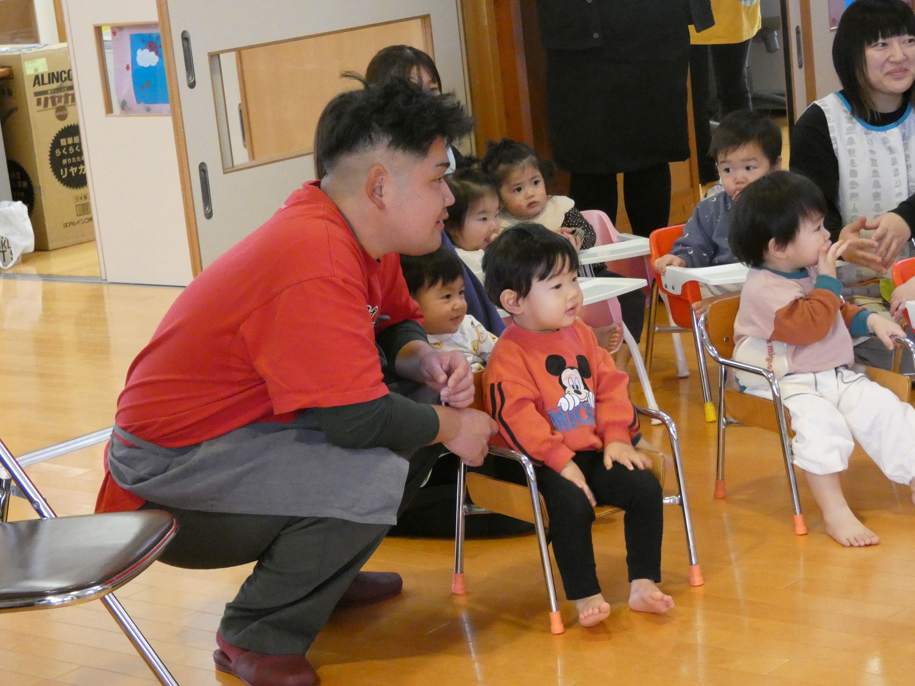 12月17日(水)は12月生まれのお友達の誕生会でした。相馬こども園では、なんと!一人だけの誕生児♡職員も子どもたちもみんな、全力でお祝いしました。今月のテーマは「トイストーリー」進行役の先生と主役の二人はウッディに扮しました。クイズの答えがポスターになっていて、紙を破っていくと答えが見えるので、見ているみんなは興味津々!「うたくんクイズ」で盛り上がりました。パネルシアターでは「どろん、にんじゃがっこう」を視聴し、変身するのはなんだろう?と質問に答えながら集中して見ていました。次のコーナーでは、先日行われた「クリスマスお遊戯会」できりん、うさぎ組が発表した「ばけばけばけばけばけたくん」の表現遊びを職員とうさぎ組が演じ大きな歓声が上がりました。そして、年長さんの女の子の遊戯「千本桜」にも挑戦した職員!和傘や扇子を手にしっとりと踊り、時にはアドリブで乗り切っている職員も~!見ている子どもたちから拍手と歓声が上がり、アンコールの声も‼最後はみんなで「お誕生日おめでとうございます。」で会を閉じました。給食は(アニマルオムハヤシ、オニオンリング、ミニサラダ、バナナパフェ)でした。