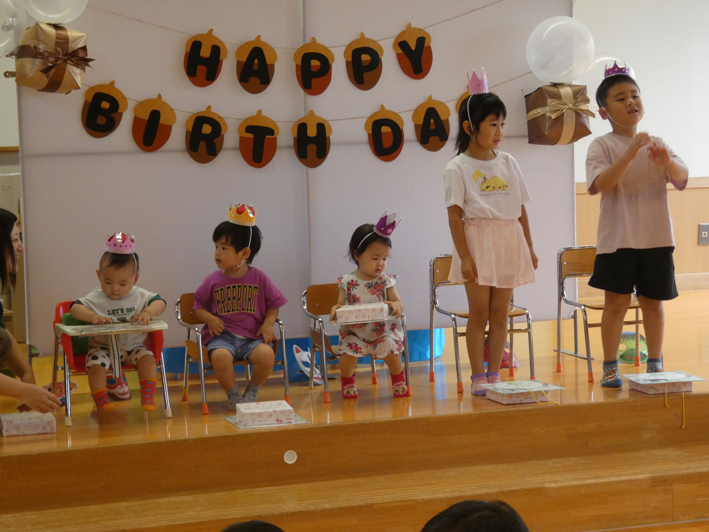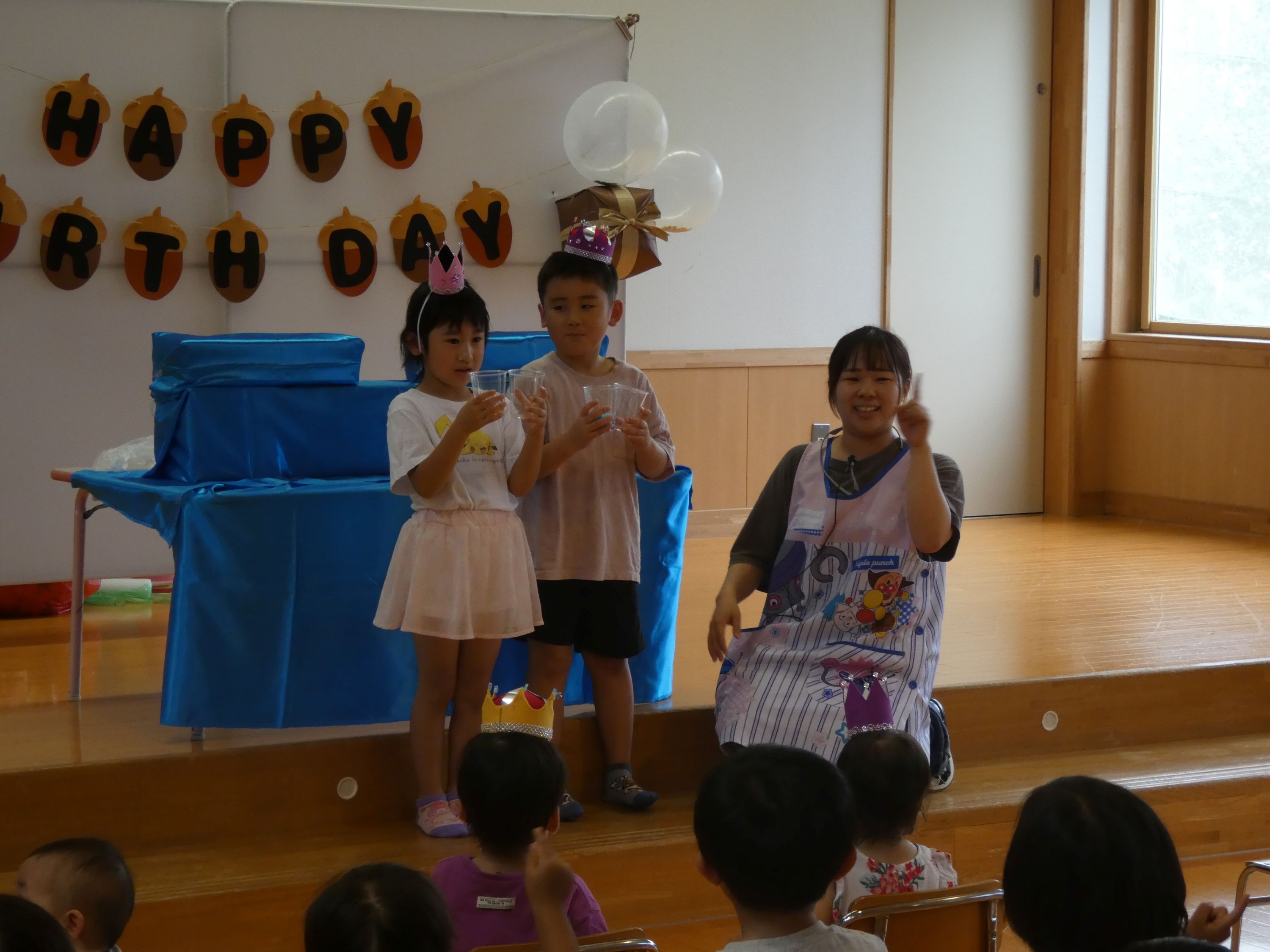 7月18日(金)は7月生まれのお友達の誕生会でした。ハッピーバースデーが装飾されたパーテーションの前に楽しい音楽で入場した誕生児。ワクワクしながらインタビューに答え、ニコニコ笑顔いっぱいでした。仲良しのお友達からプレゼントを受け取りますます笑顔に~。次はシアターにも参加です。「くいしんぼうおばけ」のシアターでおばけに扮し登場!冷蔵庫から次々出てきて、クイズを出して大活躍でした。最後はみんなで輪になり、「ガオガオオールスター」を踊りました。未満児クラスからぞう組さん、先生もみんな一緒で楽しそうでしたね。給食は(チーズバーガー、ドンキサラダ、ビシソワーズ、メロン)でした。