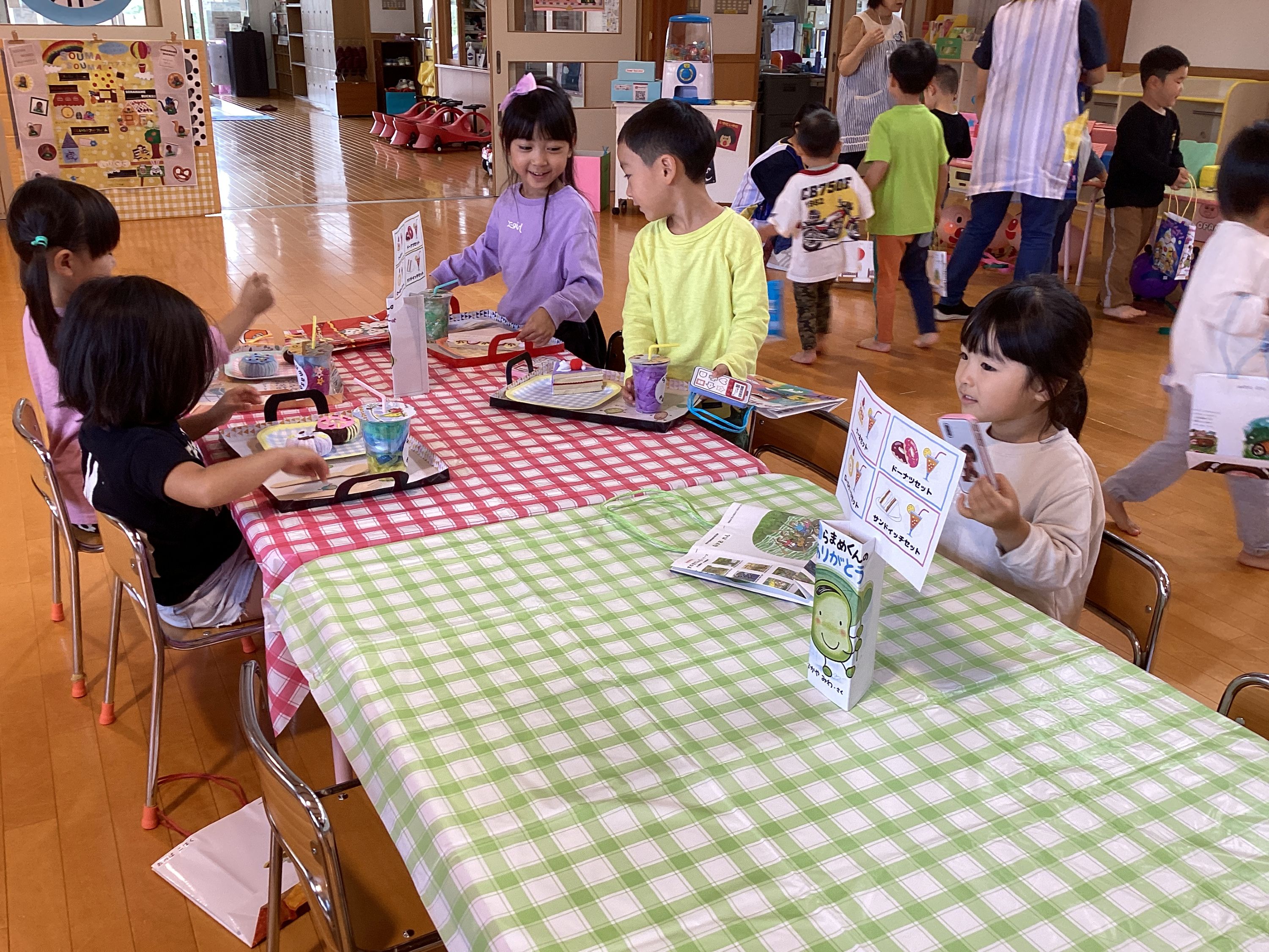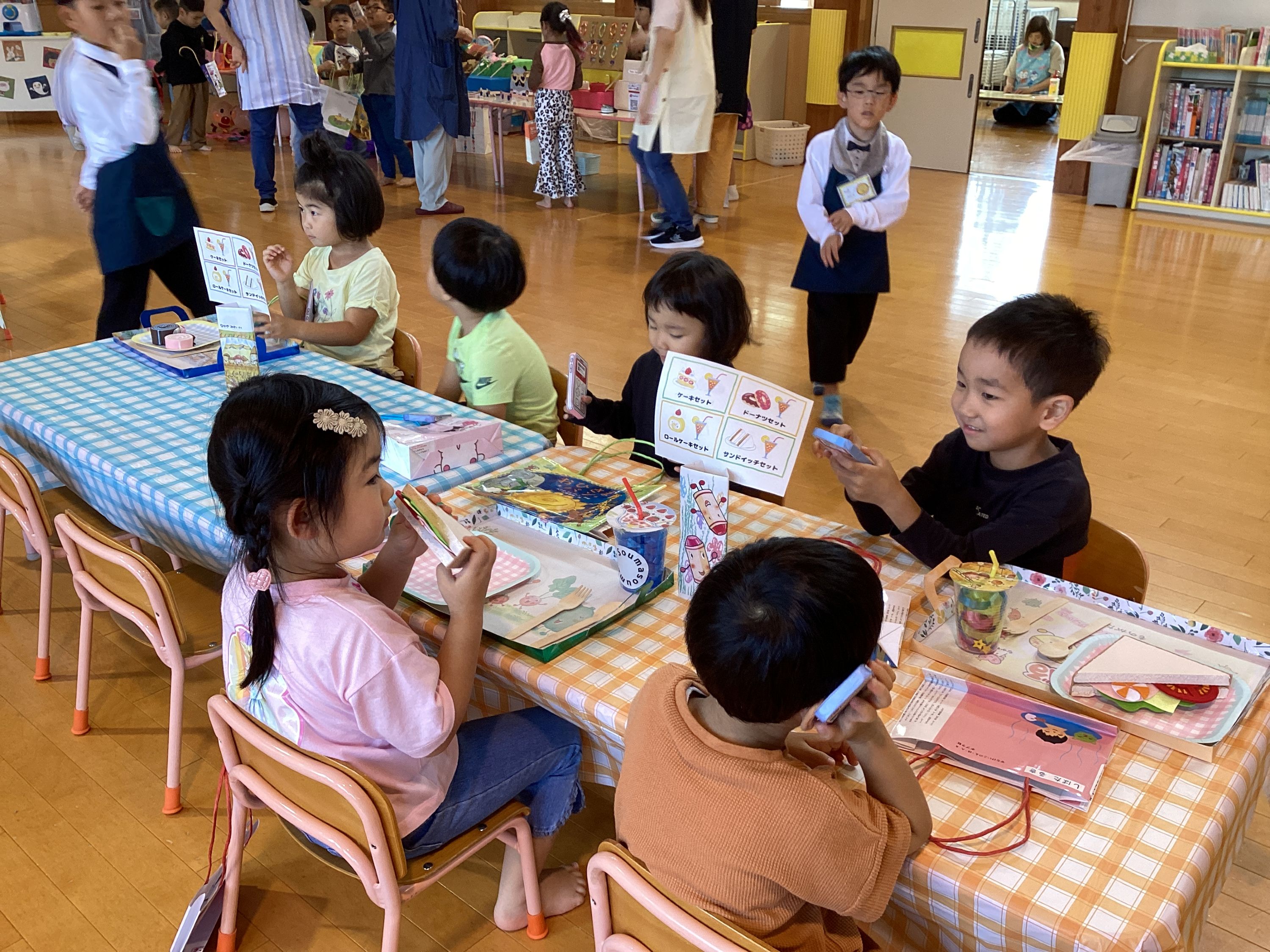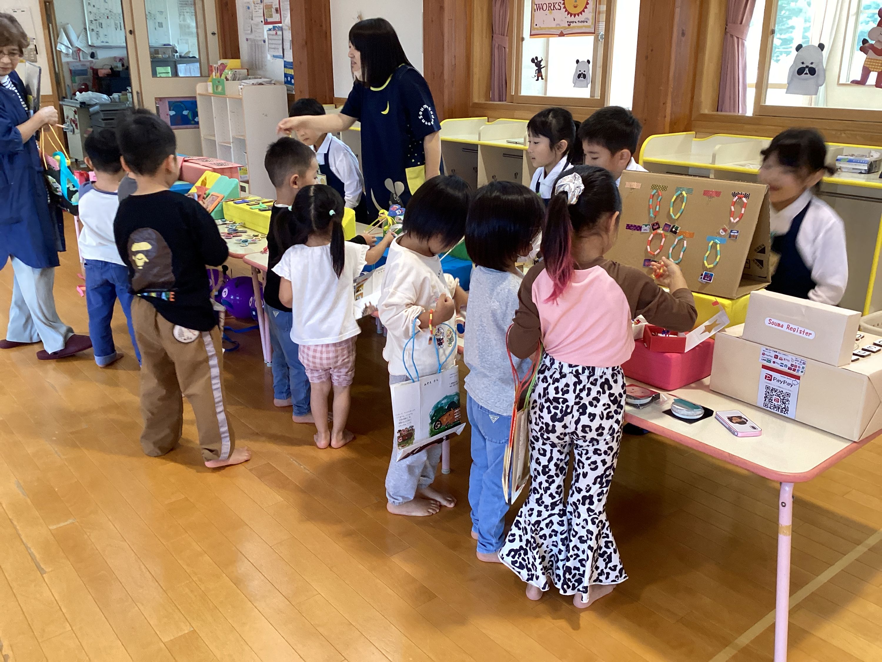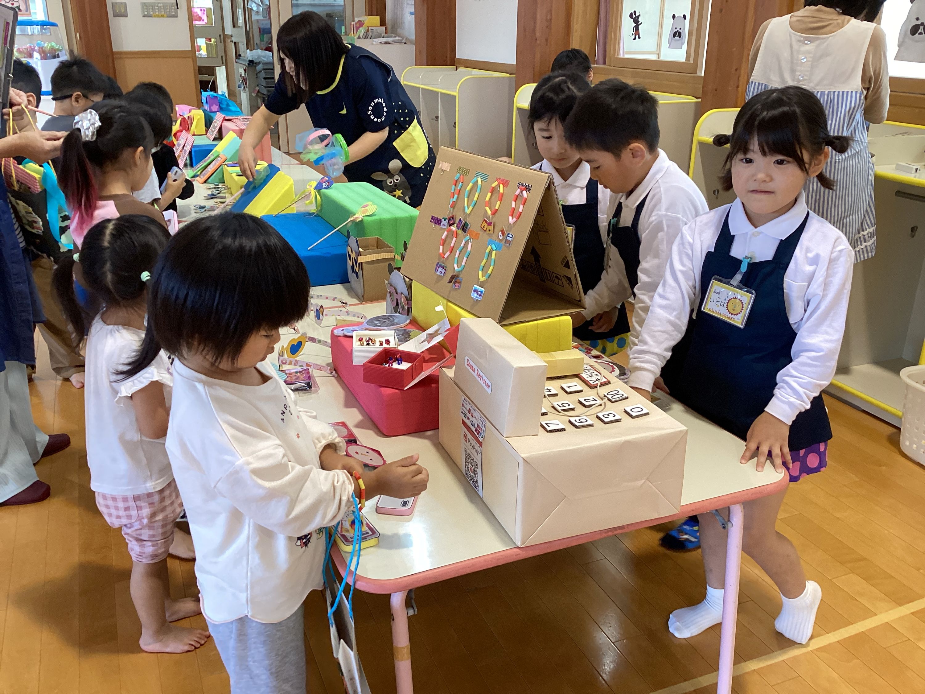 10月6日(月)「うれしーな!たのしーな!」でおなじみのショッピングモール『souma souma』がオープンしました。まずはじめにぞう組さんがお買い物スタートです。売り場は雑貨やさんとカフェコーナークラフトコーナー。スマホを片手に売り場を見て回り、お気に入り3点をペイペイでお支払い!次はカフェでドリンクとスイーツを注文。店員さんの様子を眺めながらトレイに商品をのせたり、ジュースをのせる動きを勉強しました。本物そっくりの品物に、思わず口に入れそうになる子も~!ひと息ついたら、今度はぞう組さんがお店の人になり、売り場にスタンバイ「いらっしゃいませ~、いかがですか~」とお客さんを呼び込みます。今度は、ぱんだ組さんときりん組のペアでお買い物スタート!手をつなぎながら、「これとこれ、あれ欲しい~」と会話を楽しみながらスマホにハンコを押してもらい、ペイペイ払いしてました。雑貨やさんでは(手鏡、サングラス、指輪、ブレスレット、コンパクト、ハートのステッキ、ハンドスピナー、虫とり網、剣、ツブツブタブレット)が並びカフェコーナーはサンドイッチやドーナツ、カップケーキ、ロールケーキなどのスイーツやカフェオレやジュースなどおいしそうな品が並んでいました。お買い物ごっこの後はフォトコーナーで写真撮影をして、クラフトコーナーで作ったフレームに入れてお持ち帰りしました。お家でも遊べる物がたくさんでしたね~またのお越しをおまちしています!そうだー!ガチャガチャも楽しかったね~!