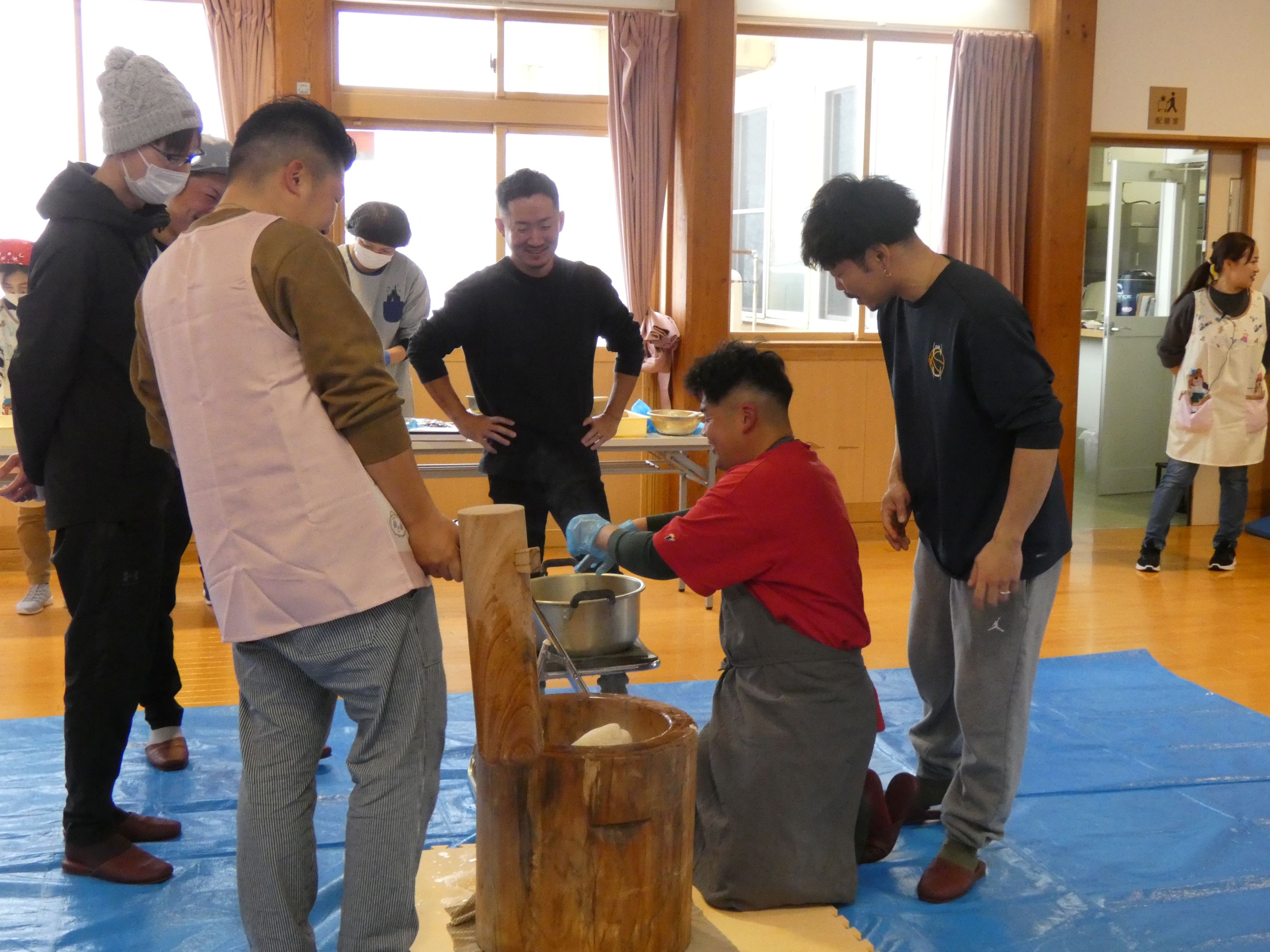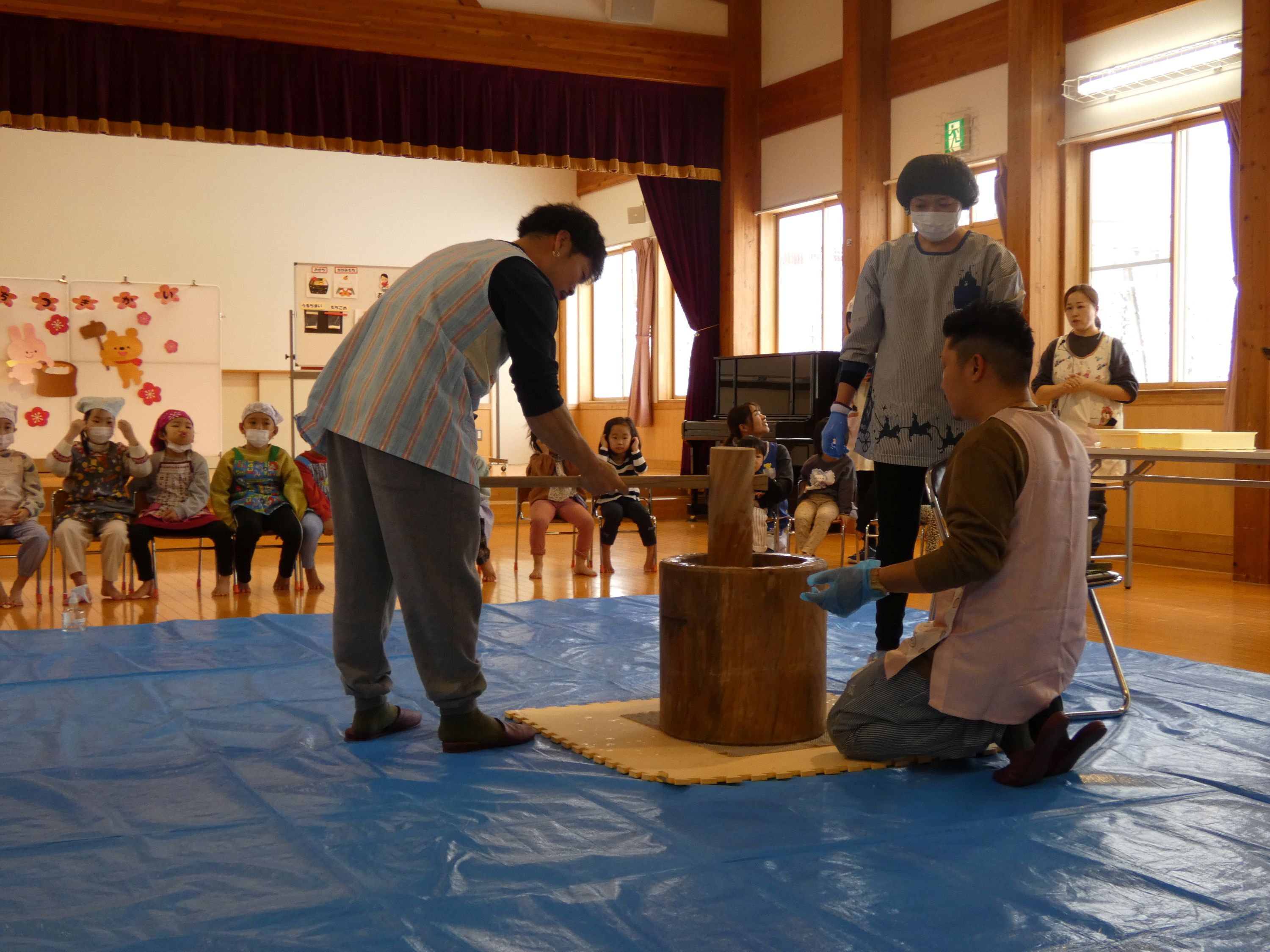 今日は2025年最後の行事、「もちつき会」でした。はじめは、食育集会です。「お正月の料理、おせちについて」のお話を聞き、それぞれの食材の由来を学びました。次は「餅について」お米の違いを目で確認し、「ちょっと白っぽいね」「大きさ違うよ」などの意見が出ていました。さあ!いよいよ「もちつき」のはじまりです。まずはもち米を寄付してくださり、もちつきにもお手伝いいただく、JA相馬村青年部の方に自己紹介をしていただきました。「あっ、○○くんのパパ~」と拍手した後は、みんなで「ありがとうございます。」のお礼と、「よろしくお願いします。」の挨拶をしました。それからすぐ、もち米のいい匂いが遊戯室に広がり、臼に投入され、素早く杵で潰していくと~あっという間につぶつぶ感がなくなりました。「ぺったん、ぺったん」と掛け声をかけて応援しているうちに「なんということでしょう~もちができあがりました~」青年部の方のあ・うんの呼吸で2回目もあっという間に~‼みんなで(あんこ、きなこ、さとうじょうゆ)の3つの味でいただきました。