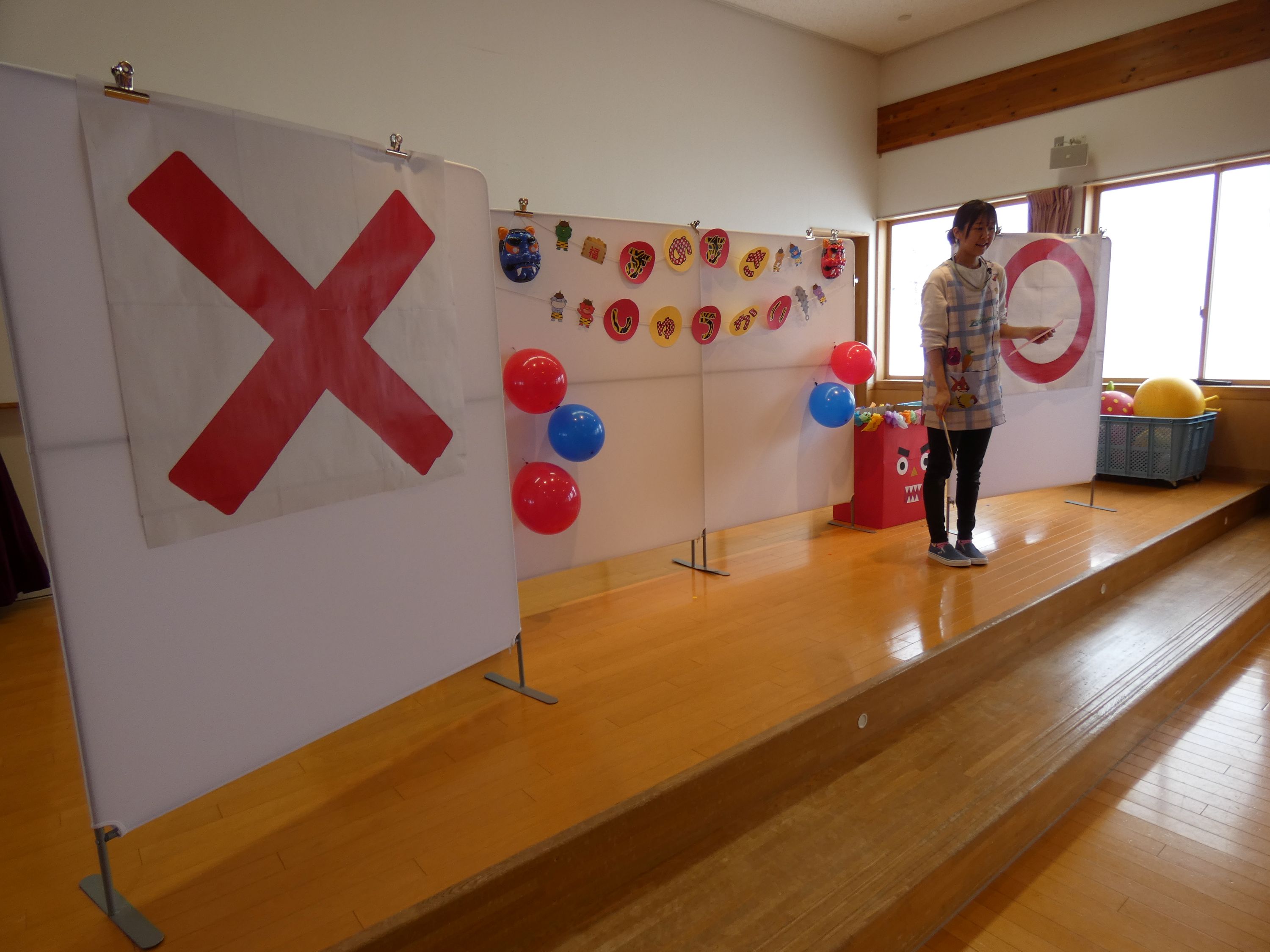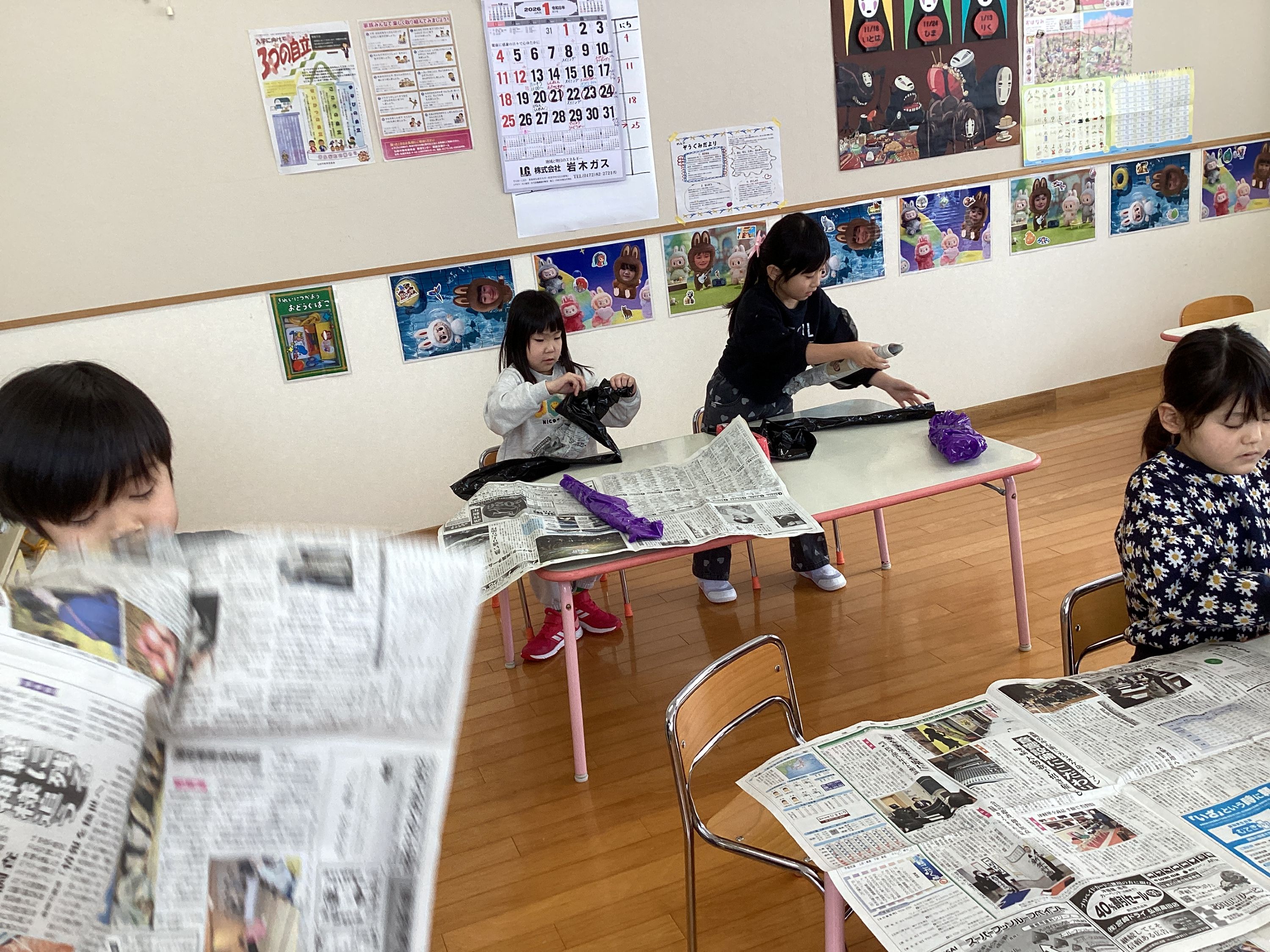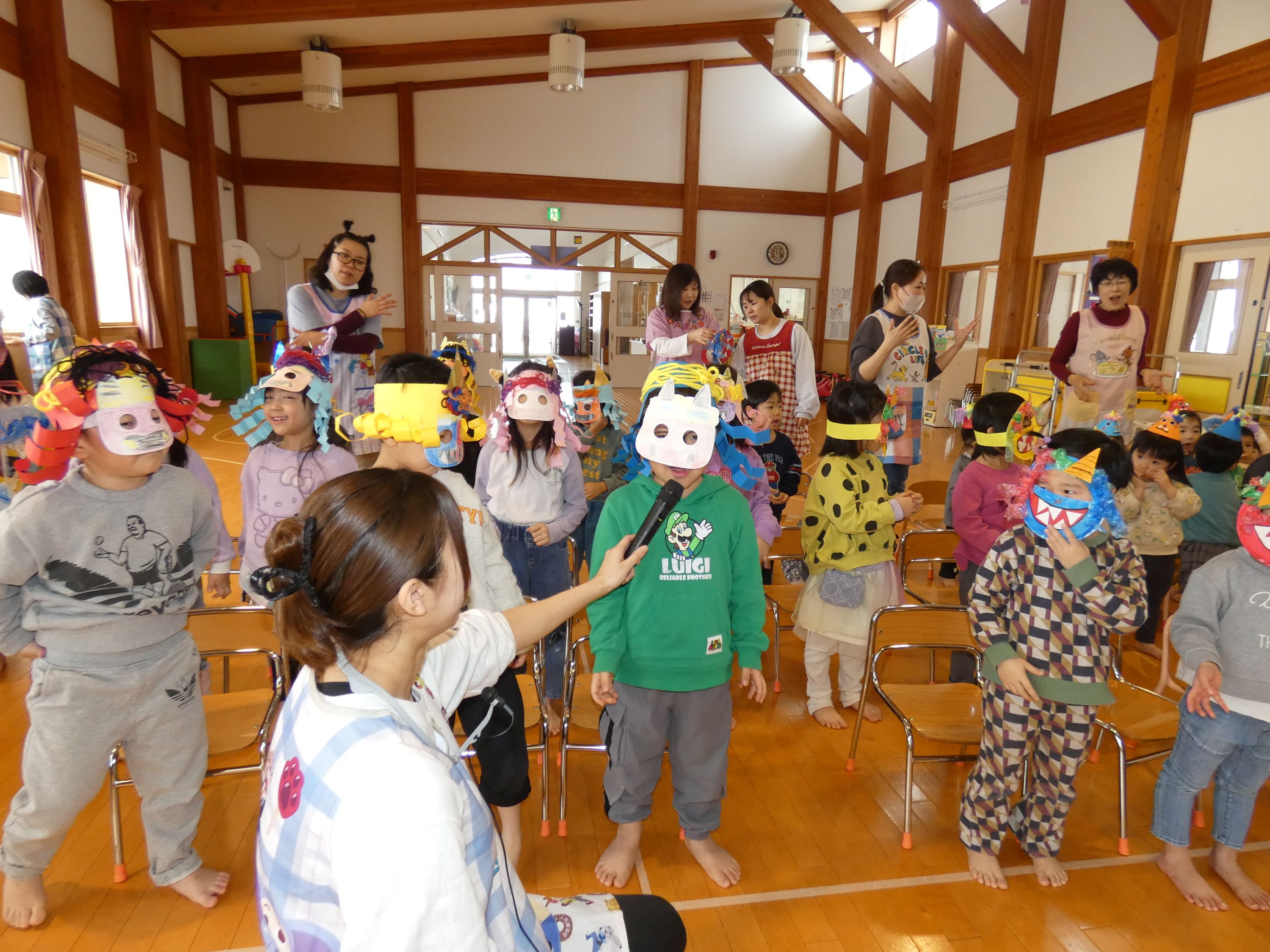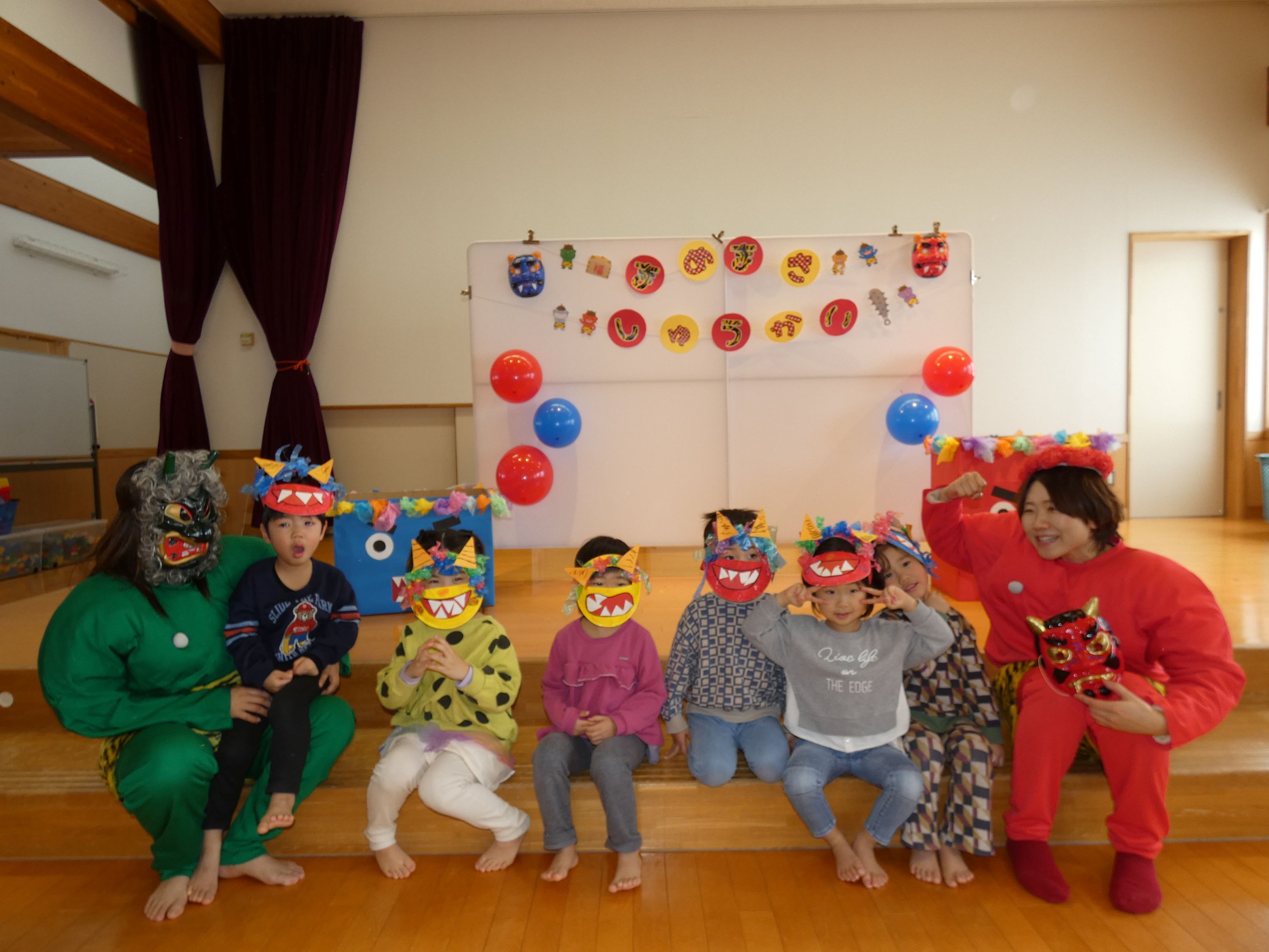 2月3日(火)は「豆まき集会」でした。自分で製作した自慢のお面をつけて、遊戯室に集合!クラスの代表がステージに上がり、「ここが難しかった」「切るのを頑張った」など作品紹介。次に「豆まき」「おにのパンツ」を元気にうたいました。♫はこう、はこうオニのパンツ!とノリノリでした。次は「節分にちなんだ○×クイズコーナー」問題をよく聞いて、○や×に移動し、年長さんは未満児さんの手を引いている、やさしい姿が見られました。そして次は、大きいお友達に見守られて、りす、こあら、うさぎ組は「鬼の玉入れ」、きりん、ぱんだ、ぞう組は男女に分かれて「鬼ごっこ」をしました。なんと!本物?先生鬼も参加し、オニ役のお友達がみんなを捕まえていました。最後は記念写真を撮って「はいポーズ!」みんな、自分の中の悪いオニをやっつけたかな?