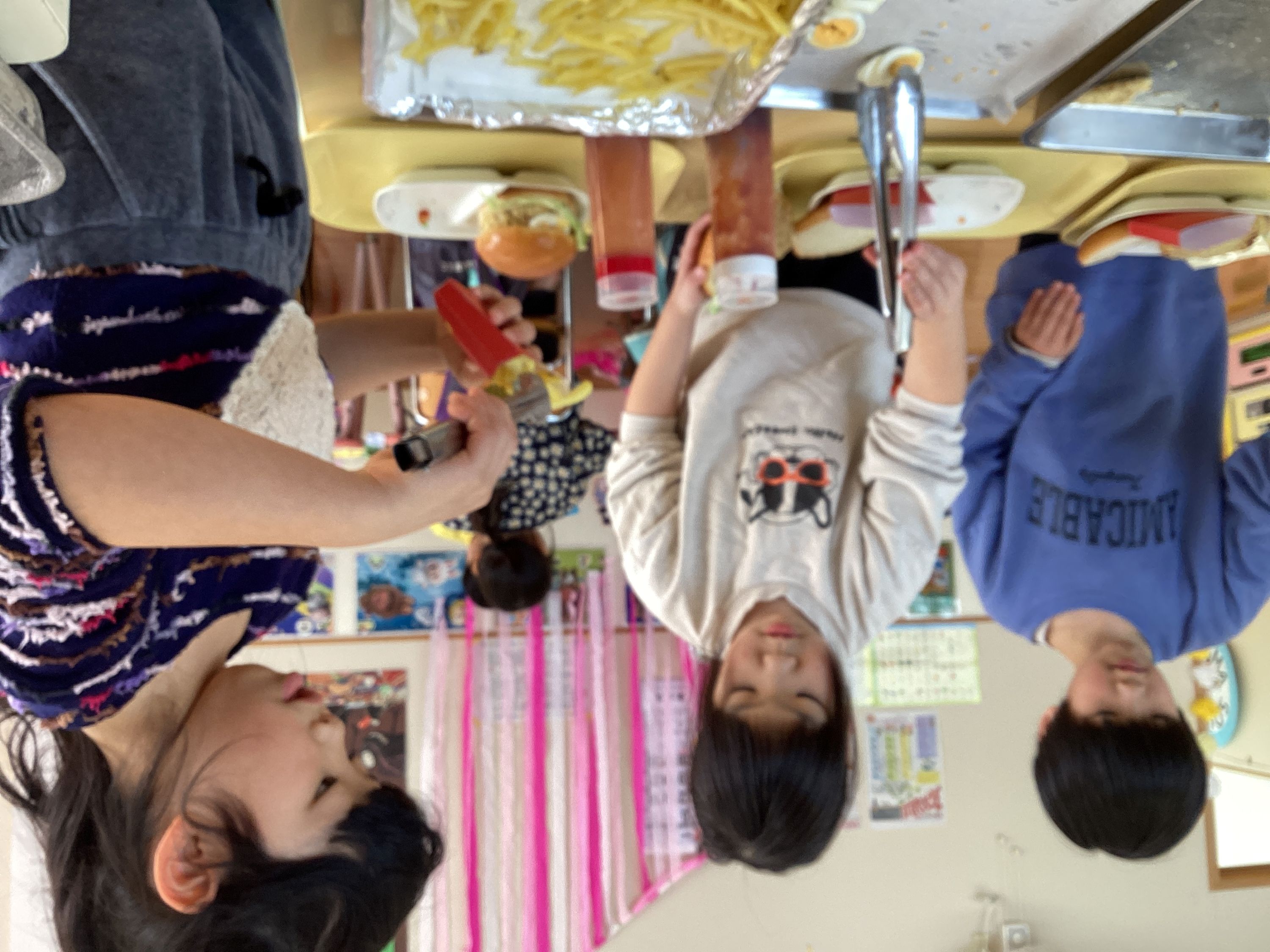 2月10日(火)は年長組の「お楽しみ会」でした。午前中は、「マリービスケットケーキ」をみんなでクッキング‼マリービスケットを牛乳に浸して、クリームを挟んで何層にも重ねていきました。「これ、お家でやりたい!」「ママに教えよう~」など楽しい会話が聞かれました。仕上げは美味しそうないちごをのせて、冷蔵庫で冷やして午後のおやつの時間を待つことに~!クッキングの後は、先生たちの顔を似顔絵にしてカードを作って、「にがおえビンゴ」で盛り上がりました。そして、楽しみにしていた給食!なんとぞう組さんだけの特別メニュー(Mのマークのハンバーガーとポテト、ジュース)セルフでバンズにレタスとチーズハンバーグ、ゆで卵、オリジナルソースをかけてはさんでいきました。バンズが顔くらいの大きさでしたが、みんな残さず完食でした。おいしかったね!また思い出になればうれしいなぁ~