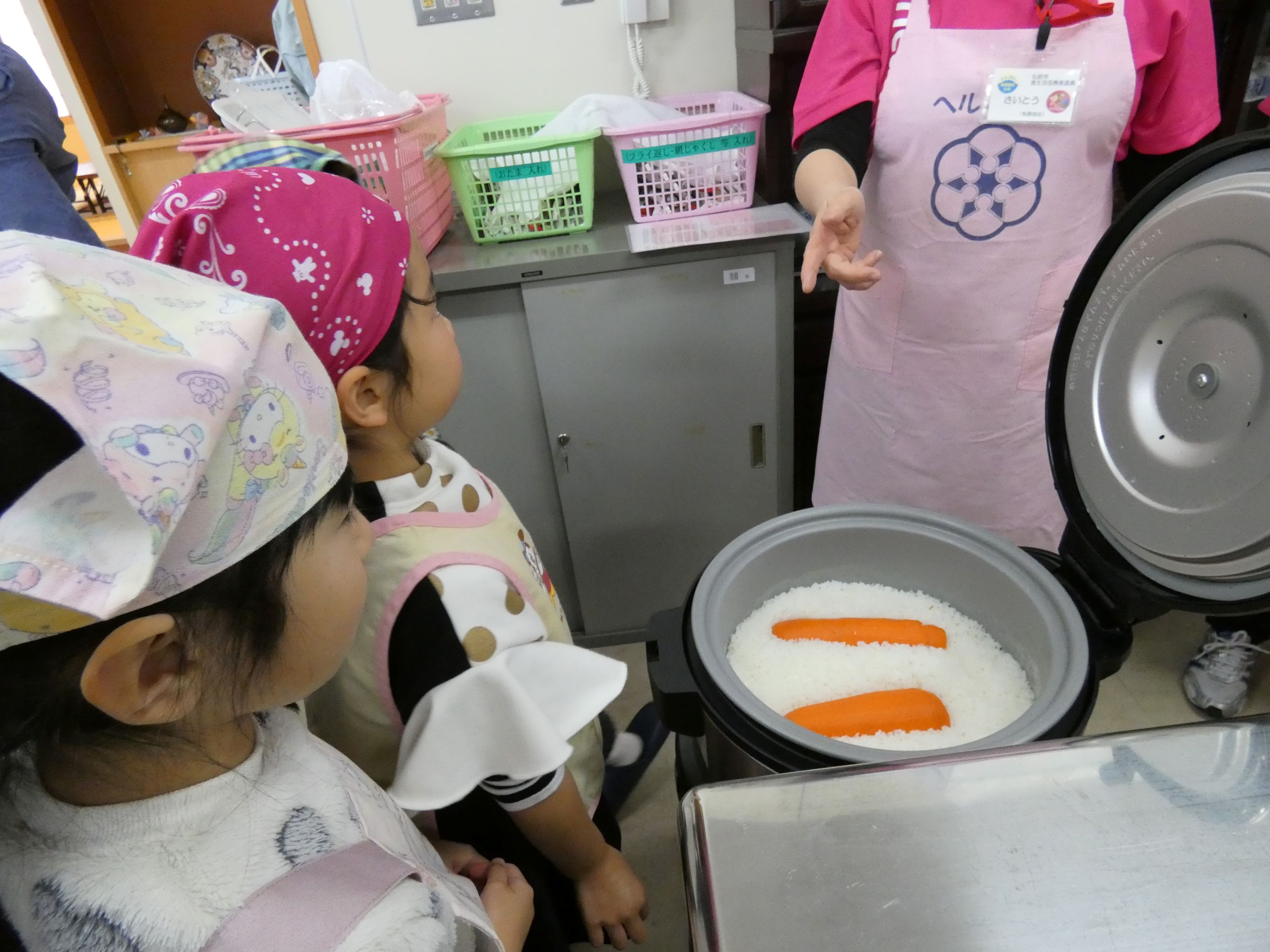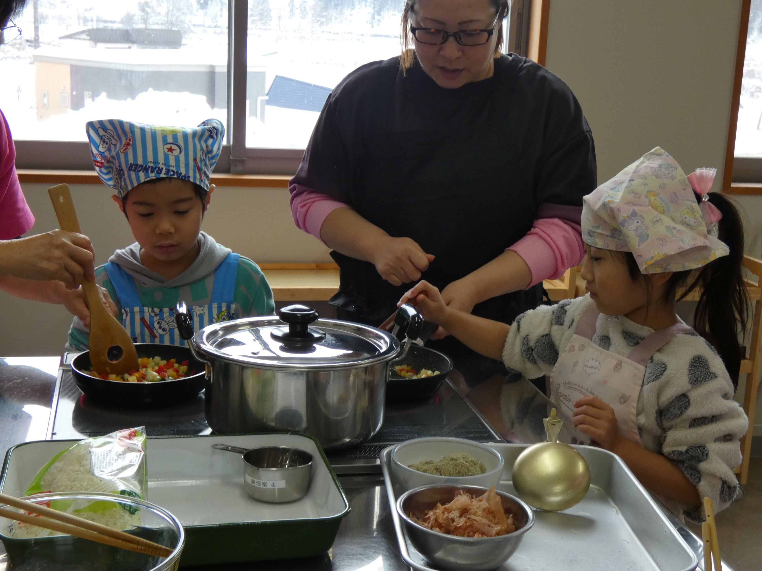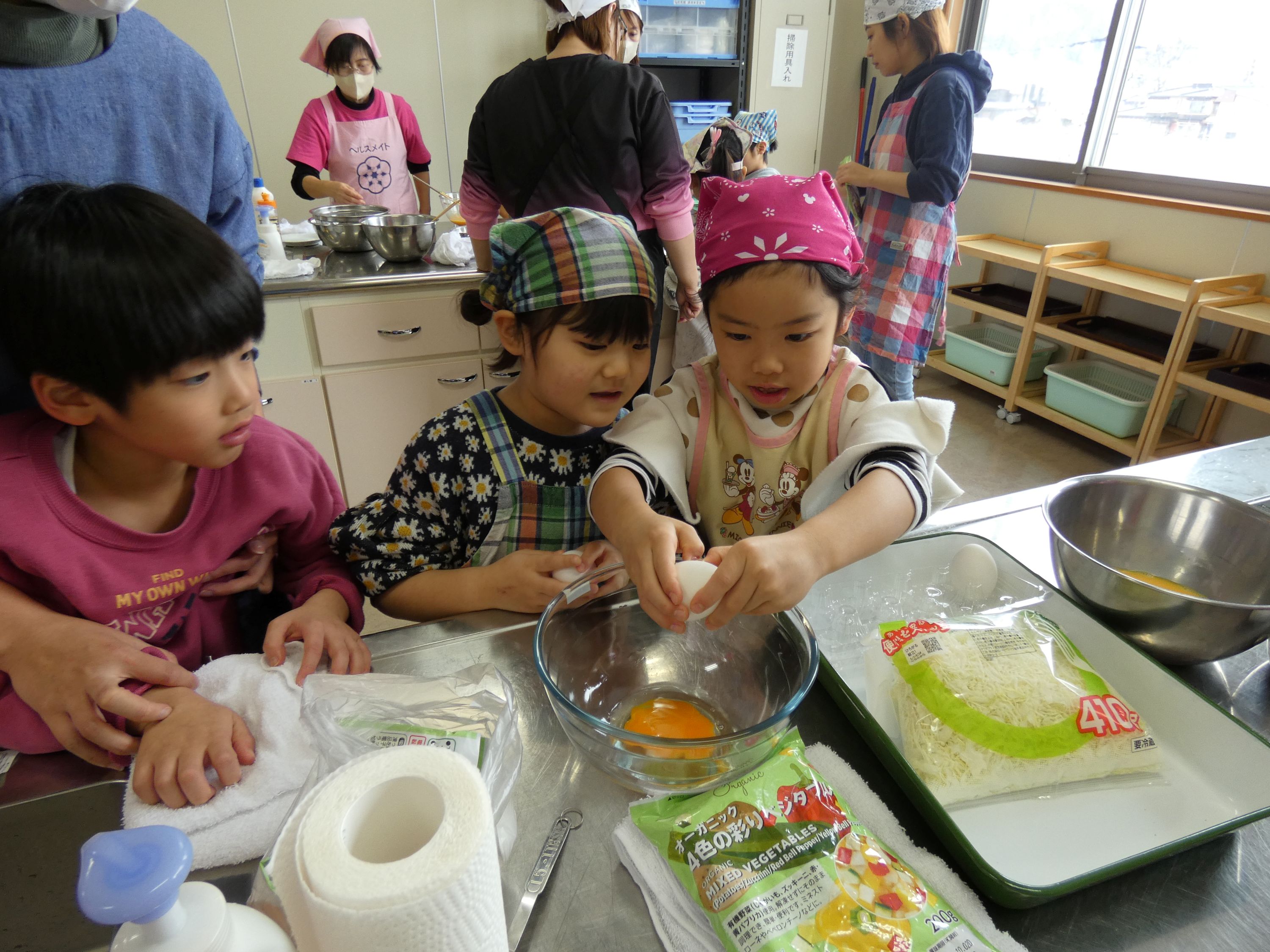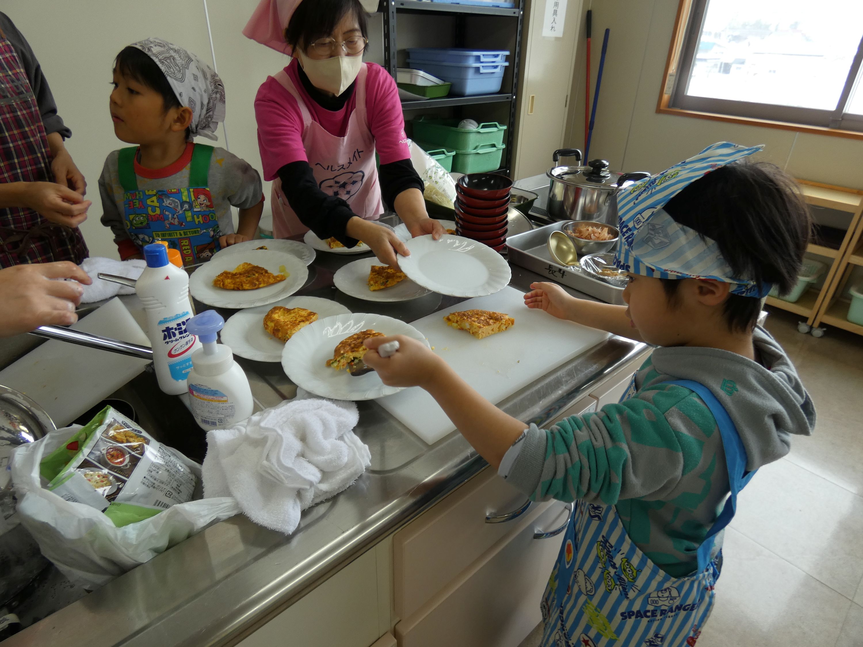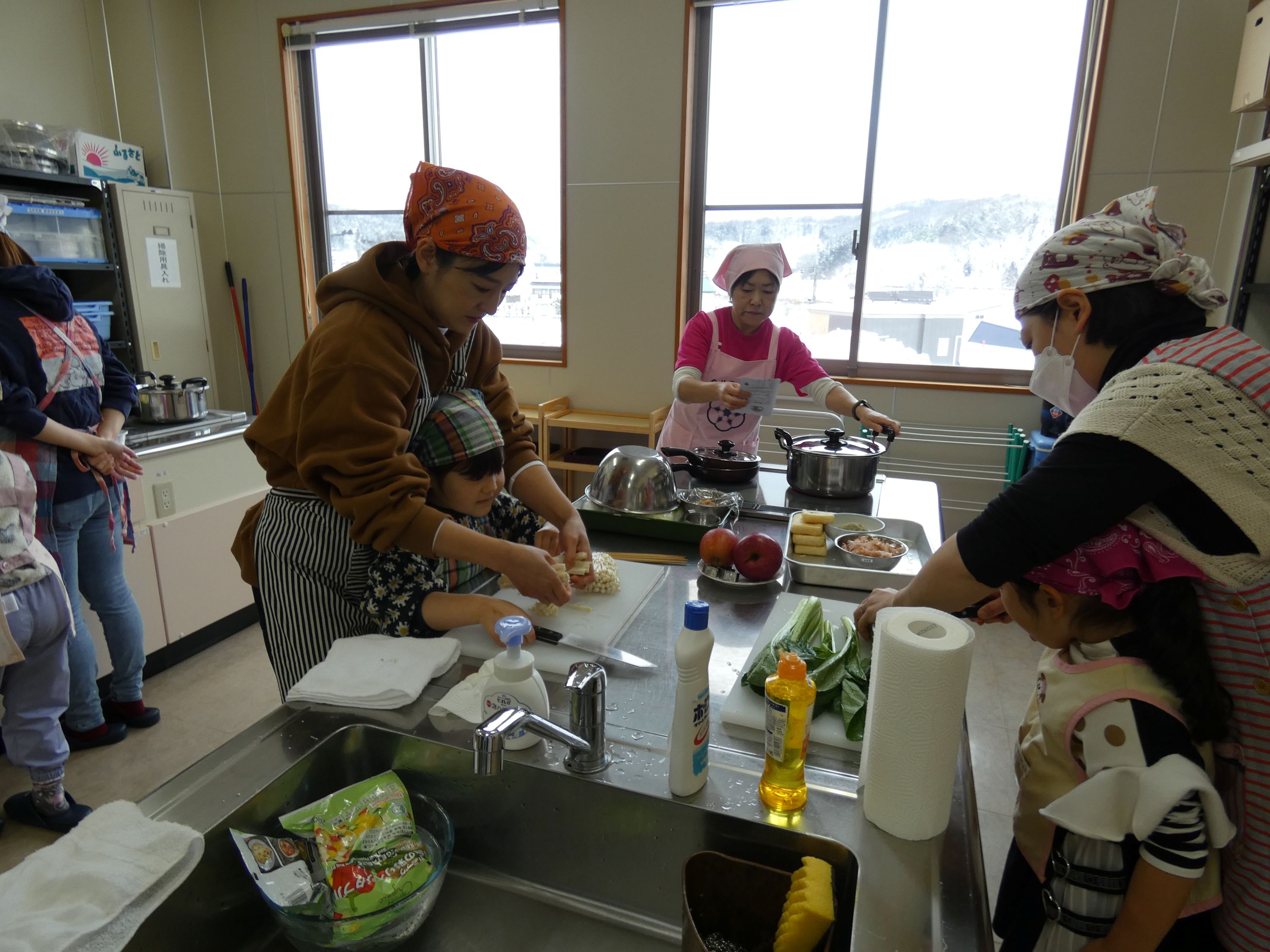 1月10日(土)は弘前市相馬総合支所民生課主催の令和7年度相馬地区まるごと健康塾「食育教室」にぞう組さんが親子で参加しました。はじめに弘前市食生活改善委員会の講話を聞き、「朝ごはんの大切さ」を学びました。次に調理室に移動して調理実習です。メニューは(にんじんご飯、ジャーマンオムレツ、小松菜のみそ汁、りんご)親子でエプロン、三角巾を身に着け準備OK!はじめに、みそ汁の具材を切って鍋に入れて~。次は卵を割って~など次々作業を進めていきました。お家でもお手伝いしている子はビックリするくらい手際がよかったです。最後は和室に移動してみんなで食事会。自分で作った食事は格別のようでした。食生活改善員の皆さま、お世話になりました。楽しく食育を学ぶことができました。ありがとうございました。