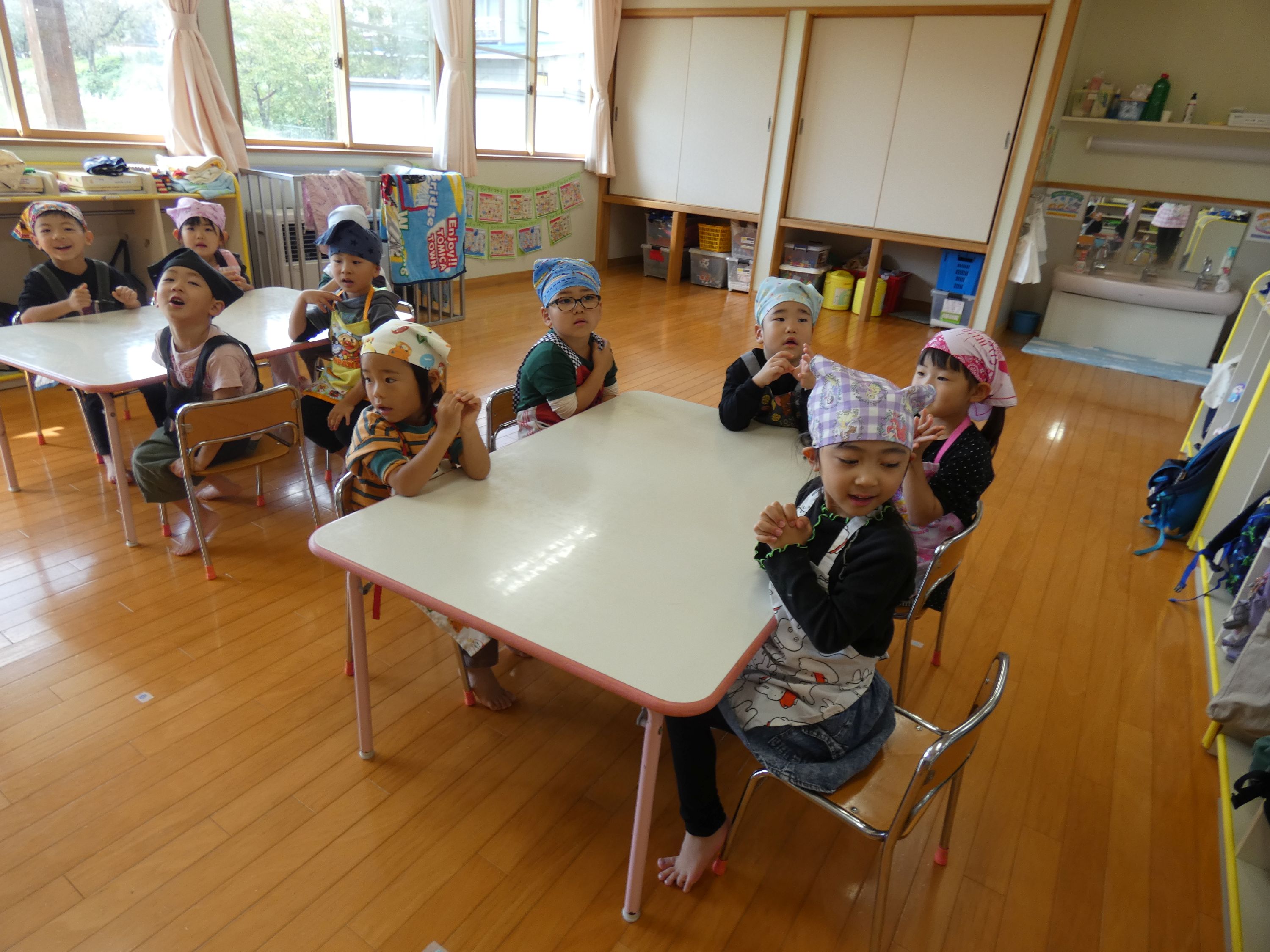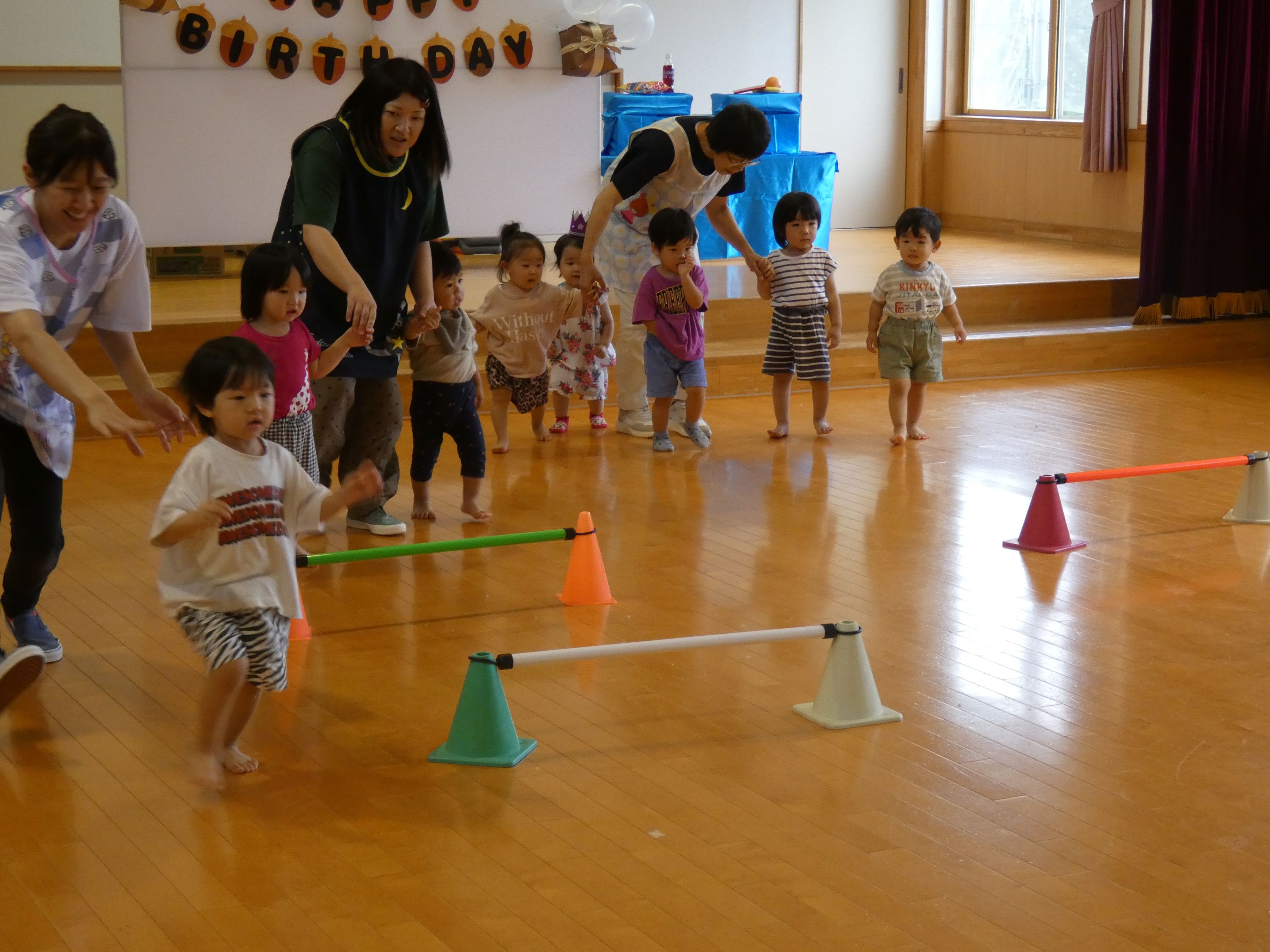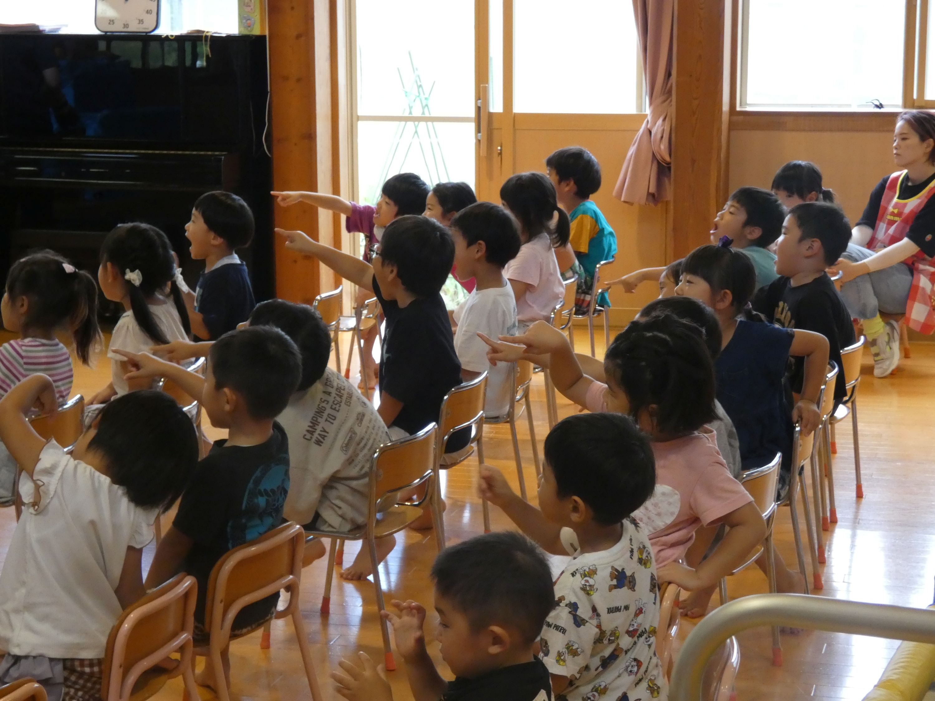 9月17日(水)は9月生まれのお友達の誕生会でした。お面を着けて登場した誕生児!集まったみんなからのリクエストで一人ずつお面を外して紹介していきました。プレゼントをクラスのお友達から受け取って、ニコニコ笑顔!「拍手をプレゼント」のうたでお祝いしてもらいました。歌の後はステージ前のスペシャル席に移動して「マジックショー」のはじまりです。不思議な紙袋に「チチンプイプイーのエイ!」と呪文をかけると、空っぽの紙袋から出てきたのは~牛乳、バナナやポテトチップス、ジュースにオレンジなど不思議な不思議な紙袋でした。終始「なんで?」「どこから出てきたの?」と声が聞こえ集中して見入っていました。マジックショーの後は身体を動かすゲーム!小さいクラスはりんごの木を目指して走り、収穫してゴール!大きいクラスは、赤組白組に分かれてみんなで「果物運びリレー」勝ったのは白組でした。給食は(くりデコおにぎり、鶏のから揚げ、マッシュきのこ、ふわふわ汁、たべっこカラフルゼリー」でした。
