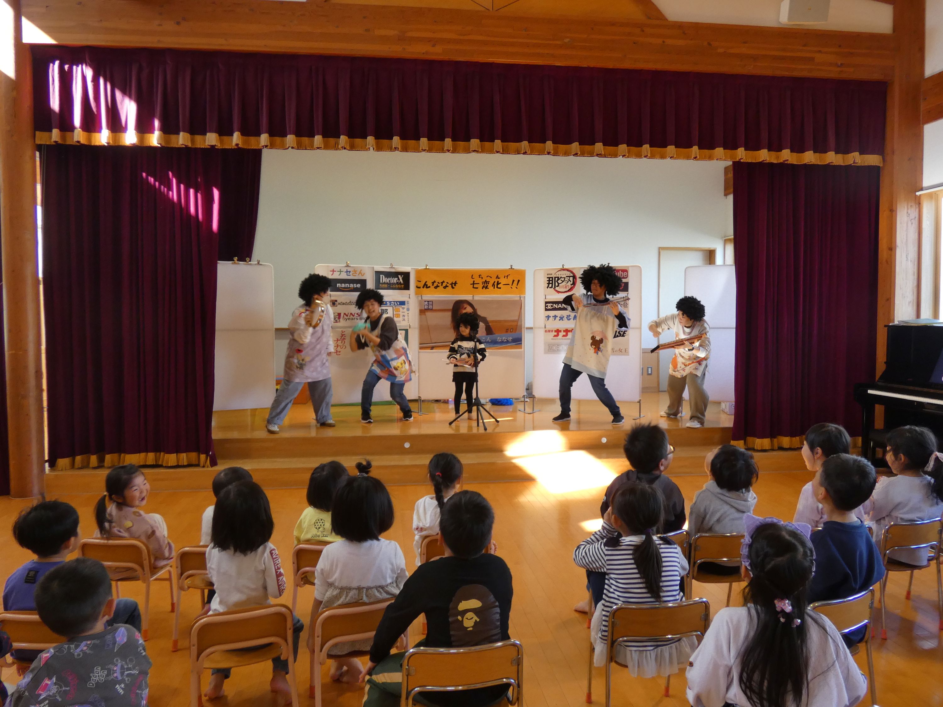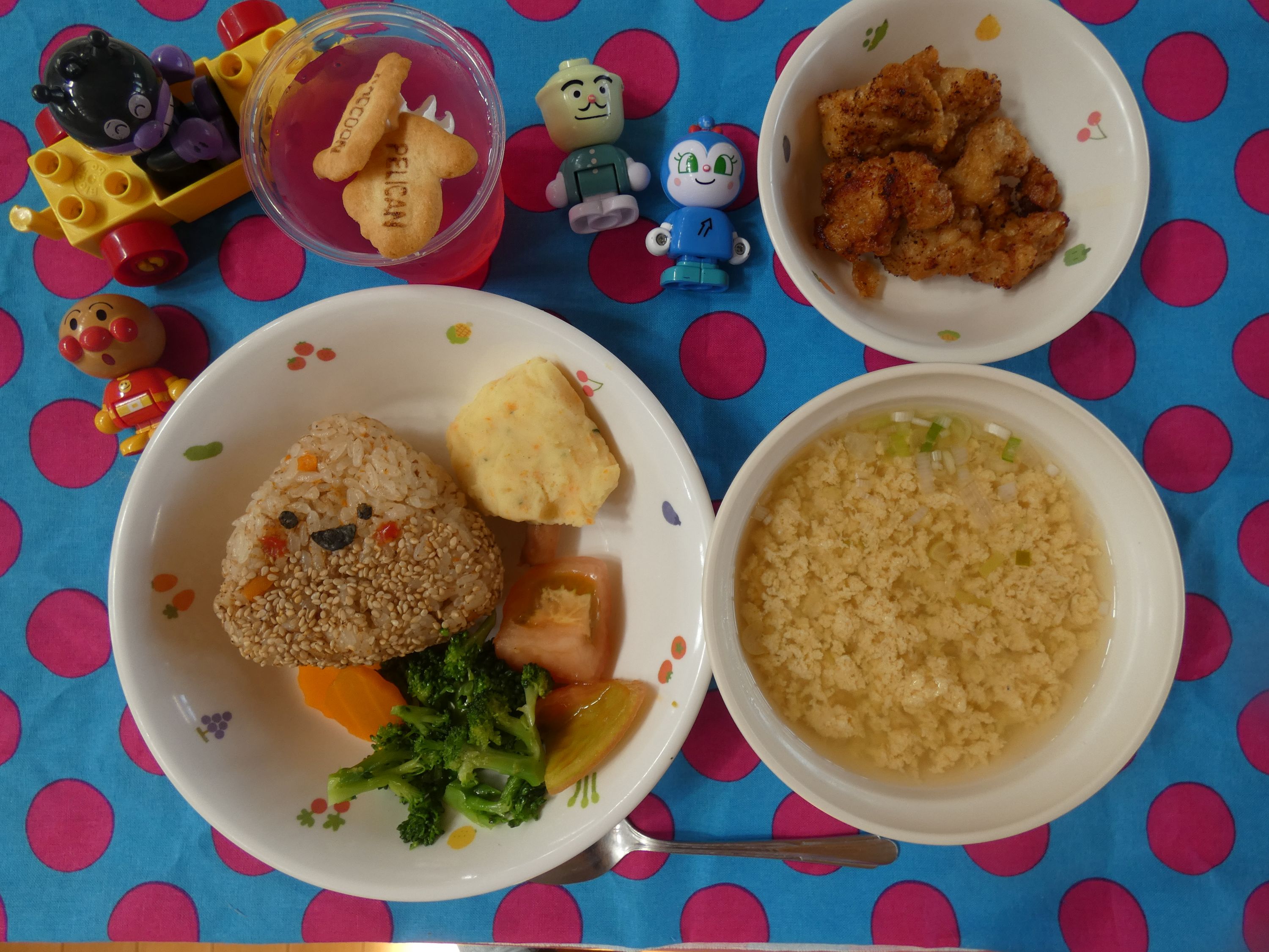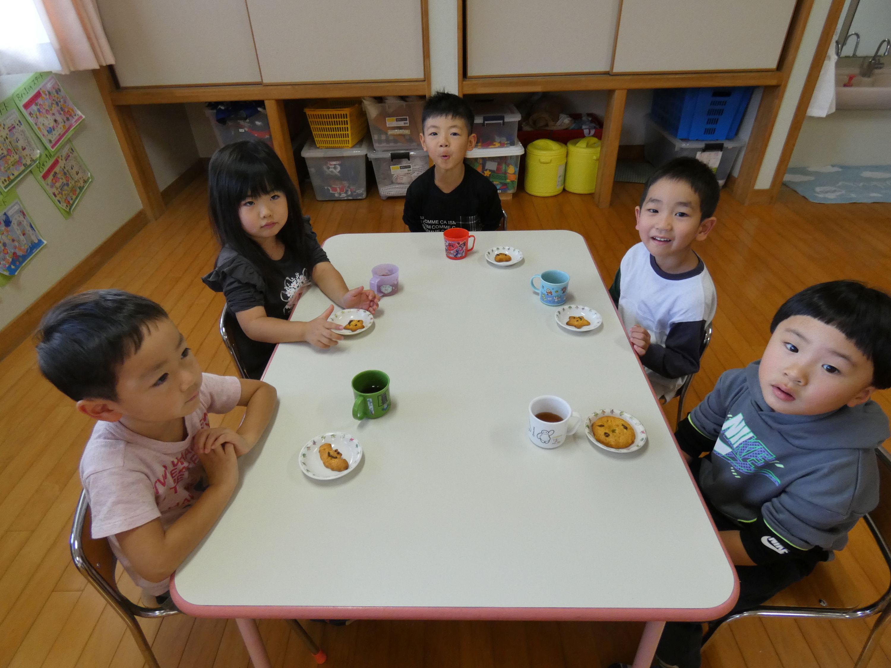 9月17日(水)は9月生まれのお友達の誕生会でした。お面を着けて登場した誕生児!集まったみんなからのリクエストで一人ずつお面を外して紹介していきました。プレゼントをクラスのお友達から受け取って、ニコニコ笑顔!「拍手をプレゼント」のうたでお祝いしてもらいました。歌の後はステージ前のスペシャル席に移動して「マジックショー」のはじまりです。不思議な紙袋に「チチンプイプイーのエイ!」と呪文をかけると、空っぽの紙袋から出てきたのは~牛乳、バナナやポテトチップス、ジュースにオレンジなど不思議な不思議な紙袋でした。終始「なんで?」「どこから出てきたの?」と声が聞こえ集中して見入っていました。マジックショーの後は身体を動かすゲーム!小さいクラスはりんごの木を目指して走り、収穫してゴール!大きいクラスは、赤組白組に分かれてみんなで「果物運びリレー」勝ったのは白組でした。給食は(くりデコおにぎり、鶏のから揚げ、マッシュきのこ、ふわふわ汁、たべっこカラフルゼリー」でした。