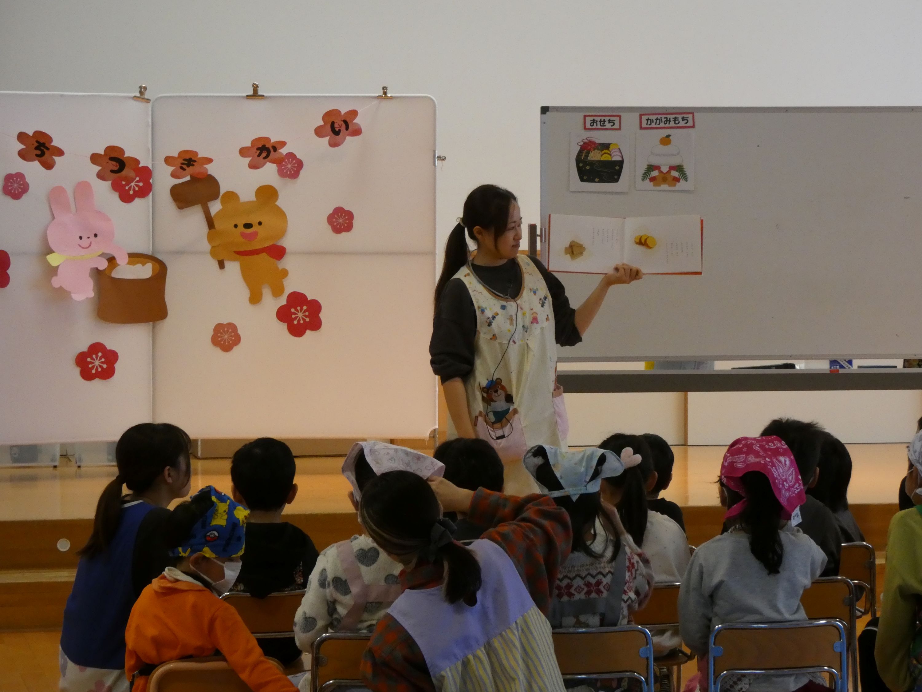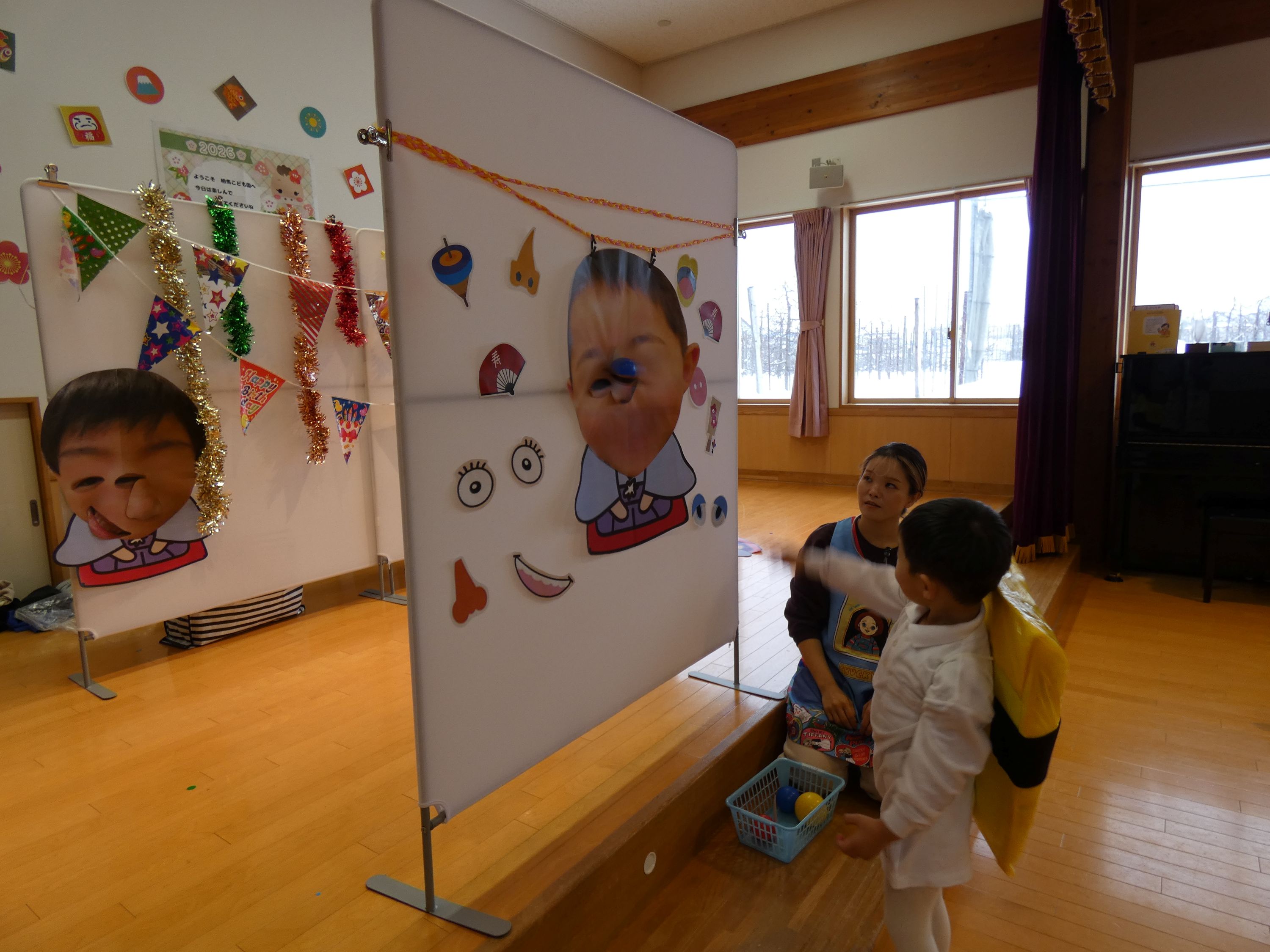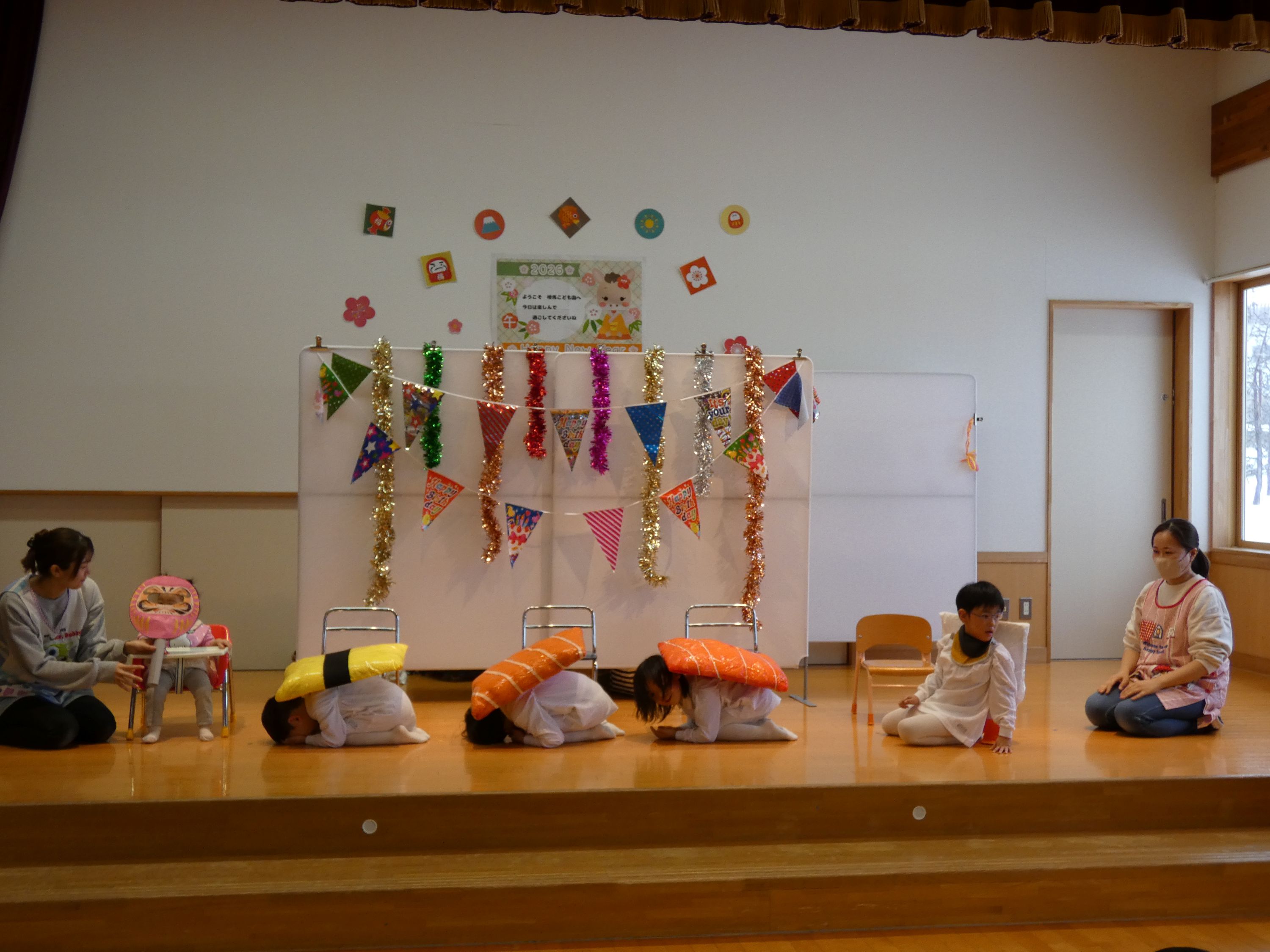 1月16日(金)は1月生まれのお友達のお誕生会でした。最初は幕が閉まっていたステージ。幕が開くとそこには~!お寿司になりきった誕生児たち!好きな寿司ネタになって登場し、みんなビックリでした。寿司ネタで呼ばれると、「ハーイ」と返事をして少し照れながらも名前と仲良しの友達を発表してくれました。プレゼントをもらって、全員で「拍手をプレゼント」の歌をうたい、次は「ふくわらい」のコーナーです。誕生児の顔のパーツをボールにつけて投げ、当たったところに貼っていき、目、鼻、口、など次々できていきました。自分の顔ができると不思議な表情になる子も、、、、。大きな福笑いの出来上がりです。そしてお待ちかねのゲームコーナーは「みんなでかるた大会」です。アンパンマンかるたを2組準備して以上児さんも未満児さんも一緒に参加しました。最高枚数は11枚でした。同時にタッチしても、すぐにじゃんけんして勝敗を決めたり、譲りあいの場面も見られ、楽しいひとときとなりました。給食は(キャロットライス、うまハンバーグ、ポテトサラダ、オムレツ、キャベツのスープ、りんごのコンポート)でした。みんなモグモグ、モリモリ食べていましたね!うまかったね!馬だけに、、、、。