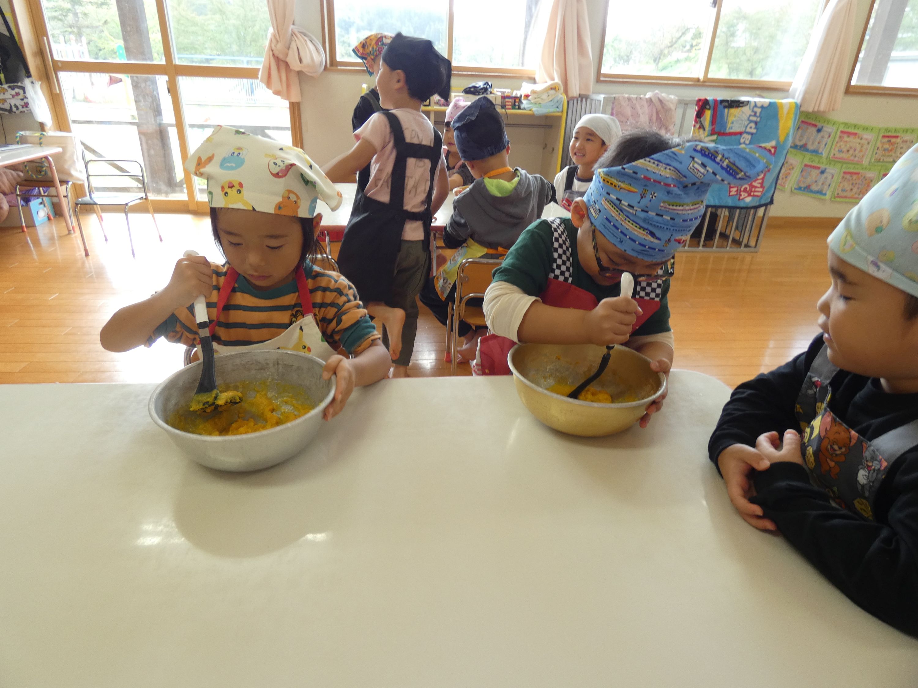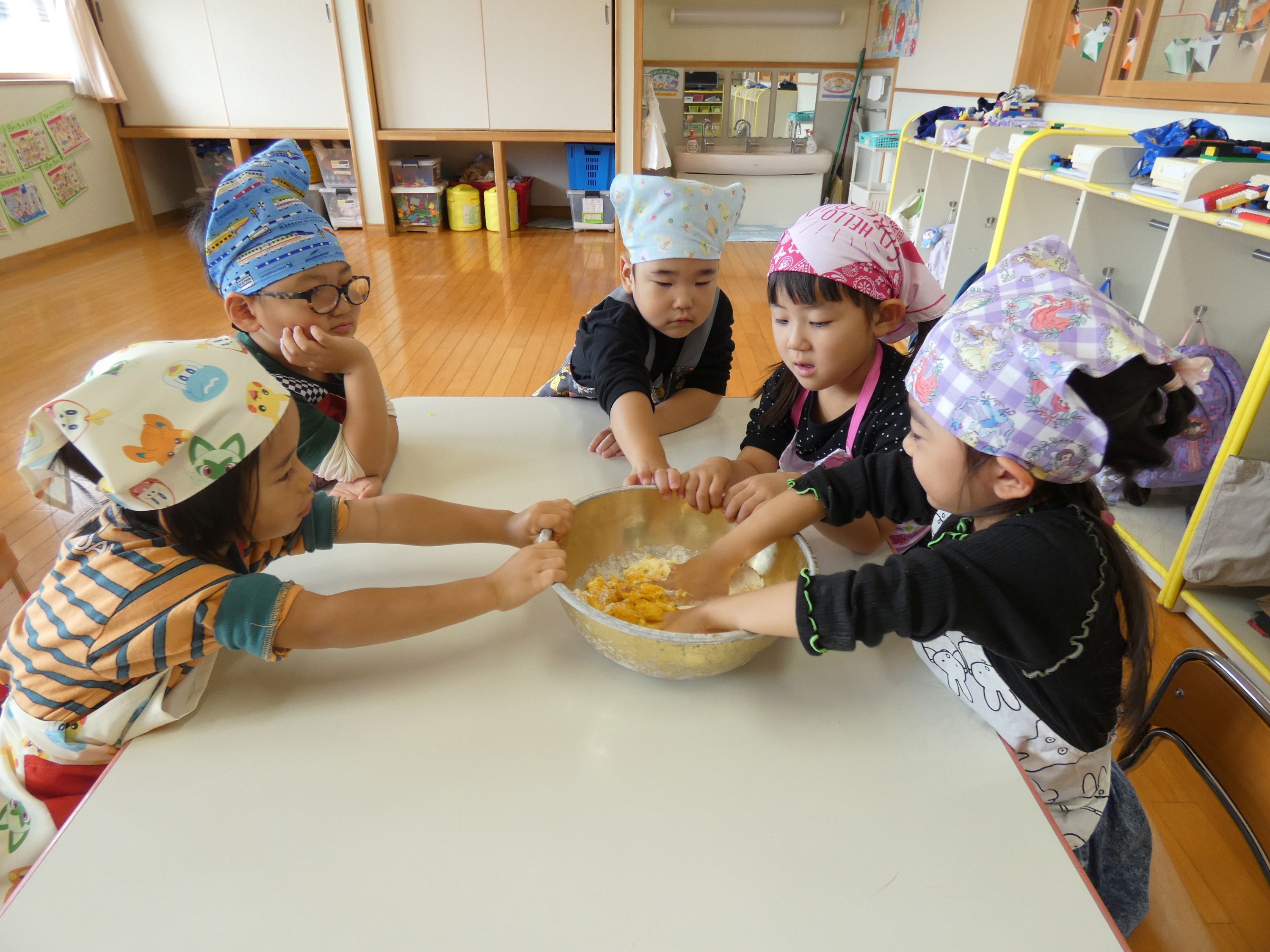 ぱんだ組さんは先日、ハロウィンにちなんだ「かぼちゃクッキー」を作りました。お家の方に準備してもらったエプロンと三角巾を身に着け、手をきれいに洗って準備OK!給食の先生のお話をみんな真剣な顔で聞いていました。まずは、かぼちゃを順番につぶしていきます。次は粉をまぜて~コネコネ!伸ばしたら、クッキー型で型抜きです。いつもはおしゃべりなお友達も無口になり、自分で選んだ型で生地を抜いていました。お昼寝の時間にオーブンで焼いてもらい、午後のおやつの時間にチョコペンで目や口などつけて出来上がり。事務室の先生たちにも「食べてくださいね」と届けにいきました。「わ~可愛い‼誰作ったの?」と質問攻めになり、ちょっぴり恥ずかしそうでした。最後はみんなで牛乳と一緒にいただきまーす!いつもより数倍おいしいおやつの時間でした。