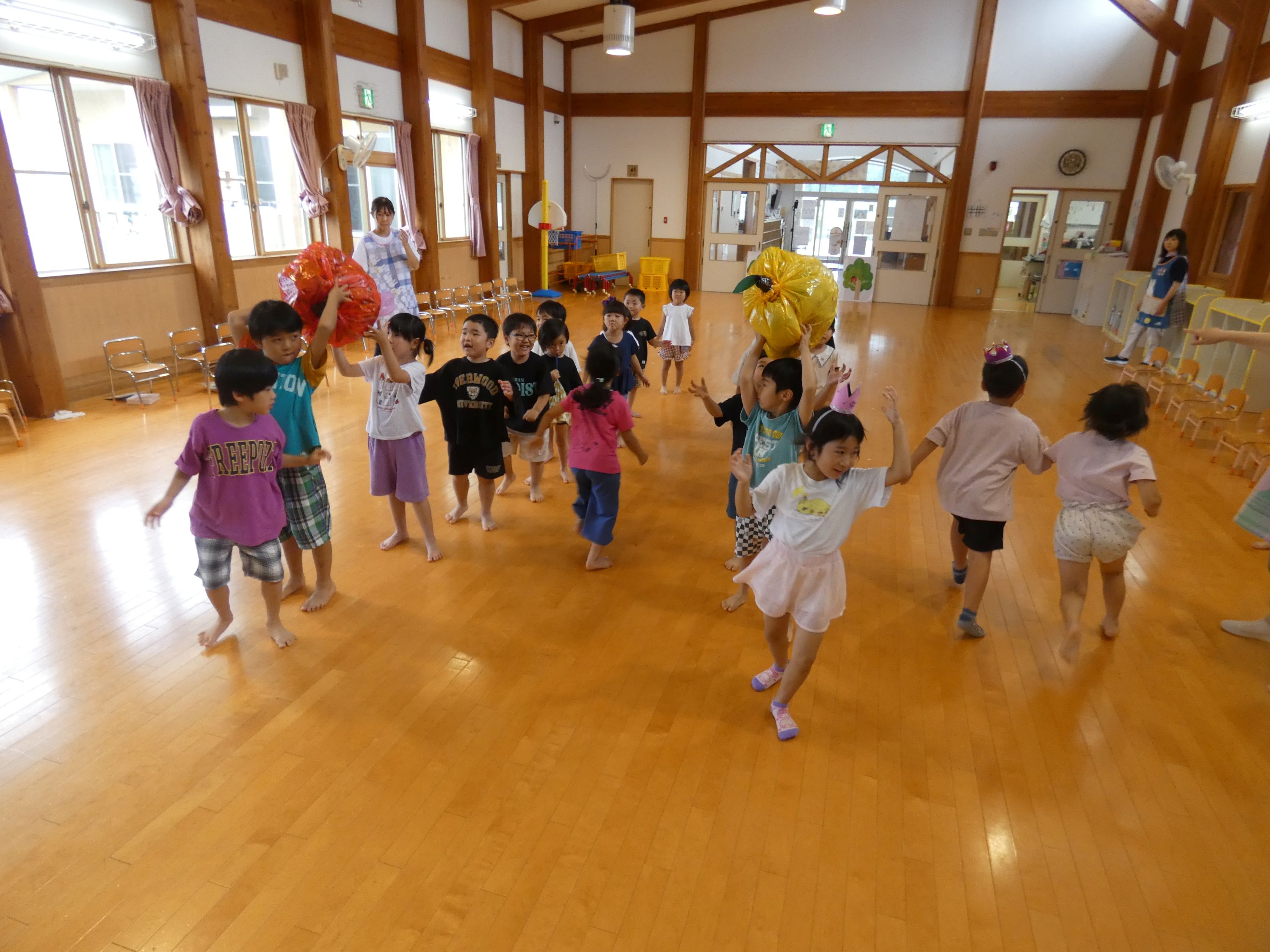 7月22日は相馬地区社会福祉協議会の田中さんと婦人部の方7名合計8名のお客様を迎えて、「夏祭り(ねぷたごっこ)」を開催しました。まず初めに、職員の笛、年長組の9名による「ねぷたの太鼓」に合わせてみんなで遊戯室を練り歩きました。子どもたちは、自分で作った金魚ねぷたを持って、「ヤーヤドー!」と掛け声をかけ、お祭りへの期待感いっぱいでした。婦人部の皆さんは「わー!かわいいの~」と目を細めて見て下さり、「いいもの見せてもらった」と喜んでいらっしゃいました。