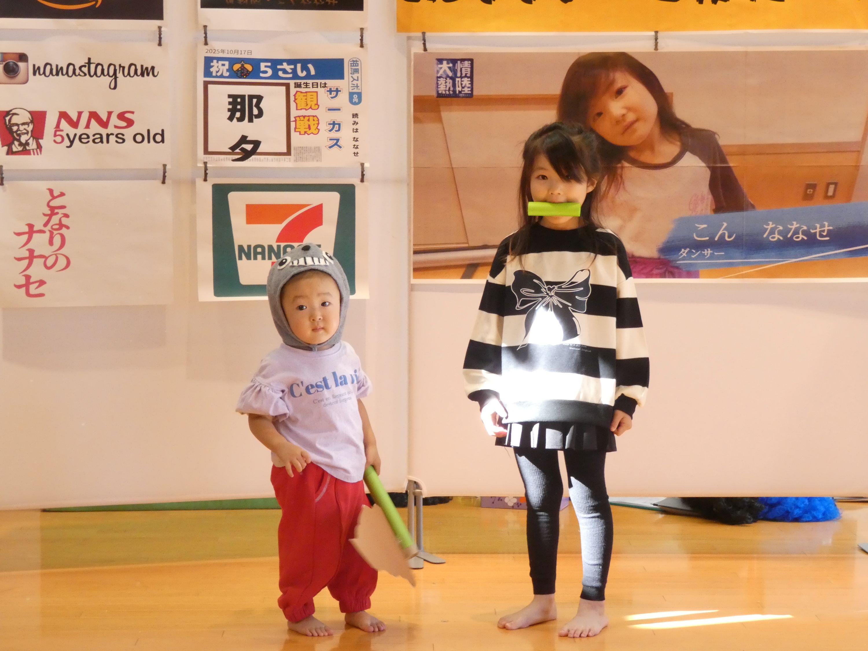 冬の足音が聞こえてきた10月24日(金)は10月生まれの誕生会でした。なんと!今月は年中児さんただ一人~!ということで、舞台で七変化してもらう企画です。舞台にはいろいろな協賛企業の名前がずらりと並びました。まず初めはドレスで登場!自己紹介をして次々衣装をチェンジー!途中、特別ゲストの妹ちゃんも登場して一人でも楽しめるようにそして、見ているお友達も楽しみながら、お祝いしてくれました。プレゼントをもらい、みんなでお誕生日のうたを歌った後は、31日に予定している「ハロウィン集会」の飾り付けをみんなでしました。子どもたちは意欲的に「ここに貼りたい!」「もう少し上!」など意欲的に参加して、遊戯室はすっかりハロウィンになりました。集会が楽しみですね。給食はピラフ、ロールキャベツ、かぼちゃサラダ、フルーツポンチでした。